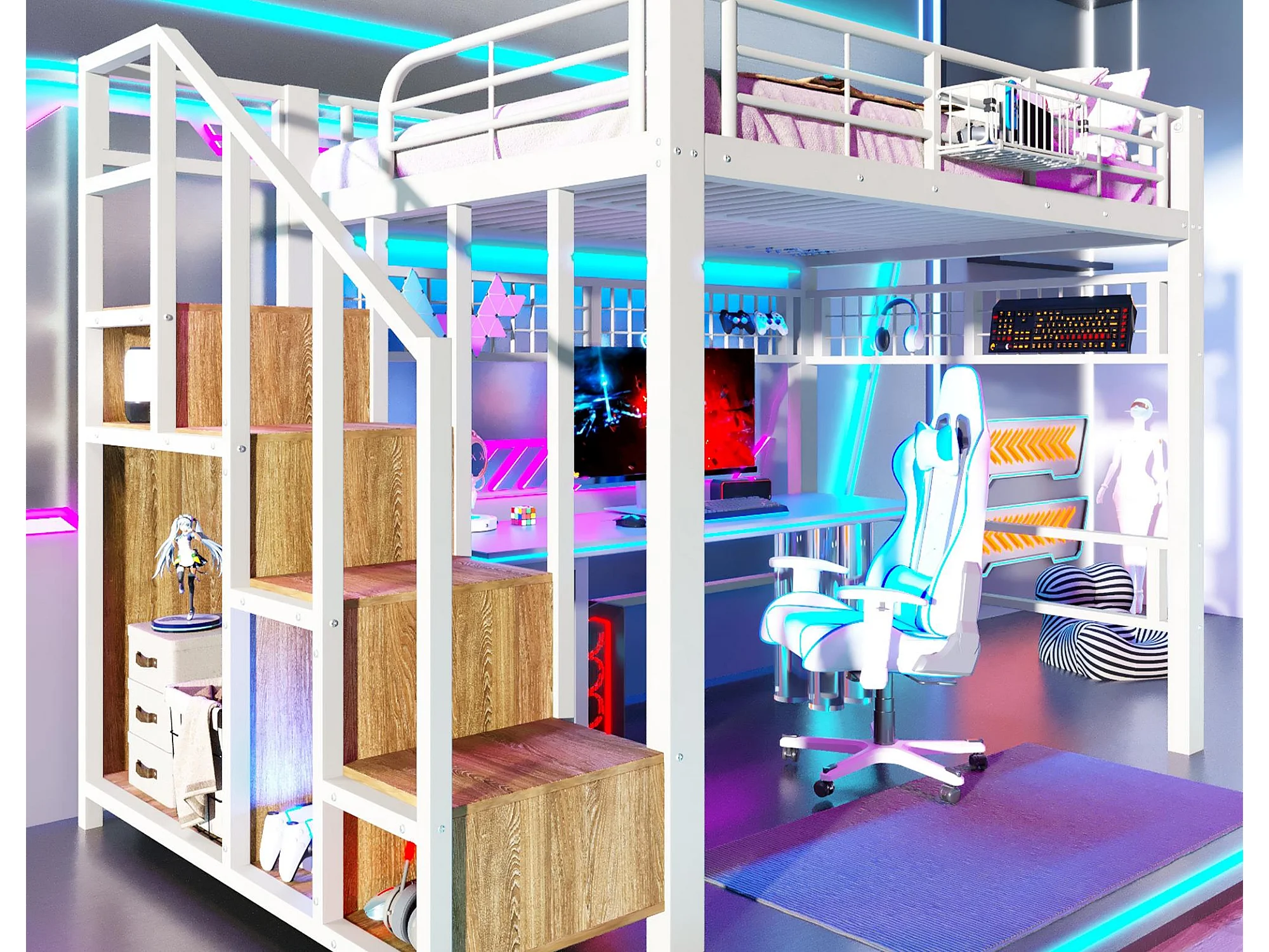 Lit mezzanine 140x200cm - avec filet suspendu - avec lumières LED - avec escalier de sécurité - blanc (matelas non inclus)