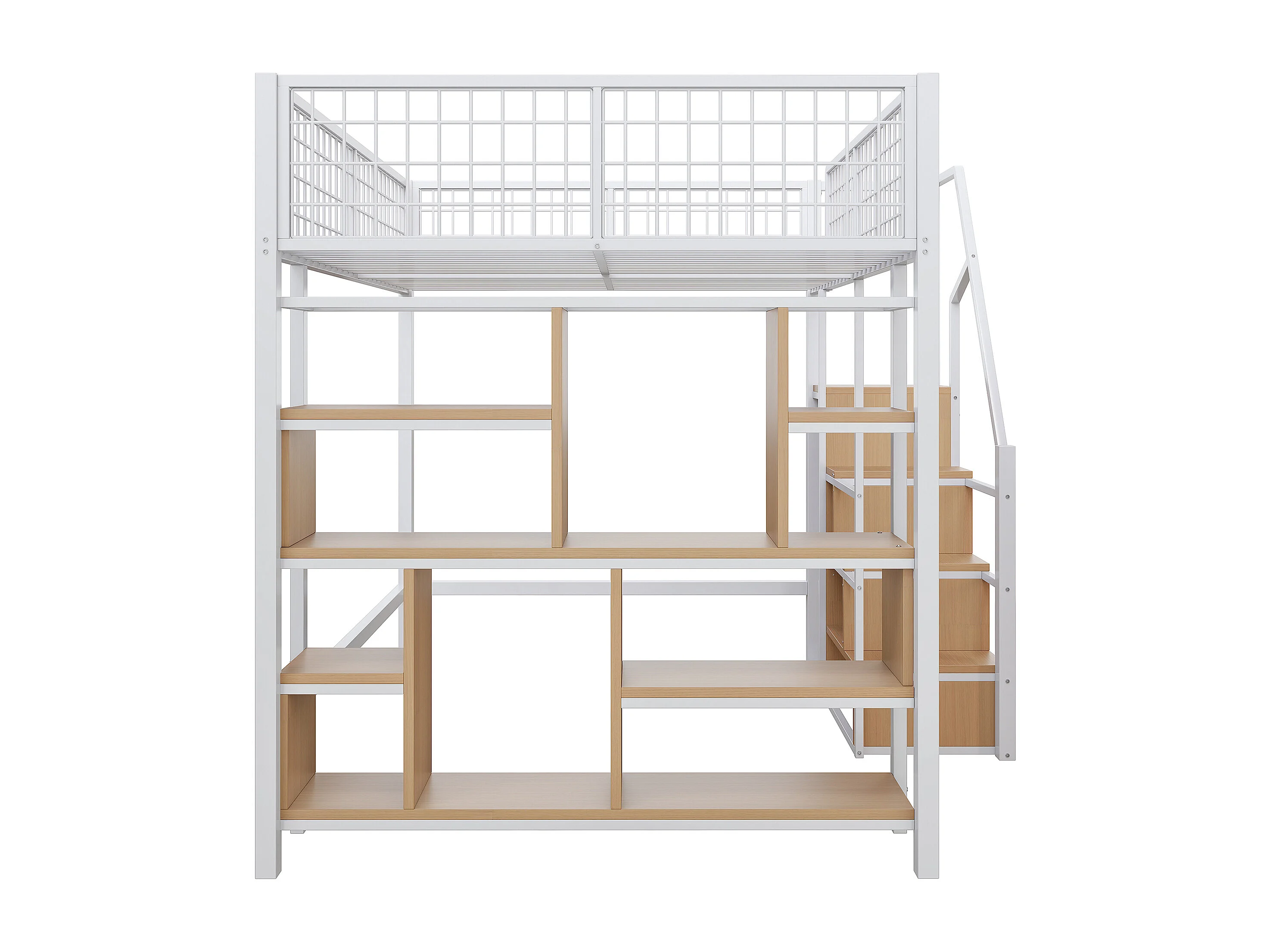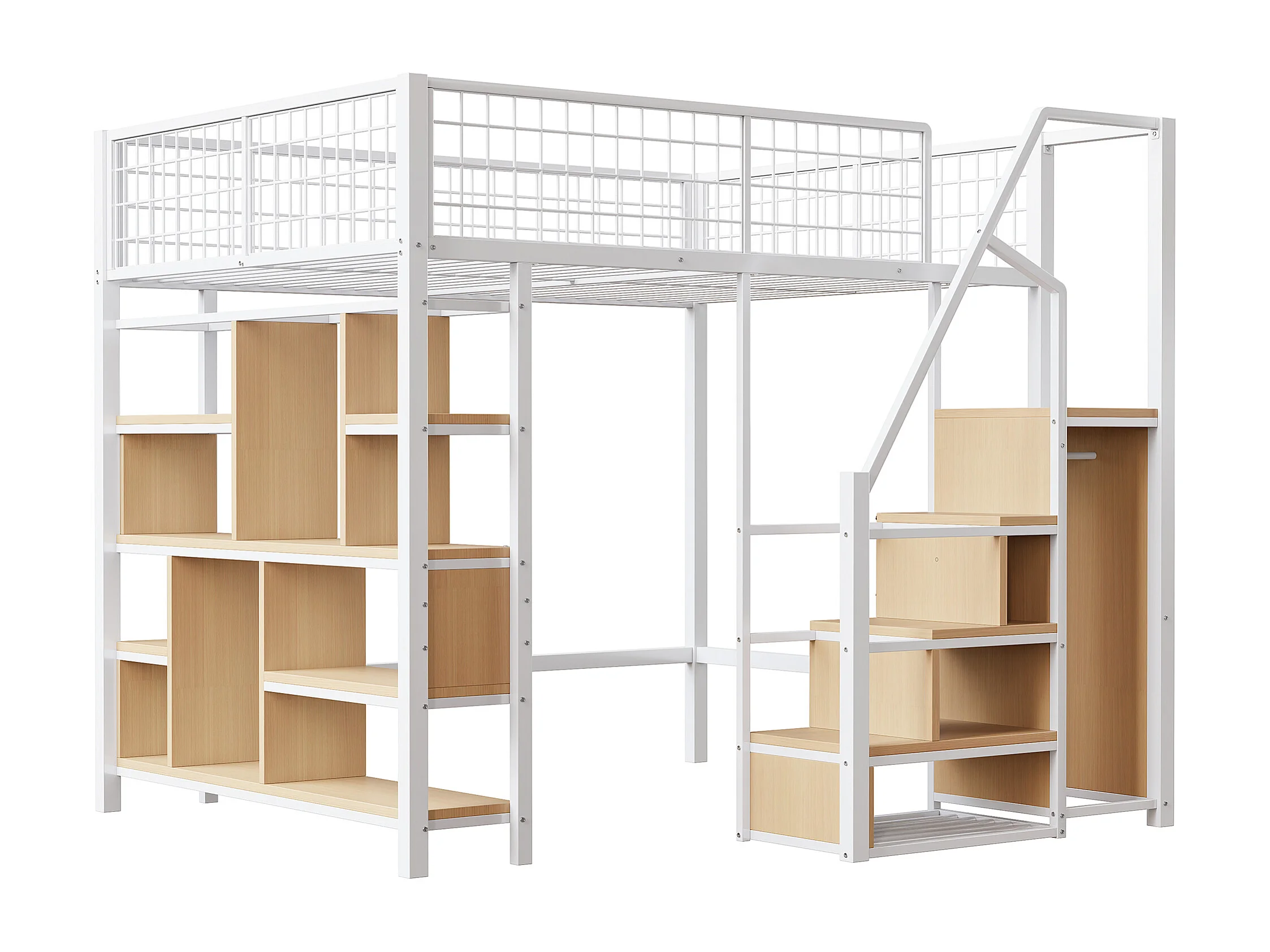 Lit mezzanine 140x200cm avec rangement et tringle à vêtement - Lit enfant en MDF et métal - Blanc et naturel clair