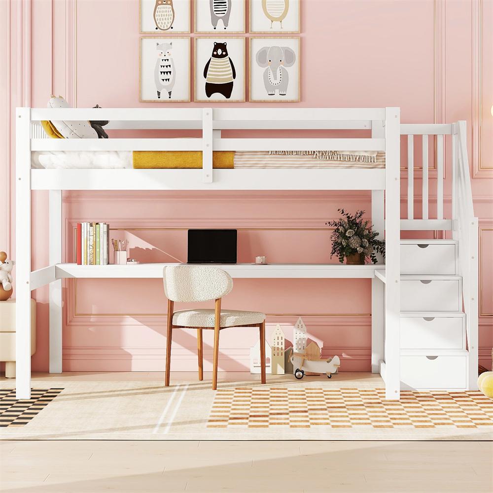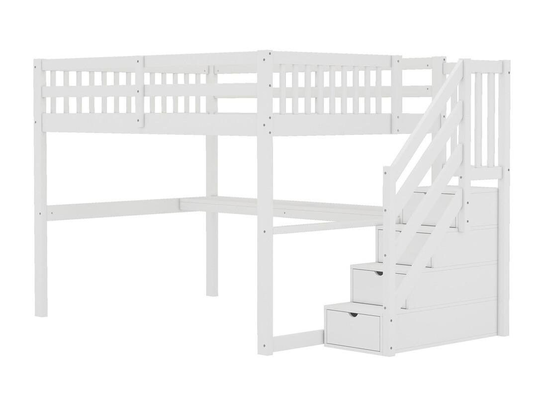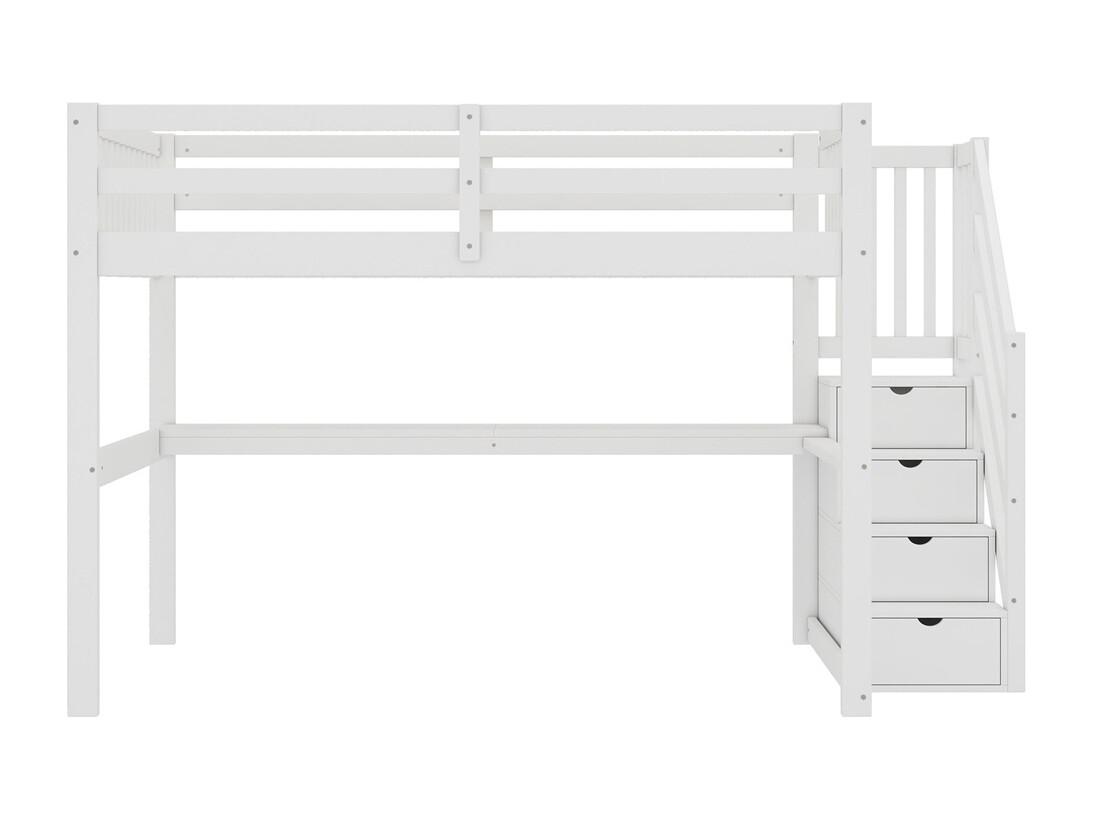 Lit mezzanine 140x200cm, lit enfant avec tiroirs de rangement et bureau sous le lit, pin, blanc