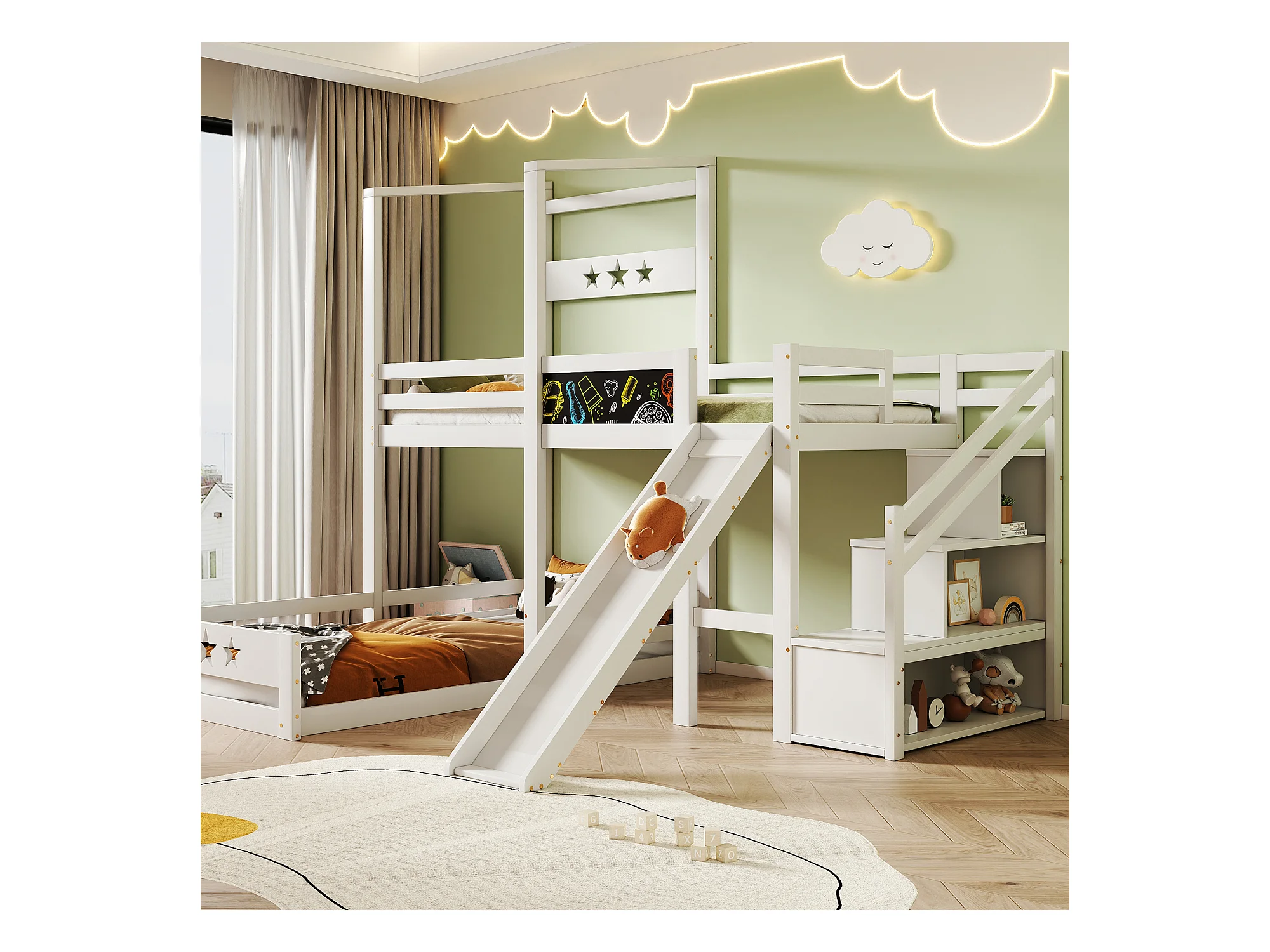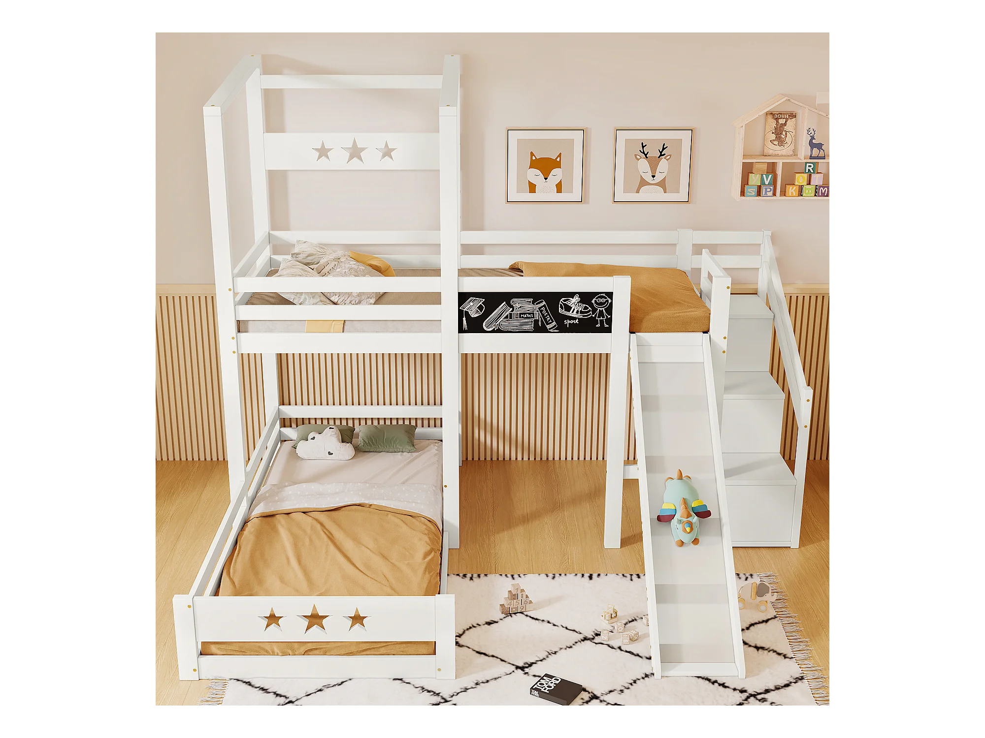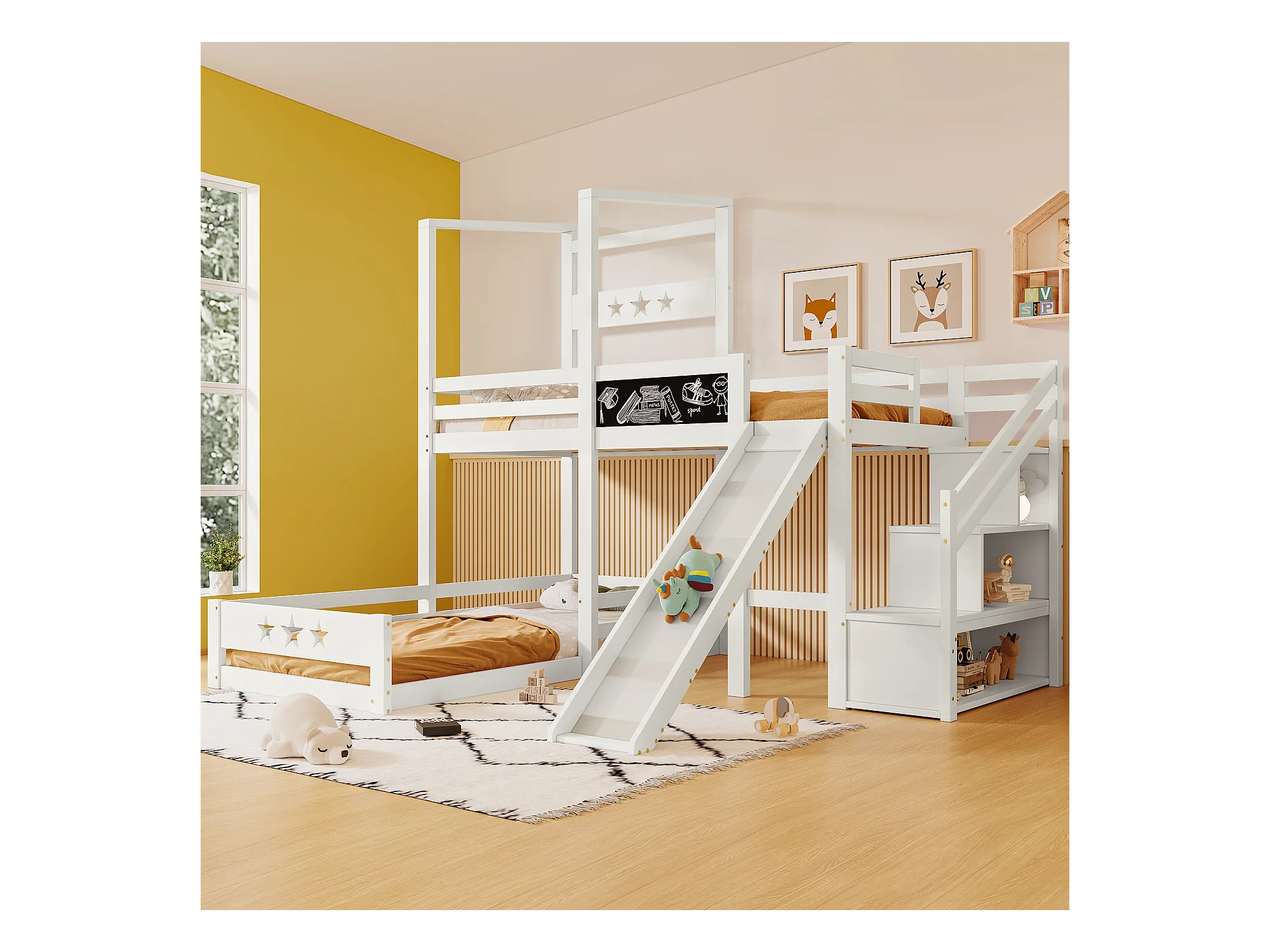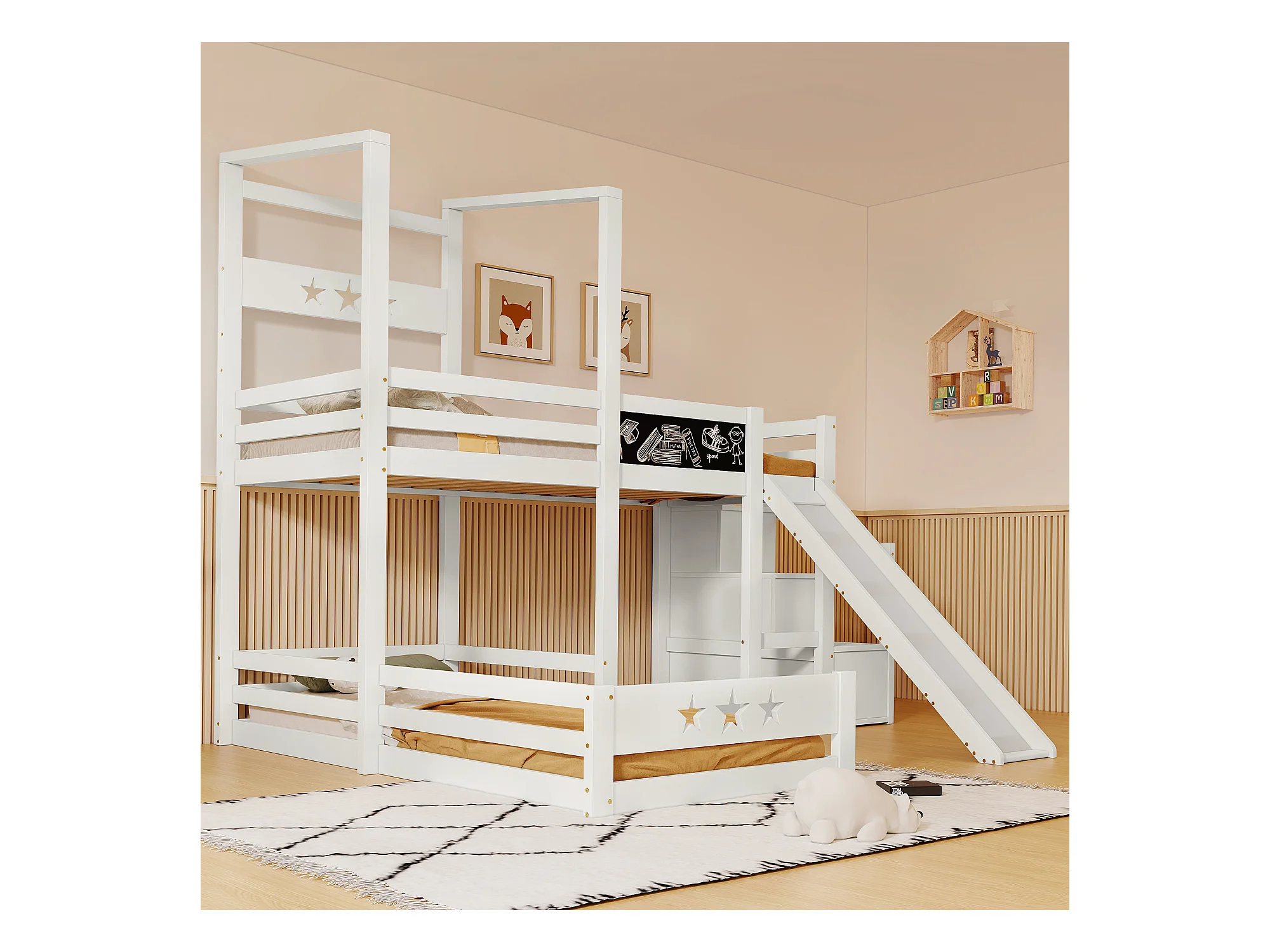 Lit mezzanine 2 x 90 x 200 cm avec échelle + toboggan - 3 étagères de rangement - blanc