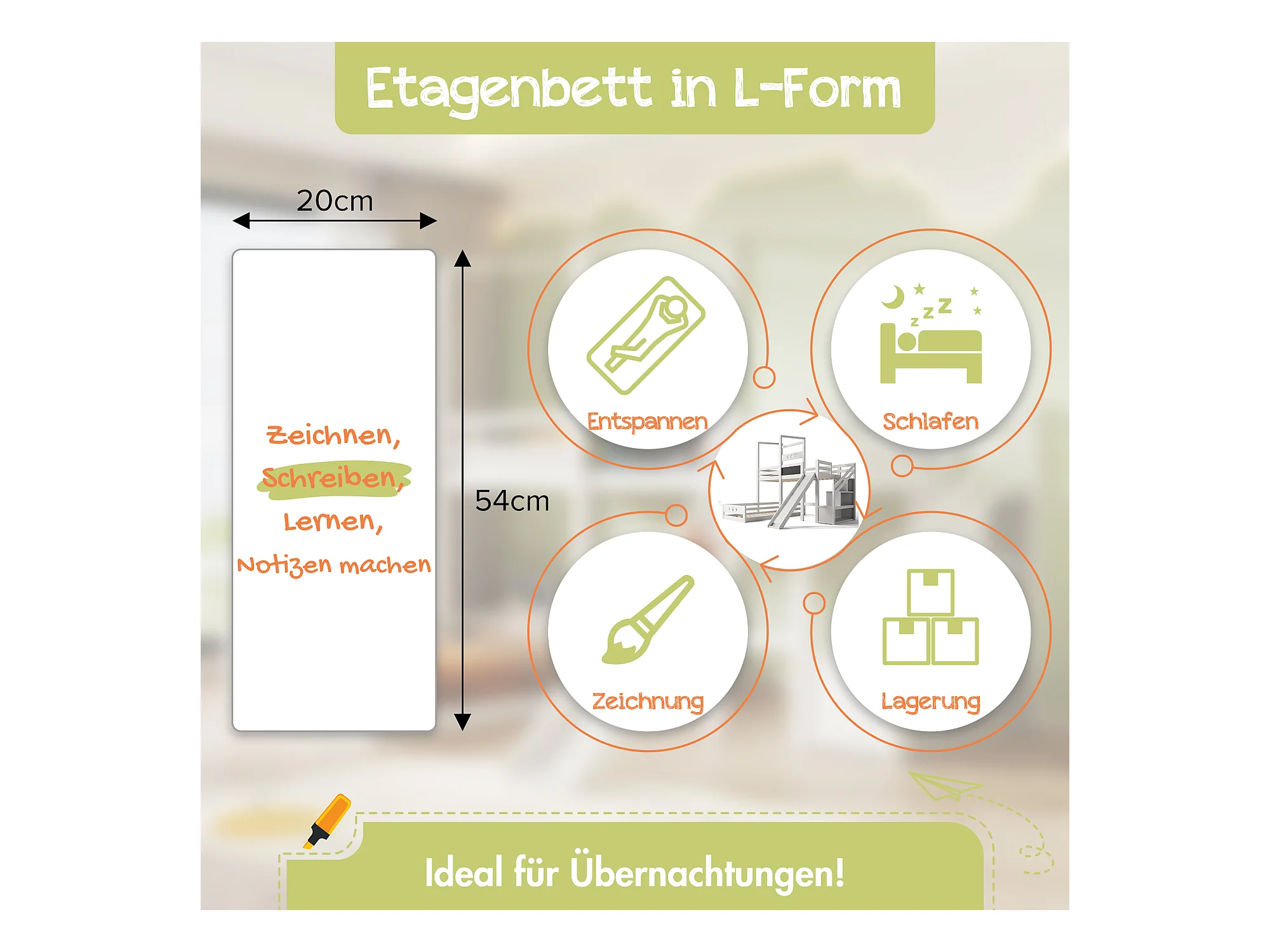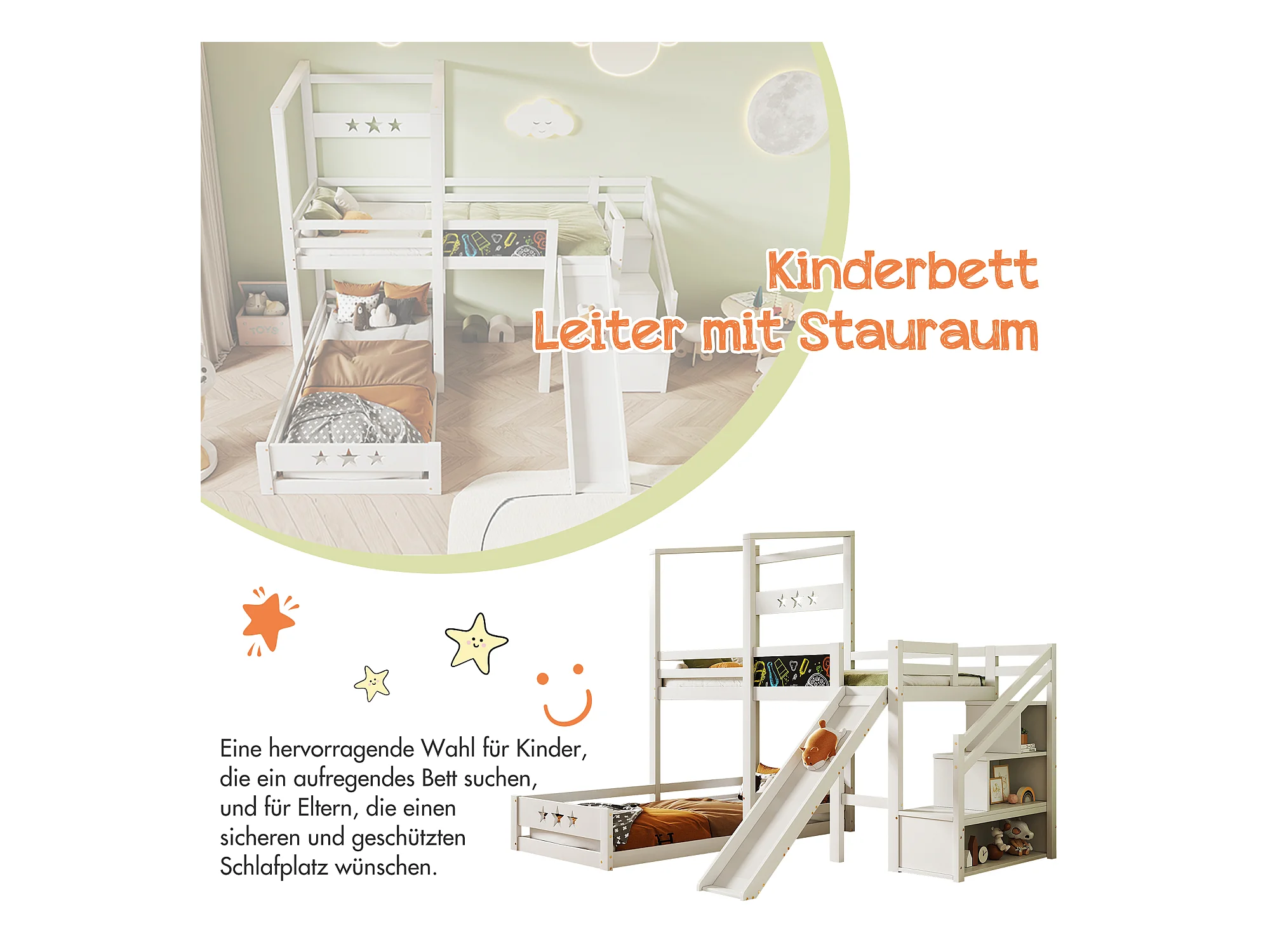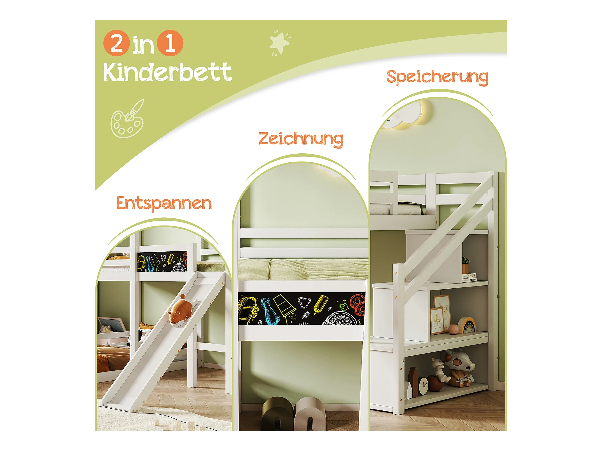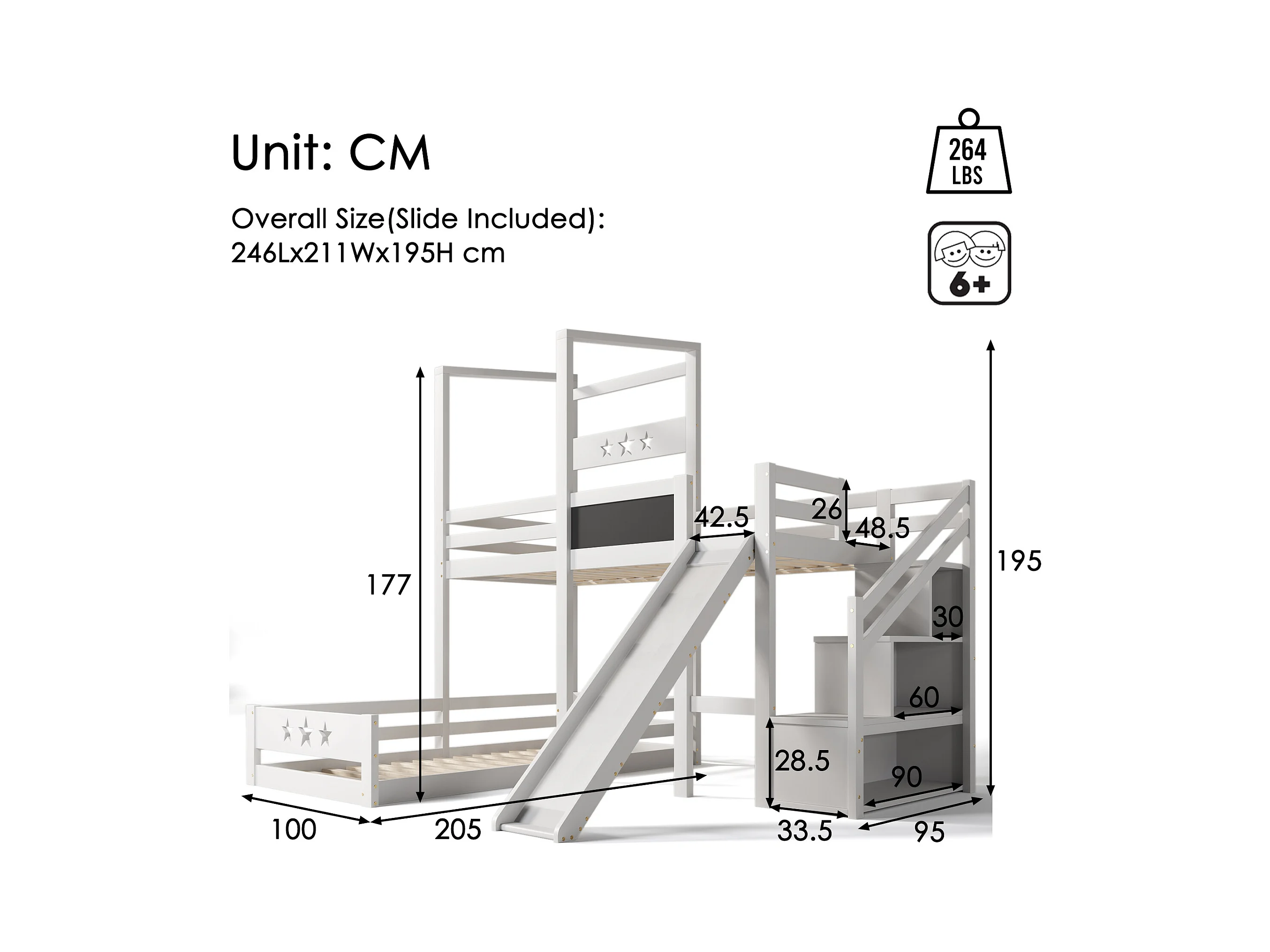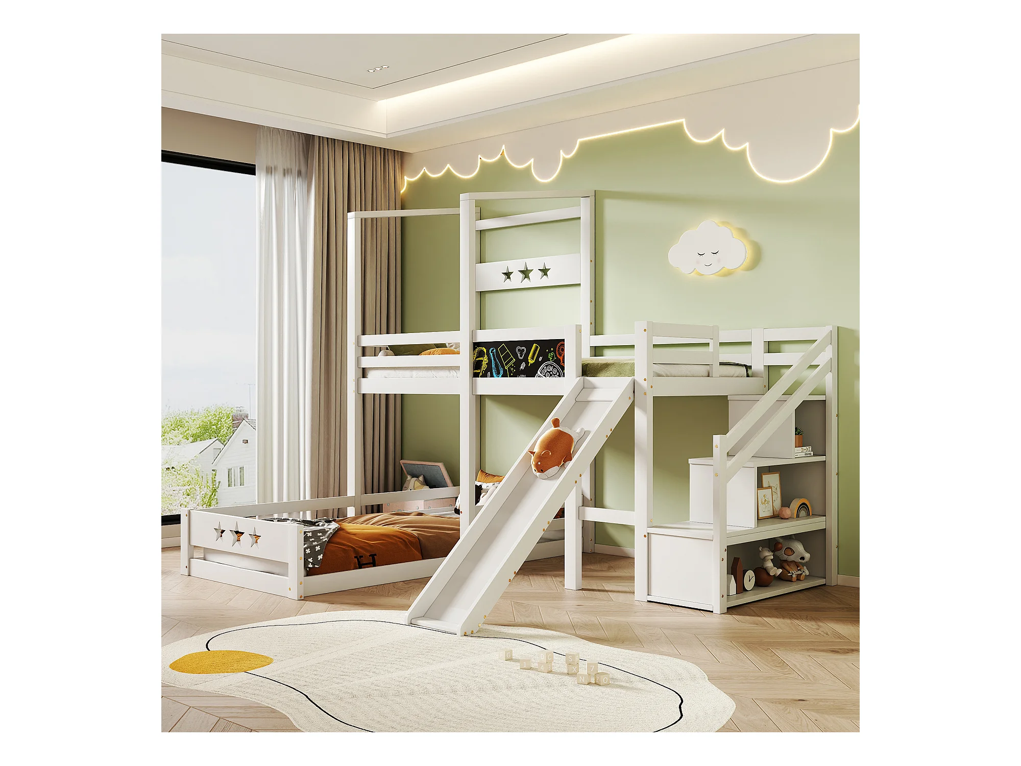 Lit mezzanine 2 x 90 x 200 cm avec échelle + toboggan - 3 étagères de rangement - blanc