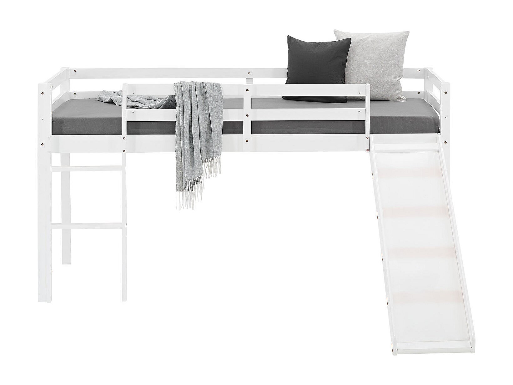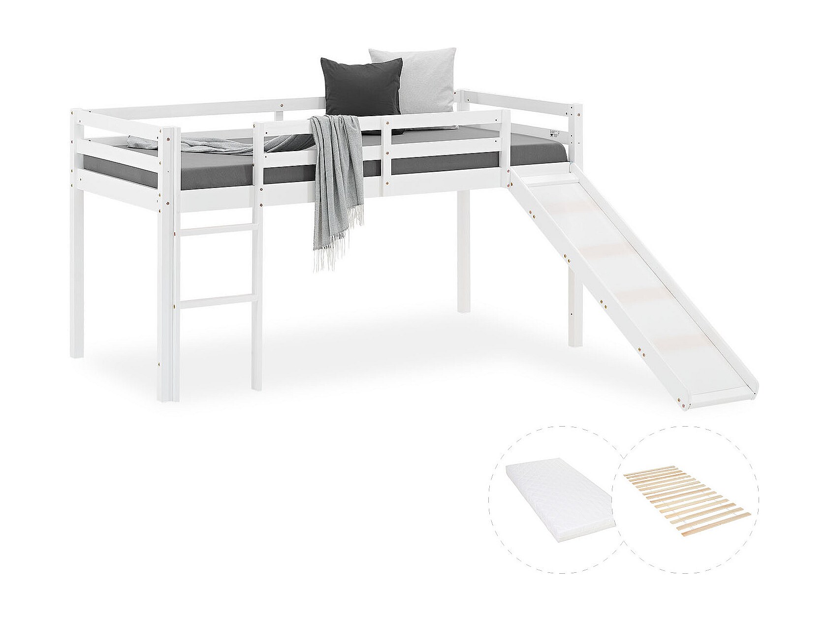 Lit mezzanine 207x110x97 cm blanc avec matelas, sommier à lattes, tiroir coulissant