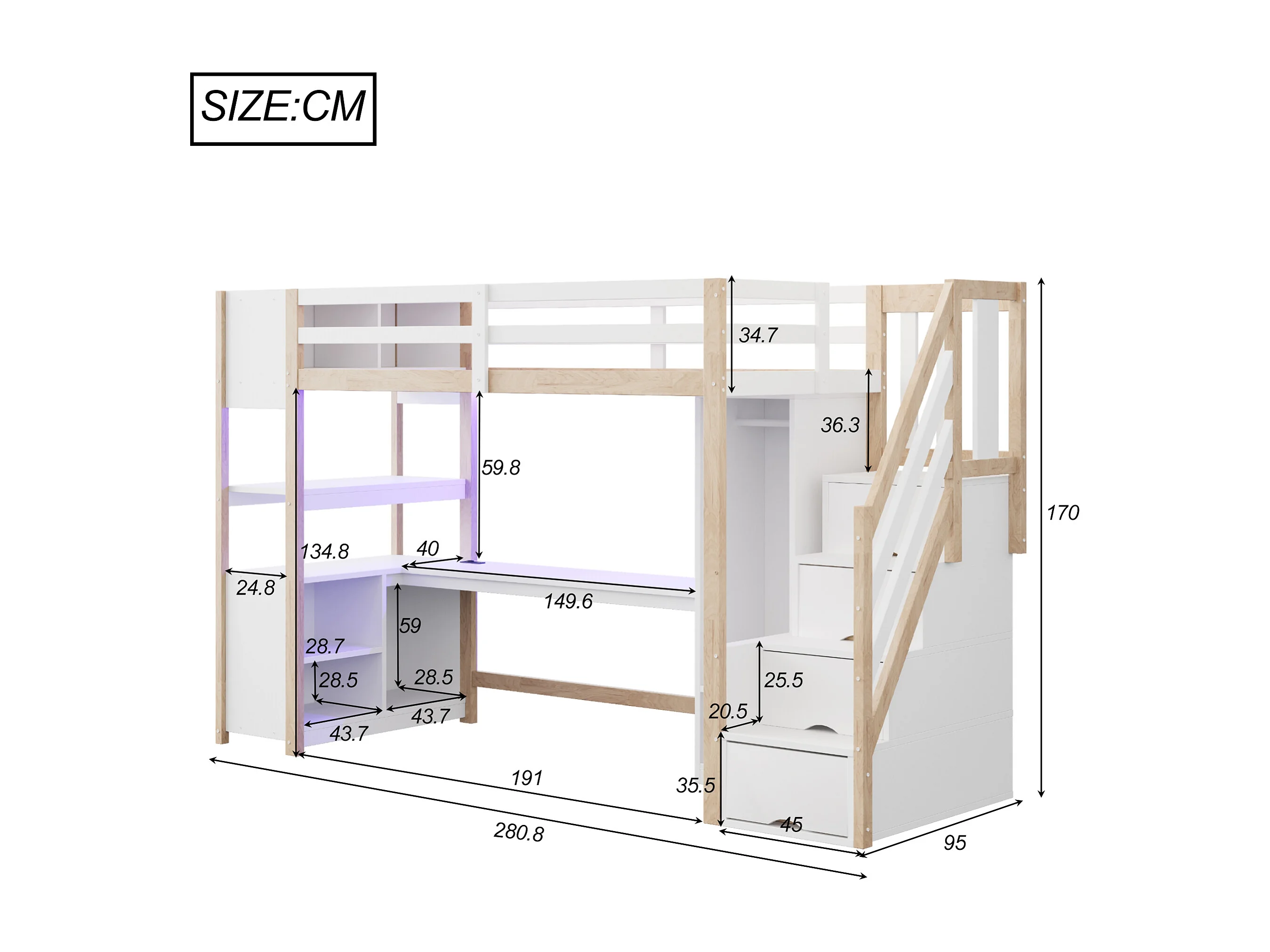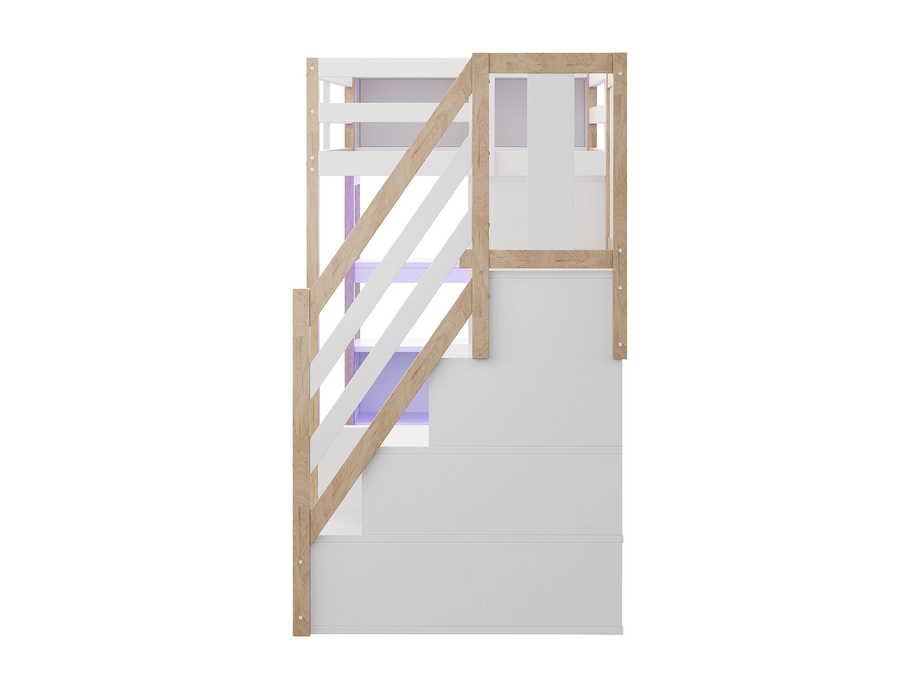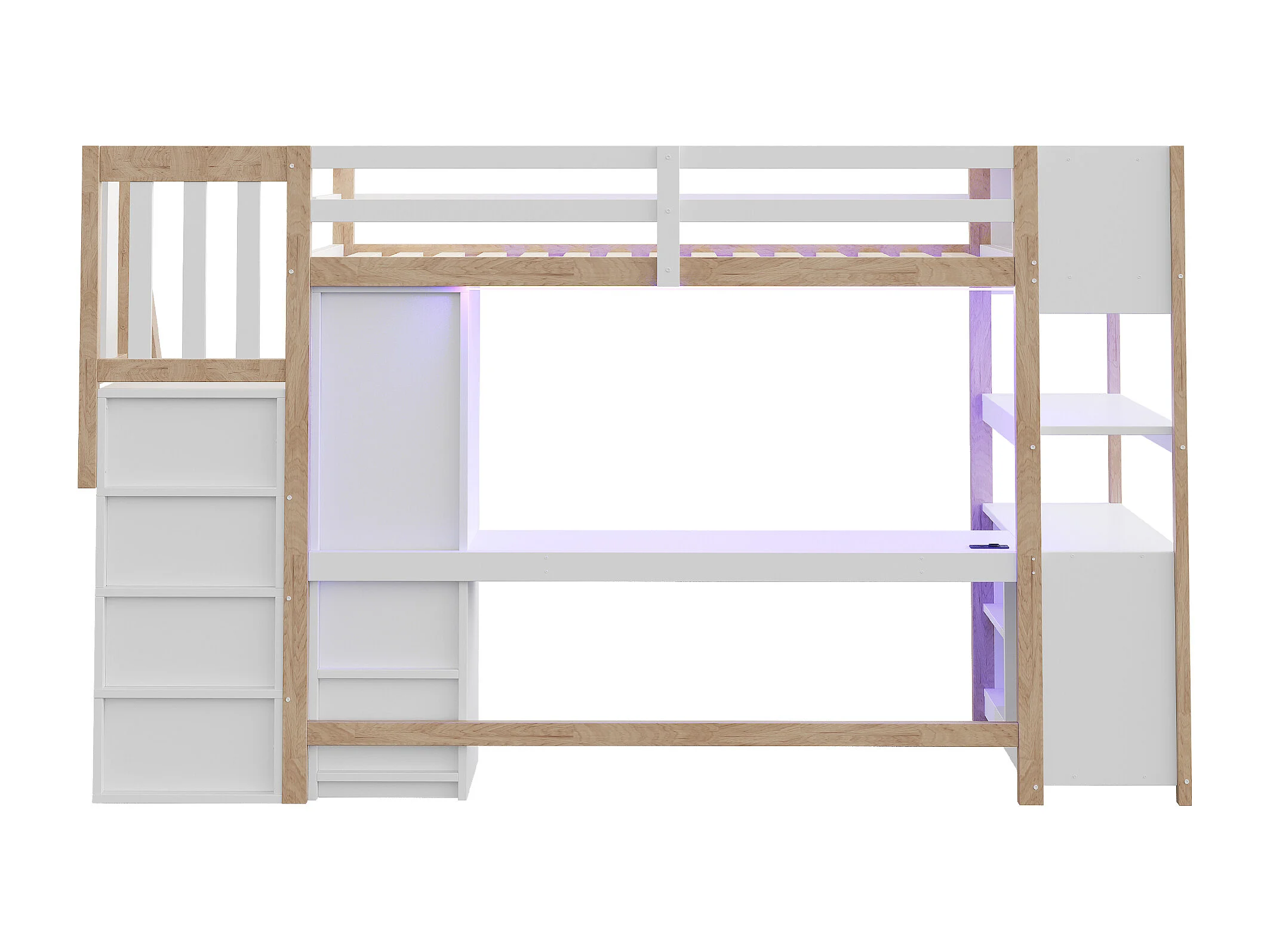 Lit mezzanine 90 × 200 cm avec armoire, bureau et prises - Couleur bois et blanc