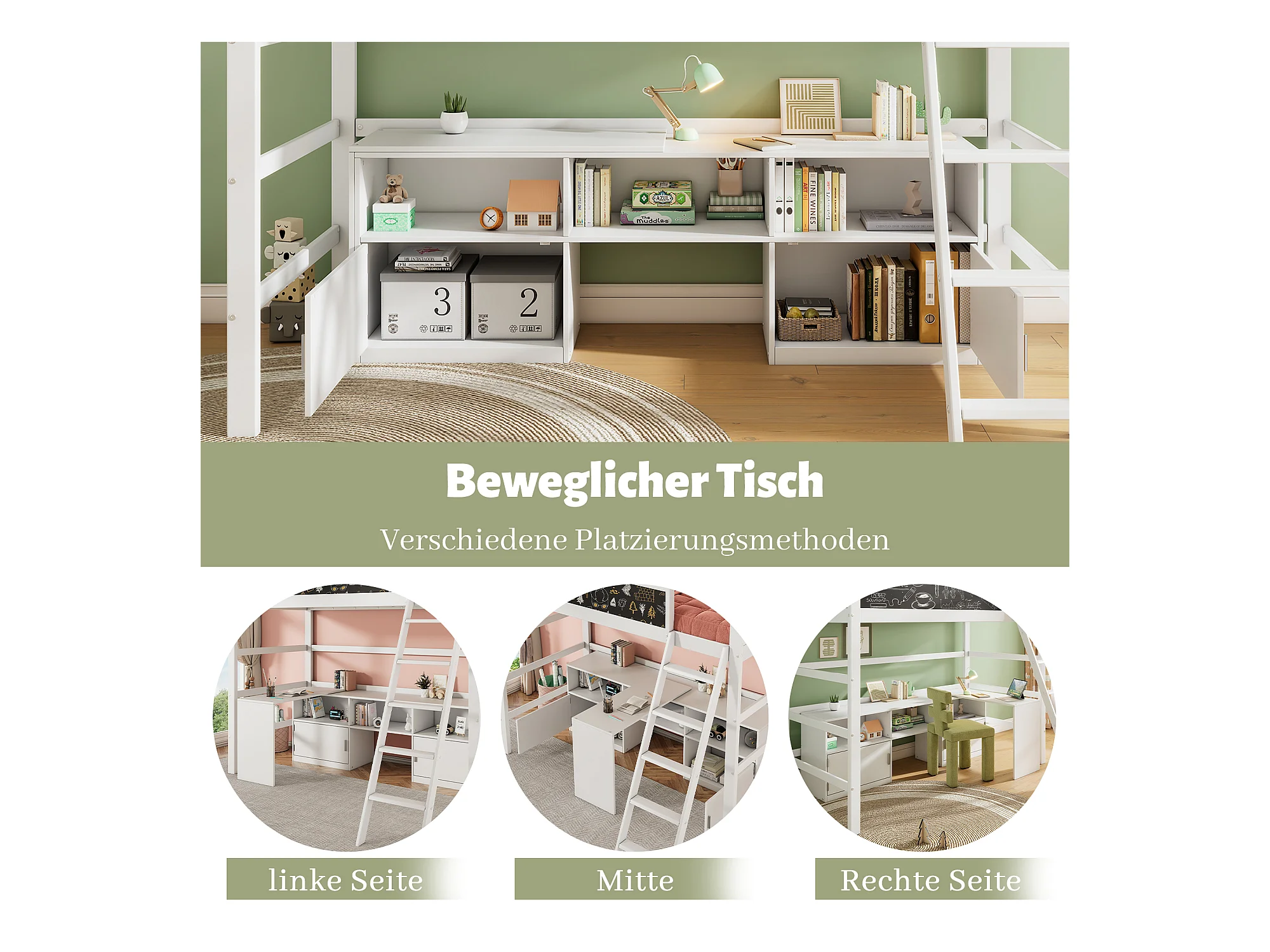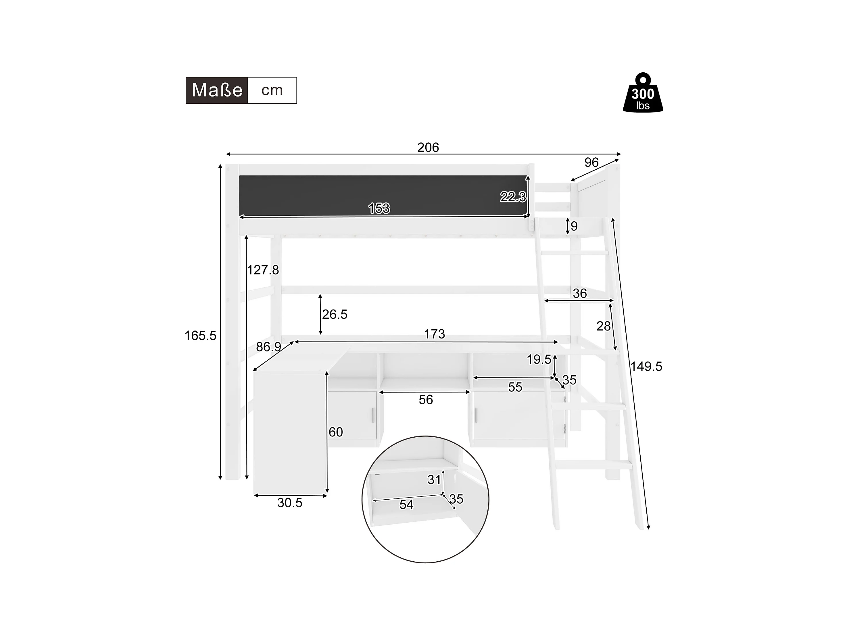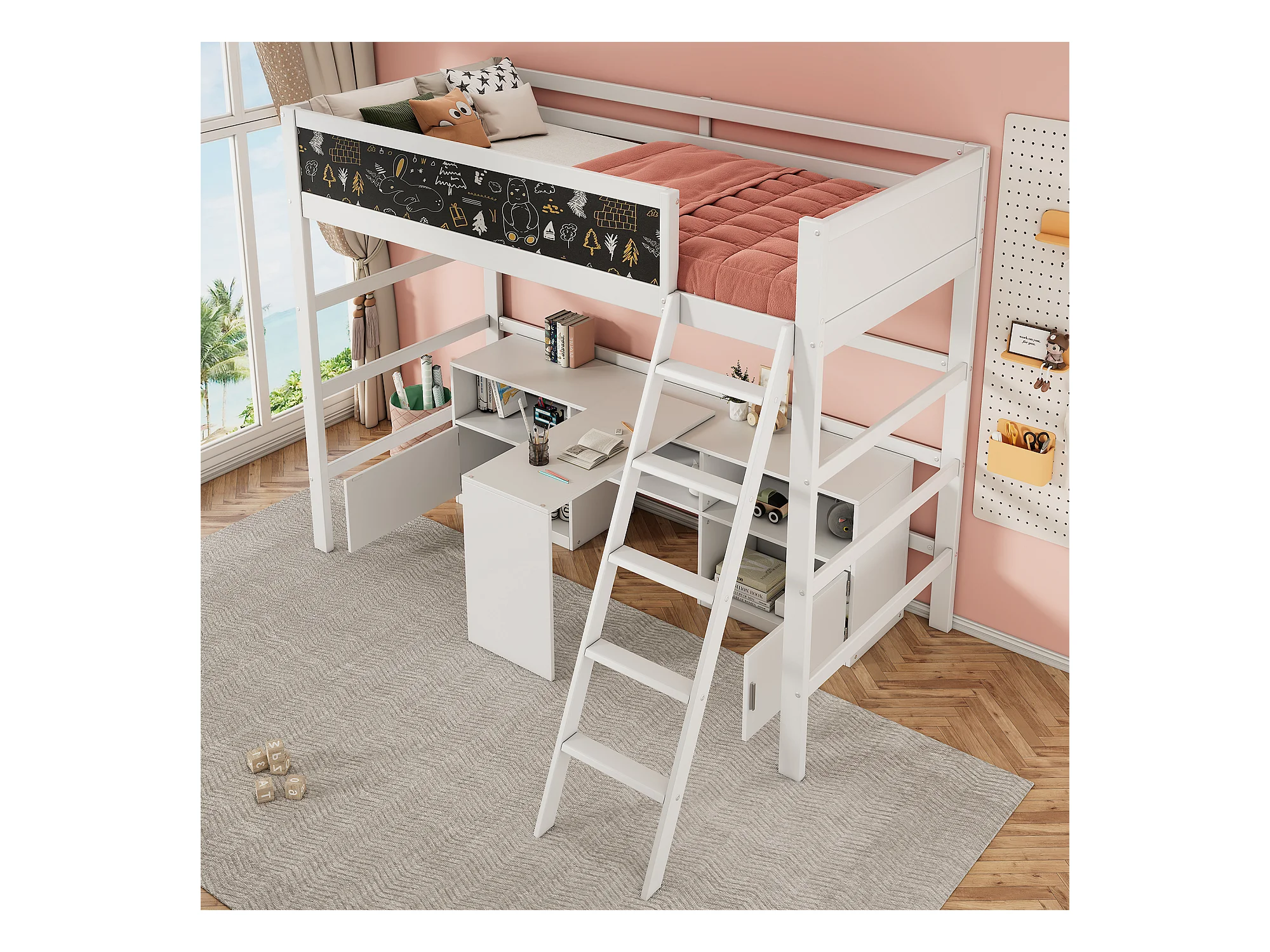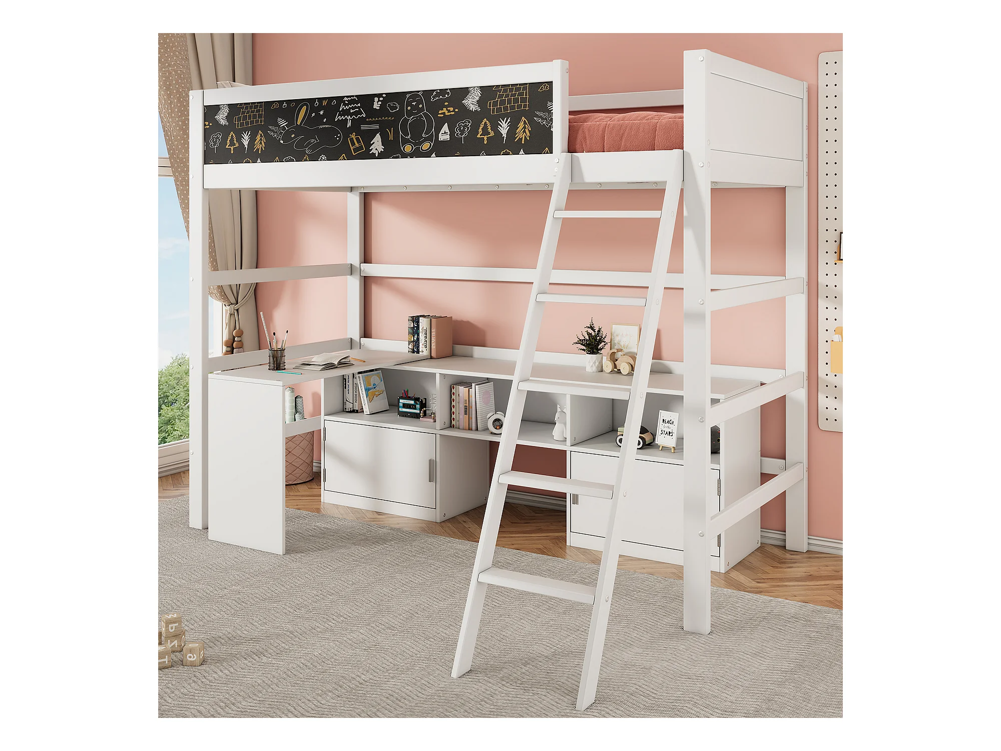 Lit mezzanine 90 x 200 cm avec bureau, armoir de rangement et tableau noir - bois de pin - coloris blanc