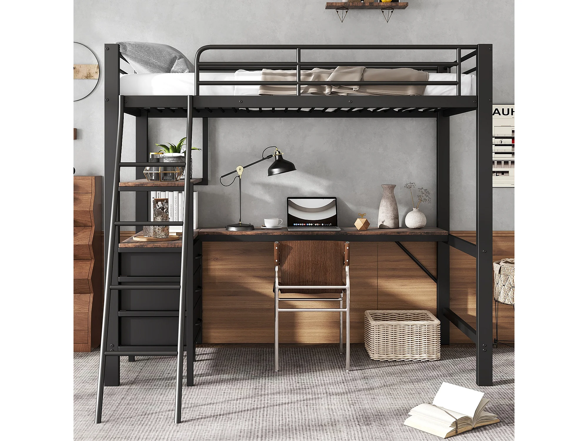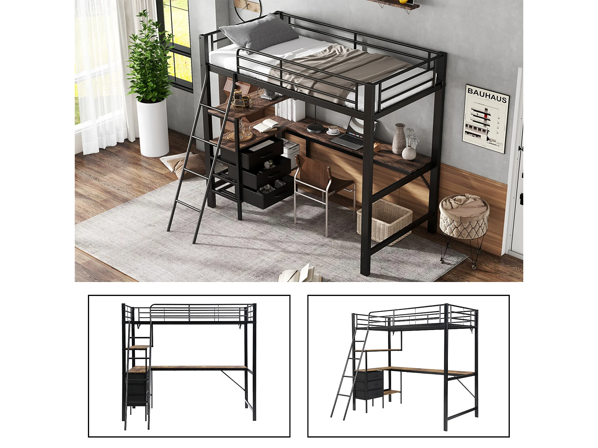 Lit mezzanine 90 x 200 cm avec bureau d'angle, 3 tiroirs et étagères - Métal + aggloméré - Noir et noyer (sans matelas)