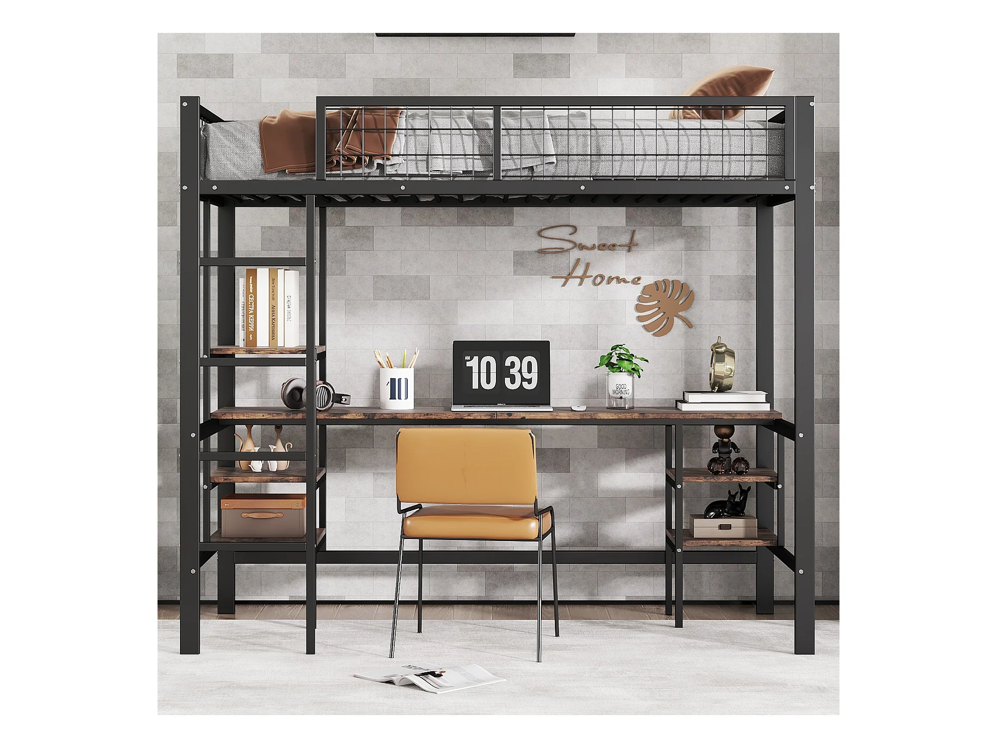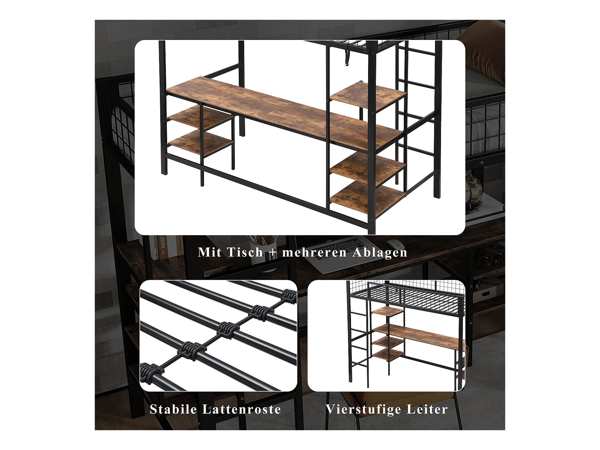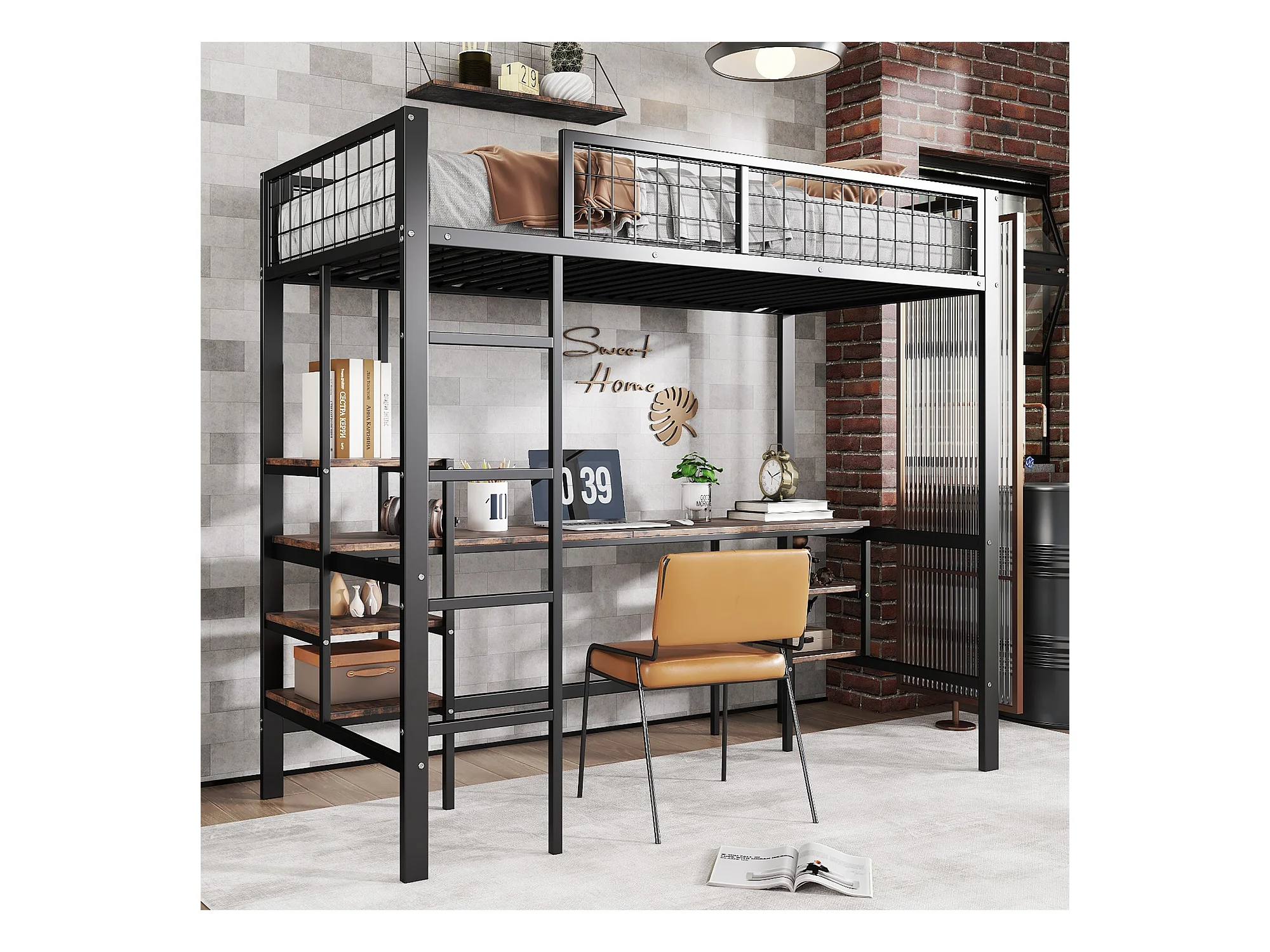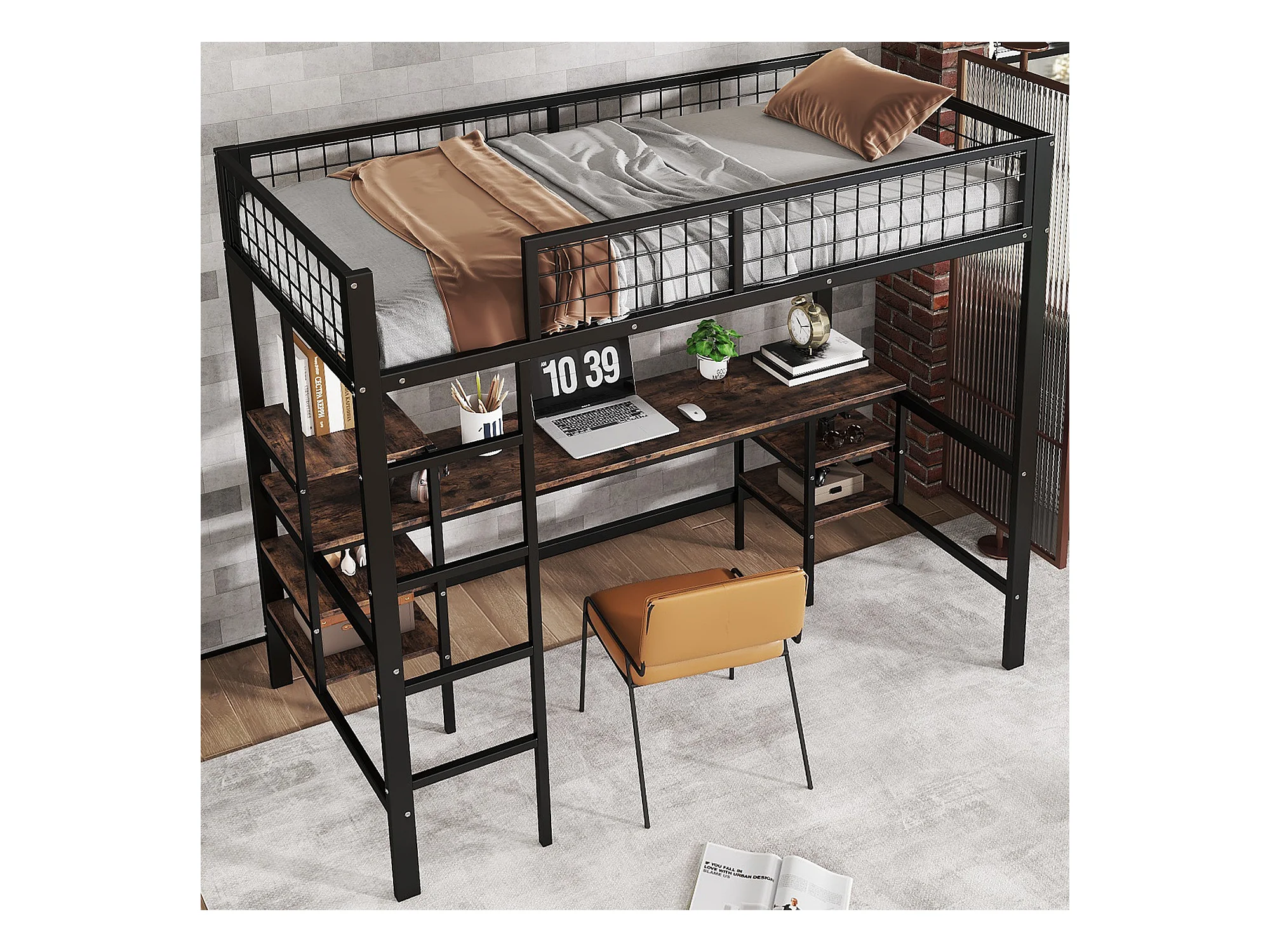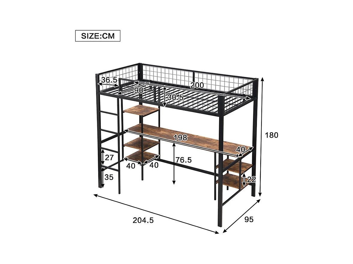 Lit mezzanine 90 x 200 cm avec bureau et étagères de rangement - Fer + aggloméré - pour enfant - Noir et marron
