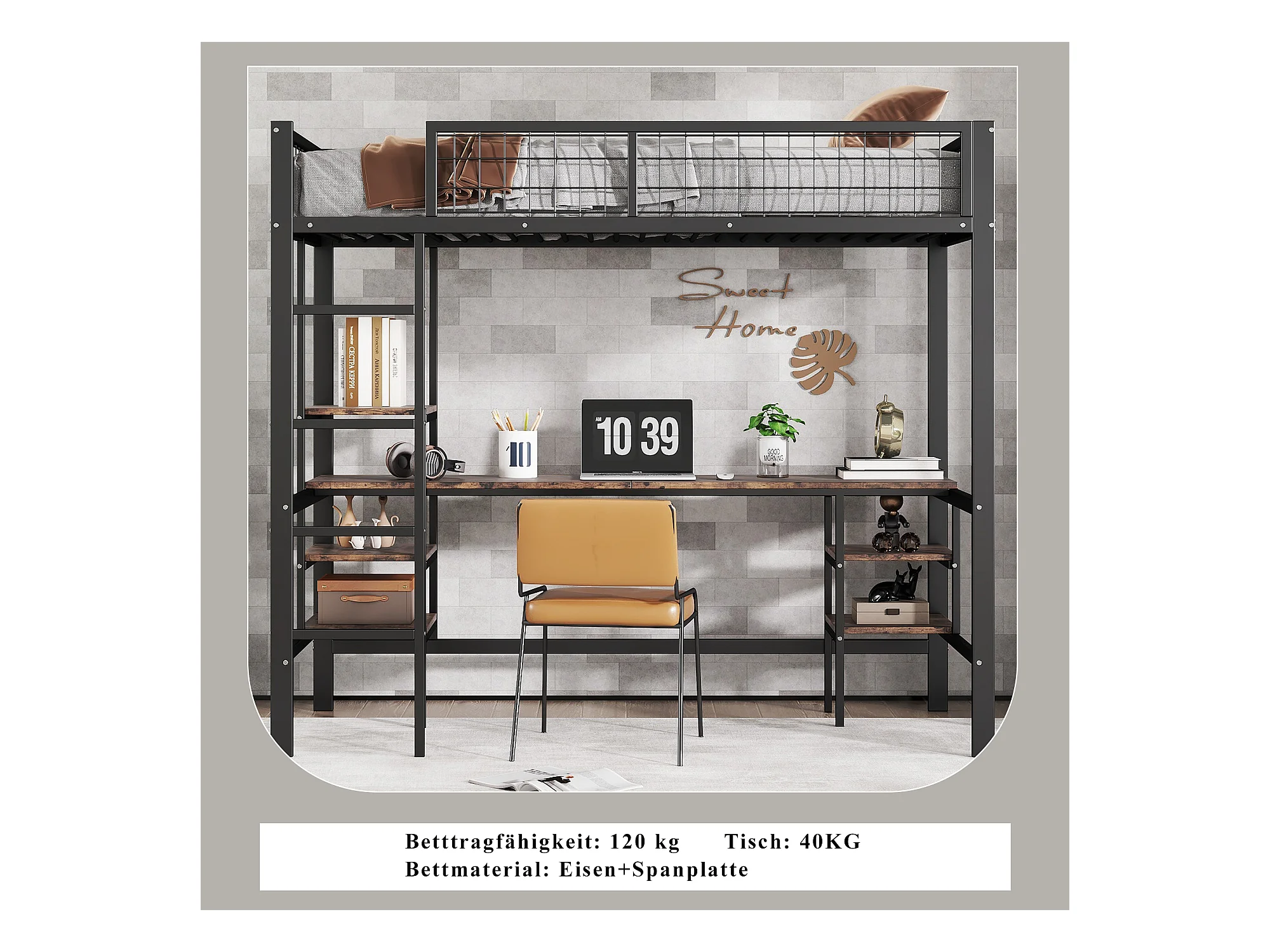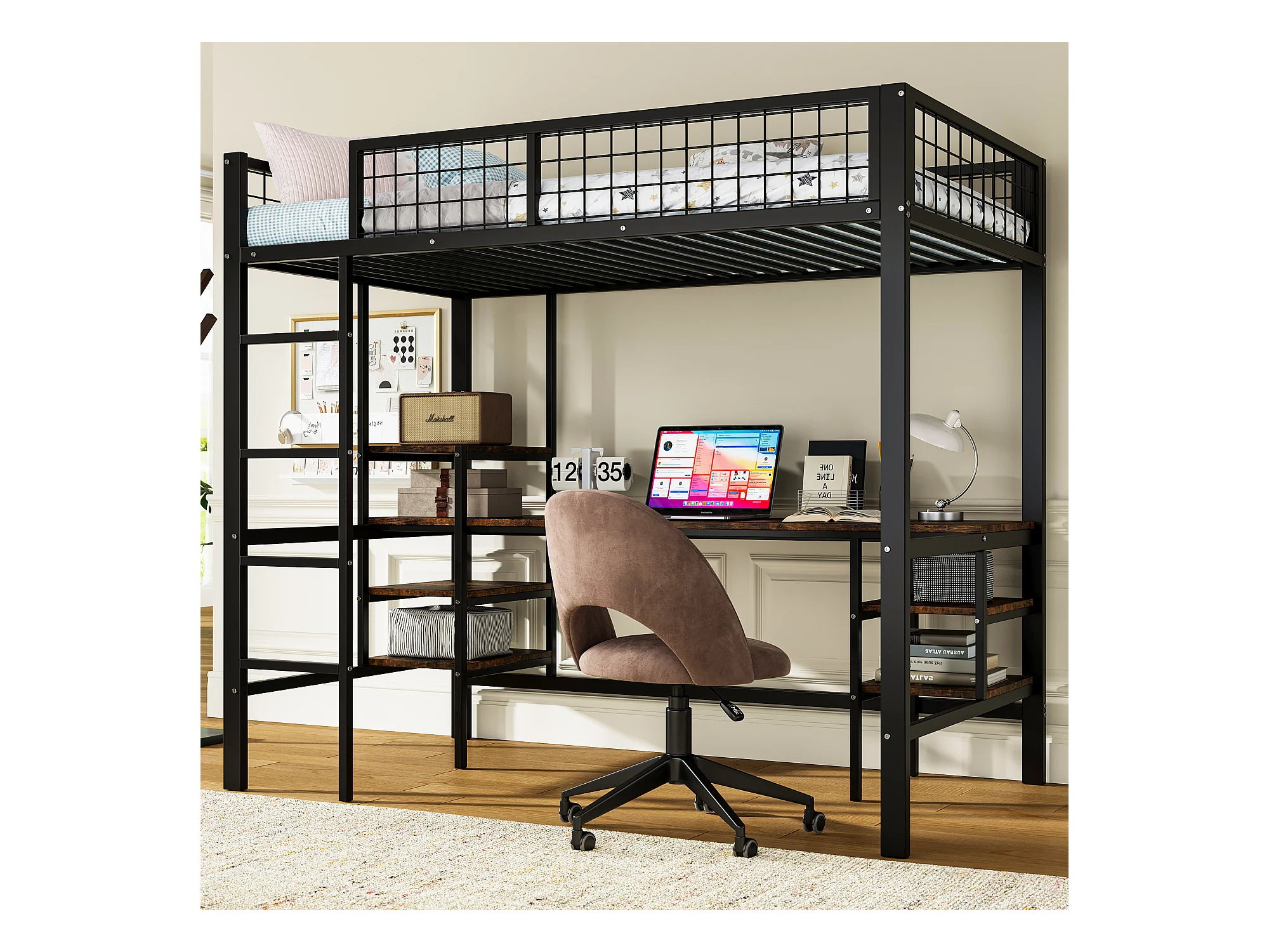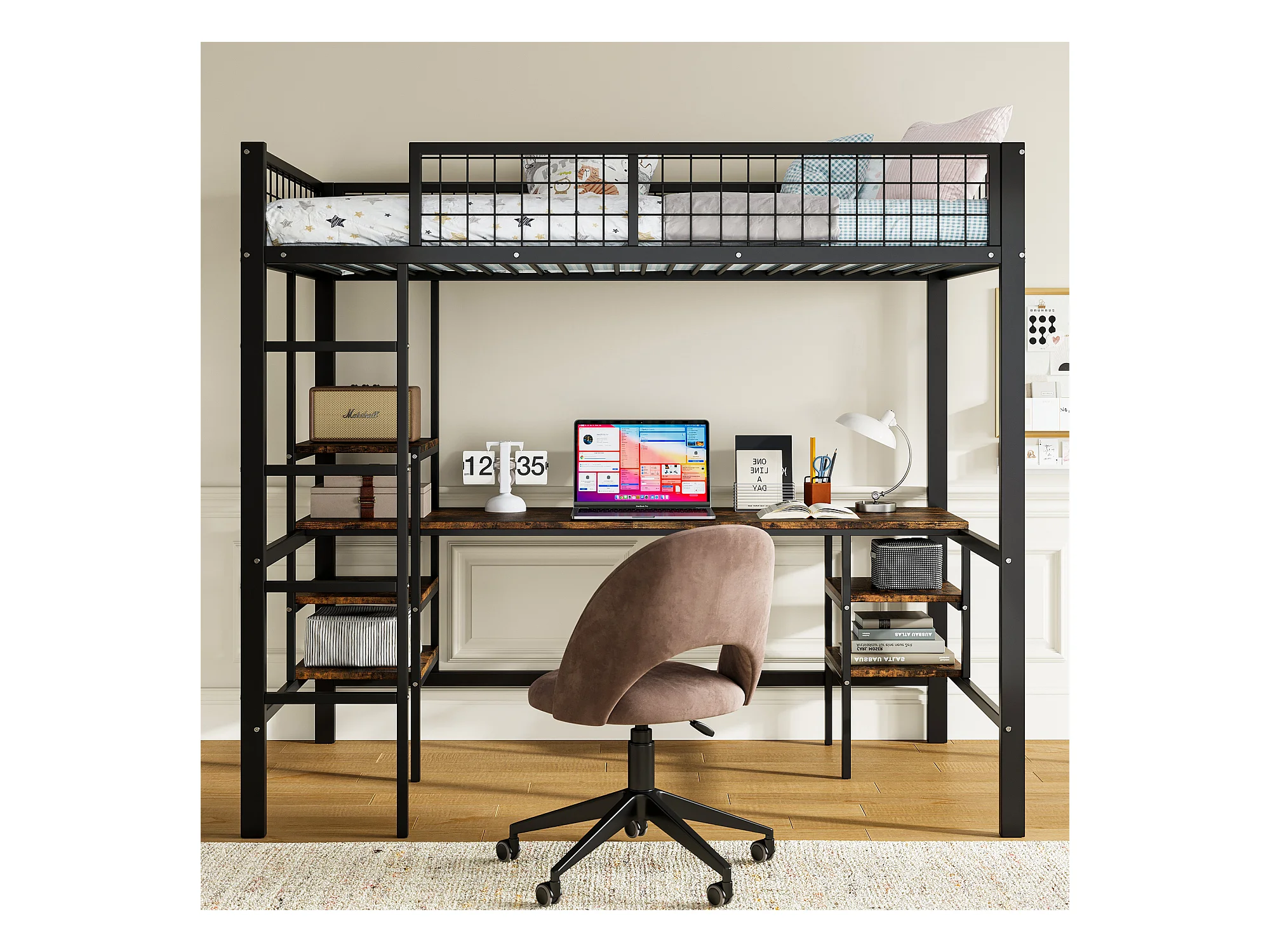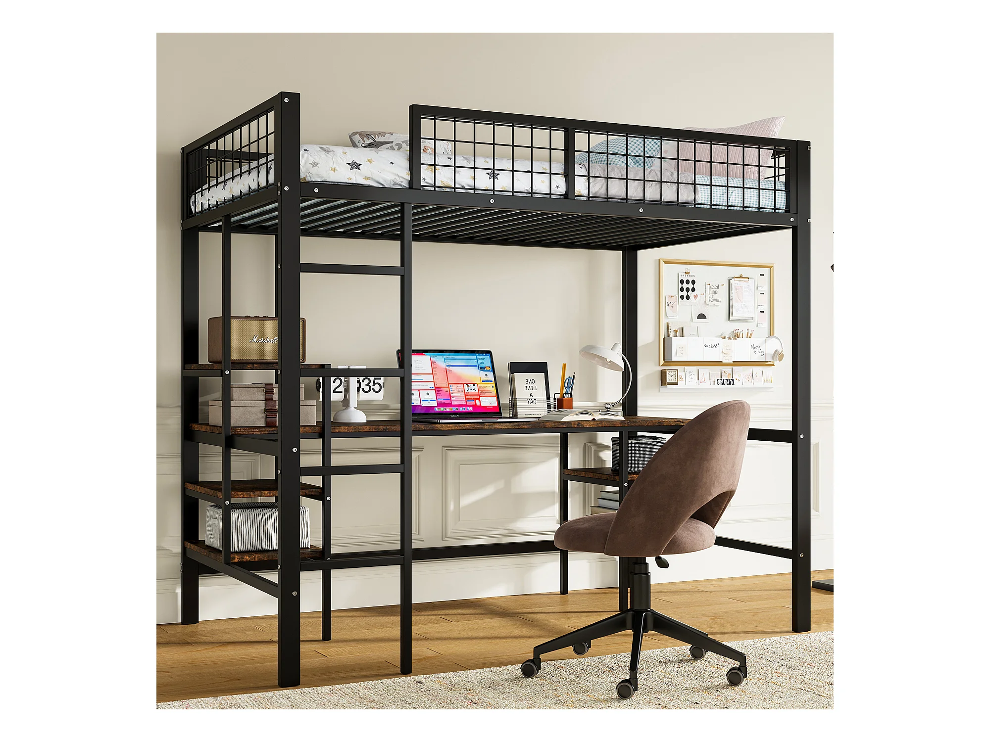 Lit mezzanine 90 x 200 cm avec bureau et étagères de rangement - Fer + aggloméré - pour enfant - Noir et marron