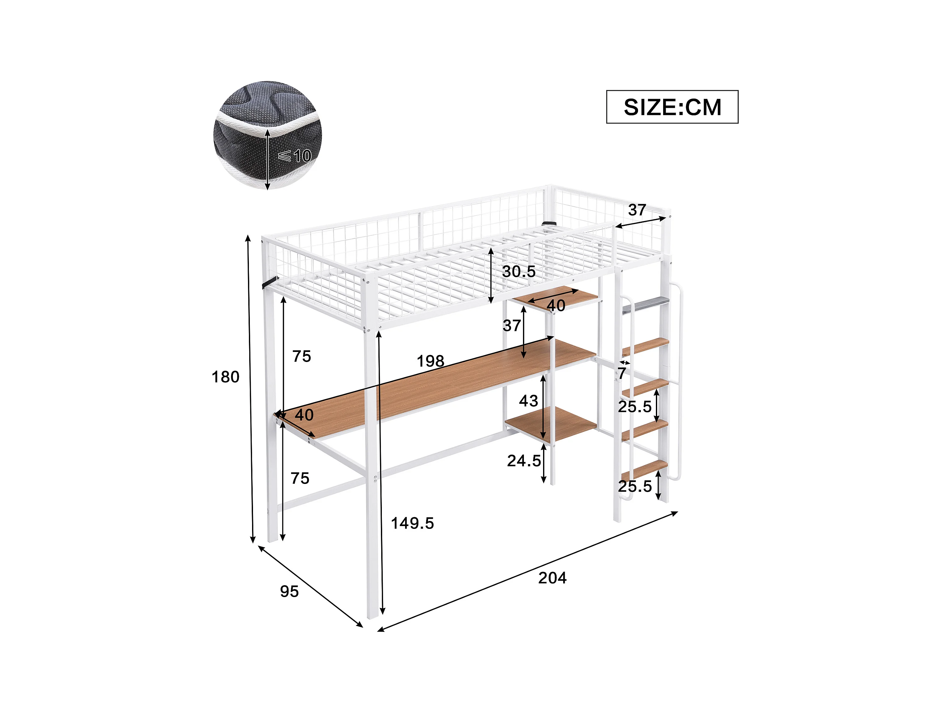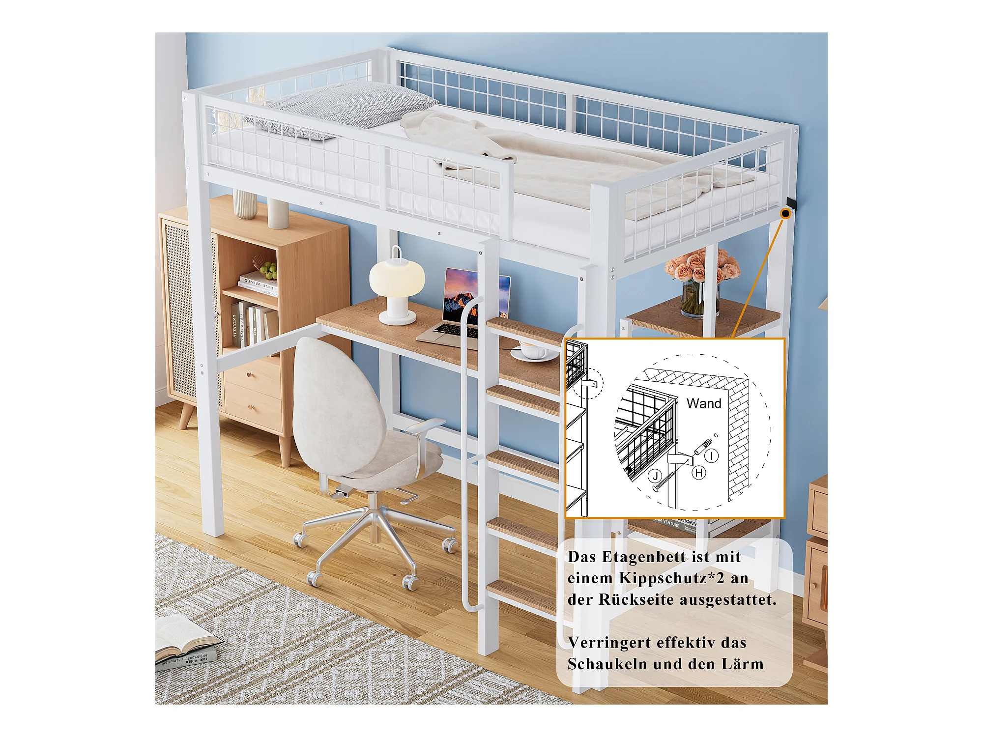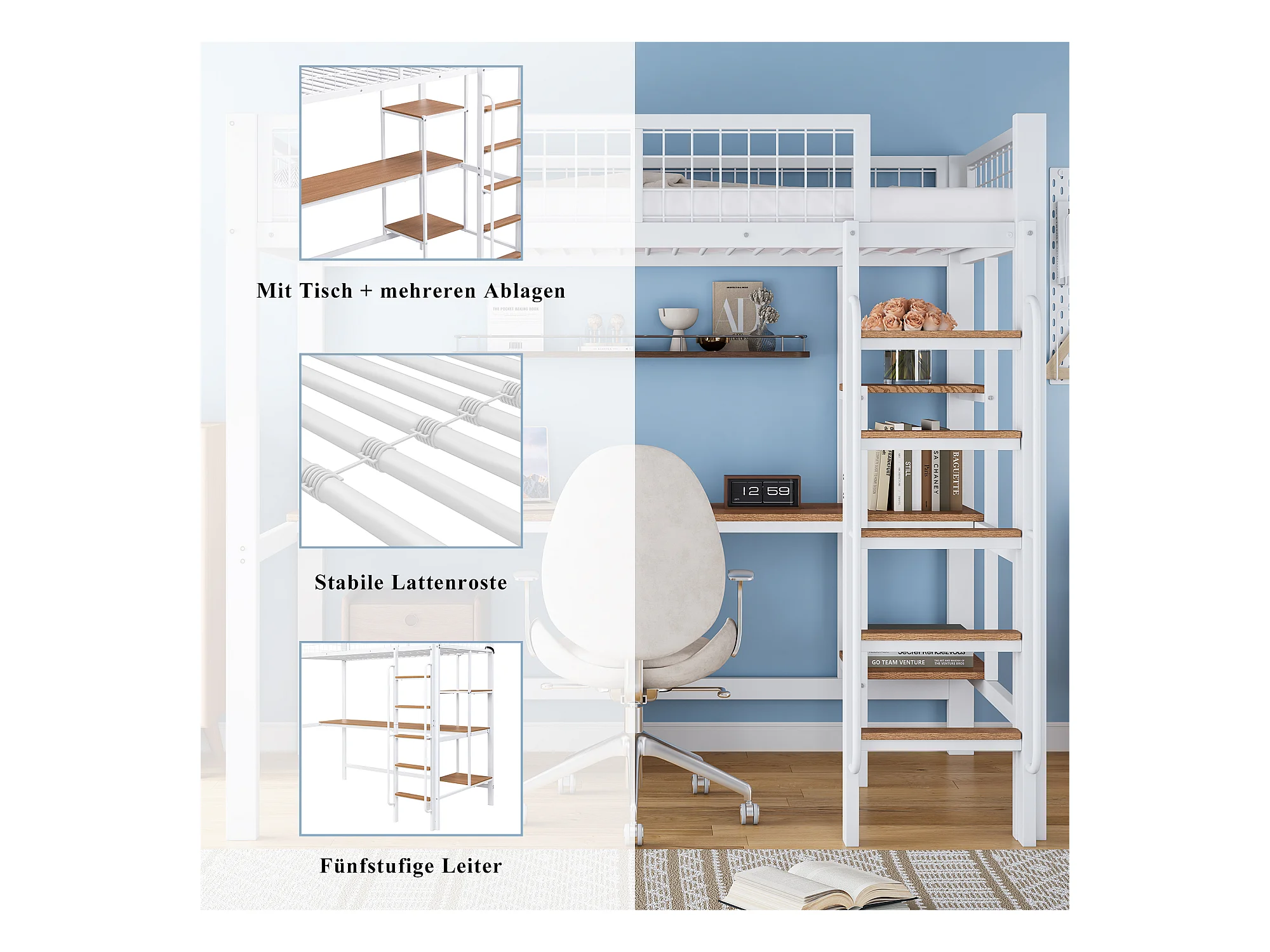 Lit mezzanine 90 x 200 cm avec bureau et étagères - Métal + MDF - Blanc + naturel (sans matelas)