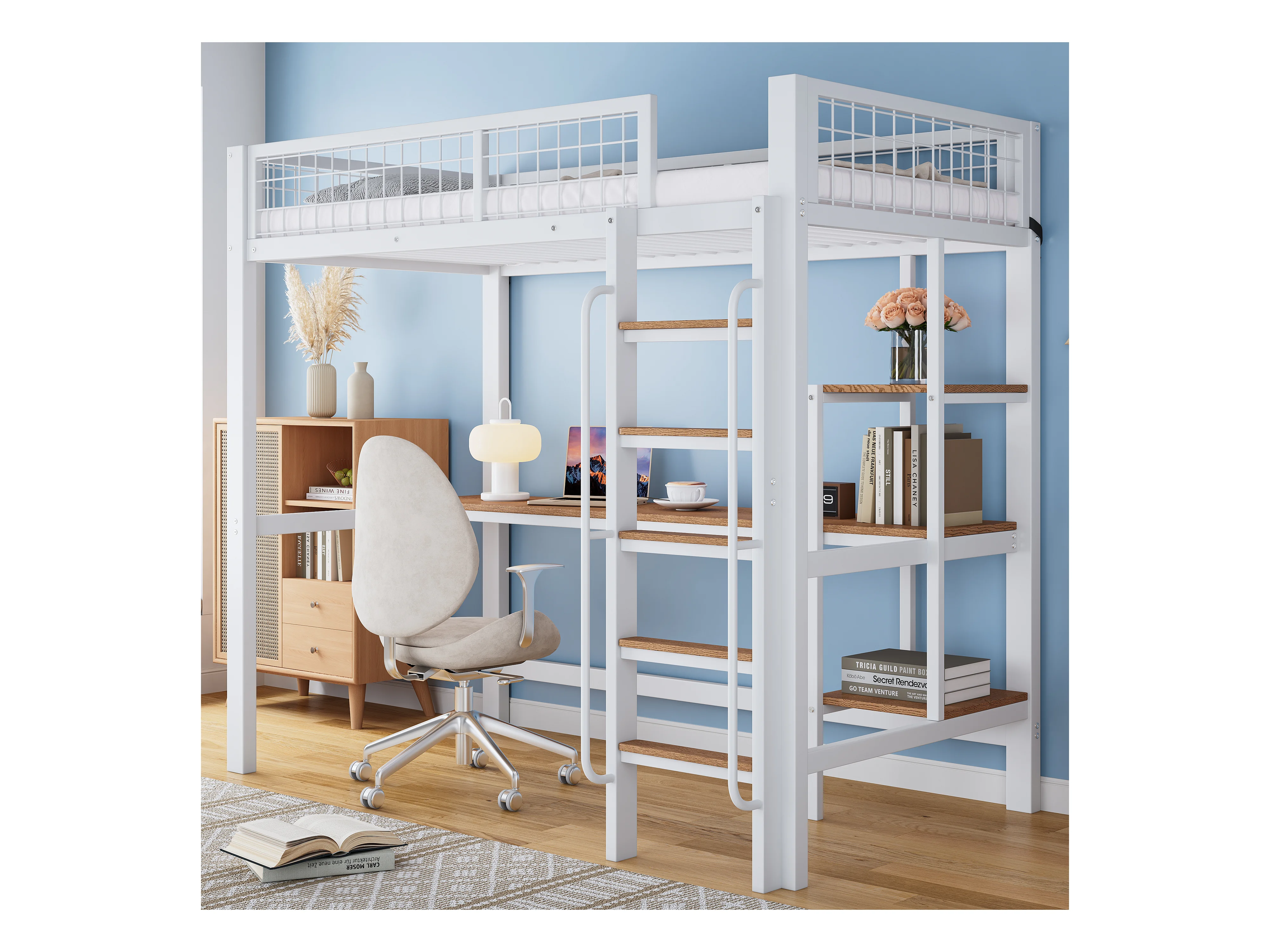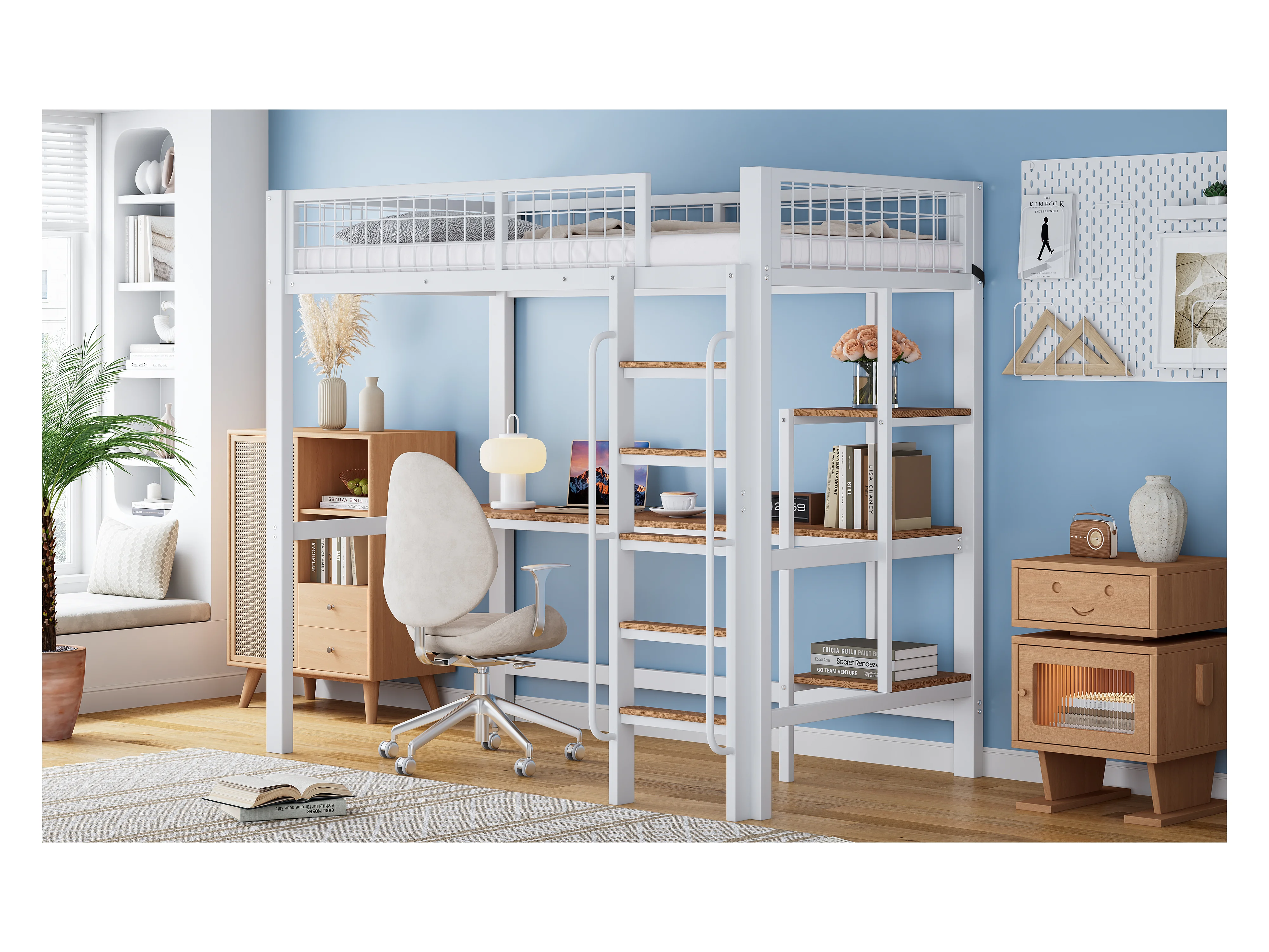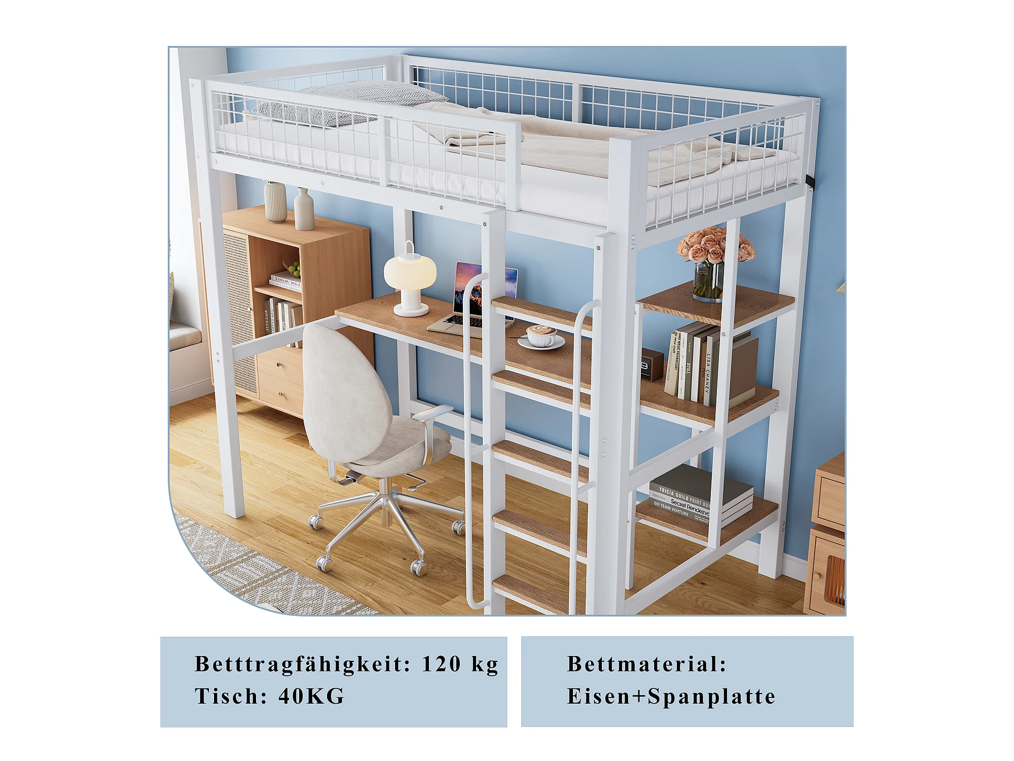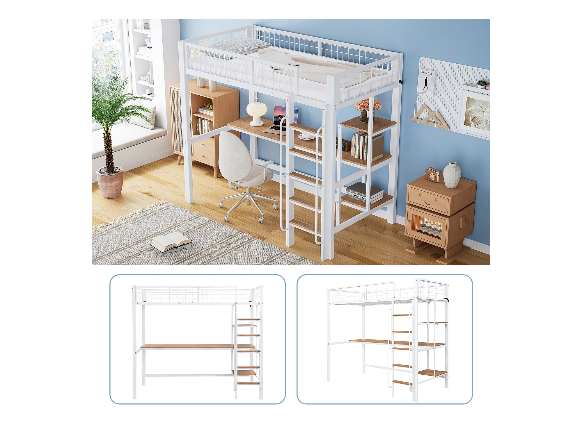 Lit mezzanine 90 x 200 cm avec bureau et étagères - Métal + MDF - Blanc + naturel (sans matelas)
