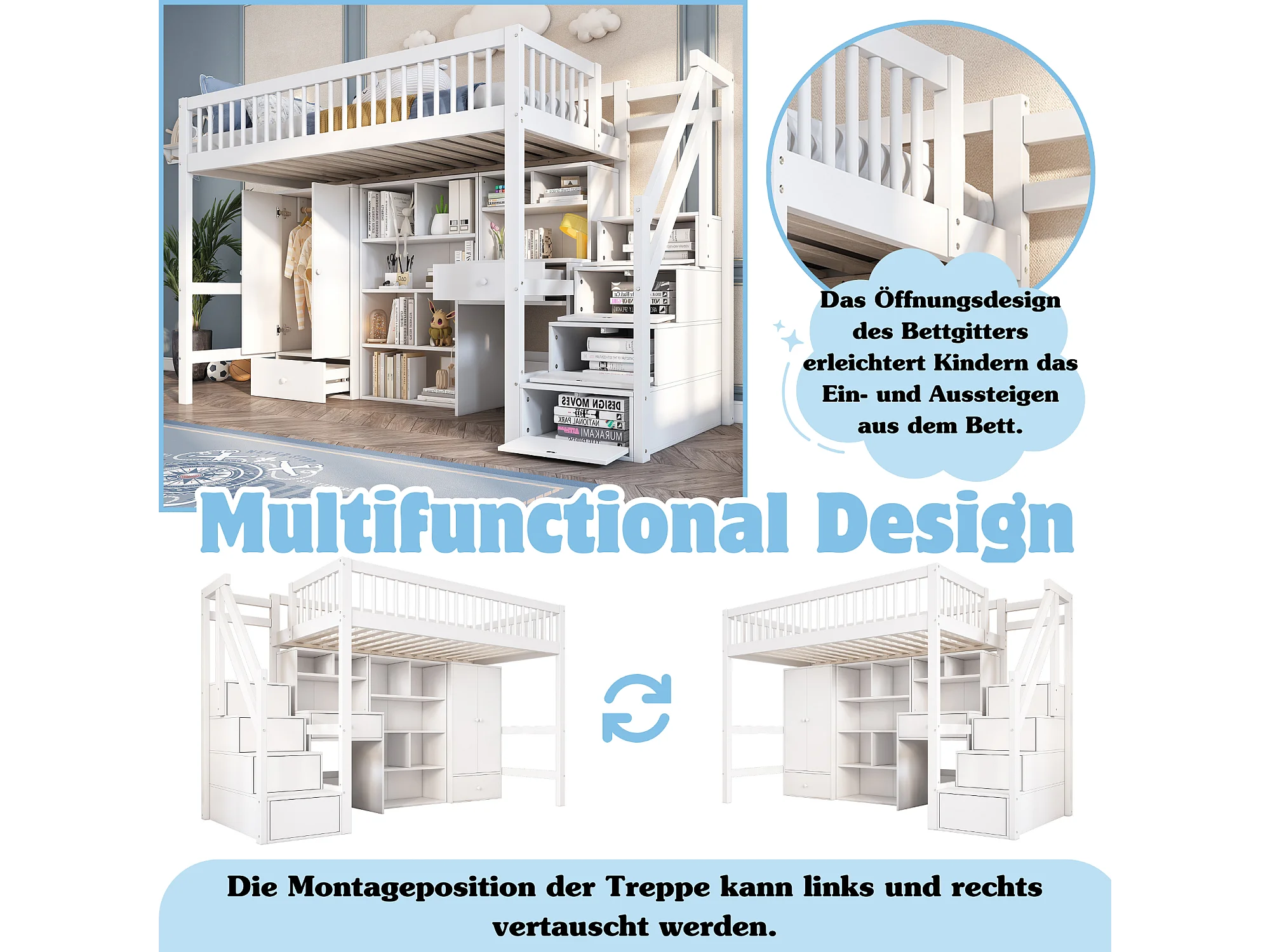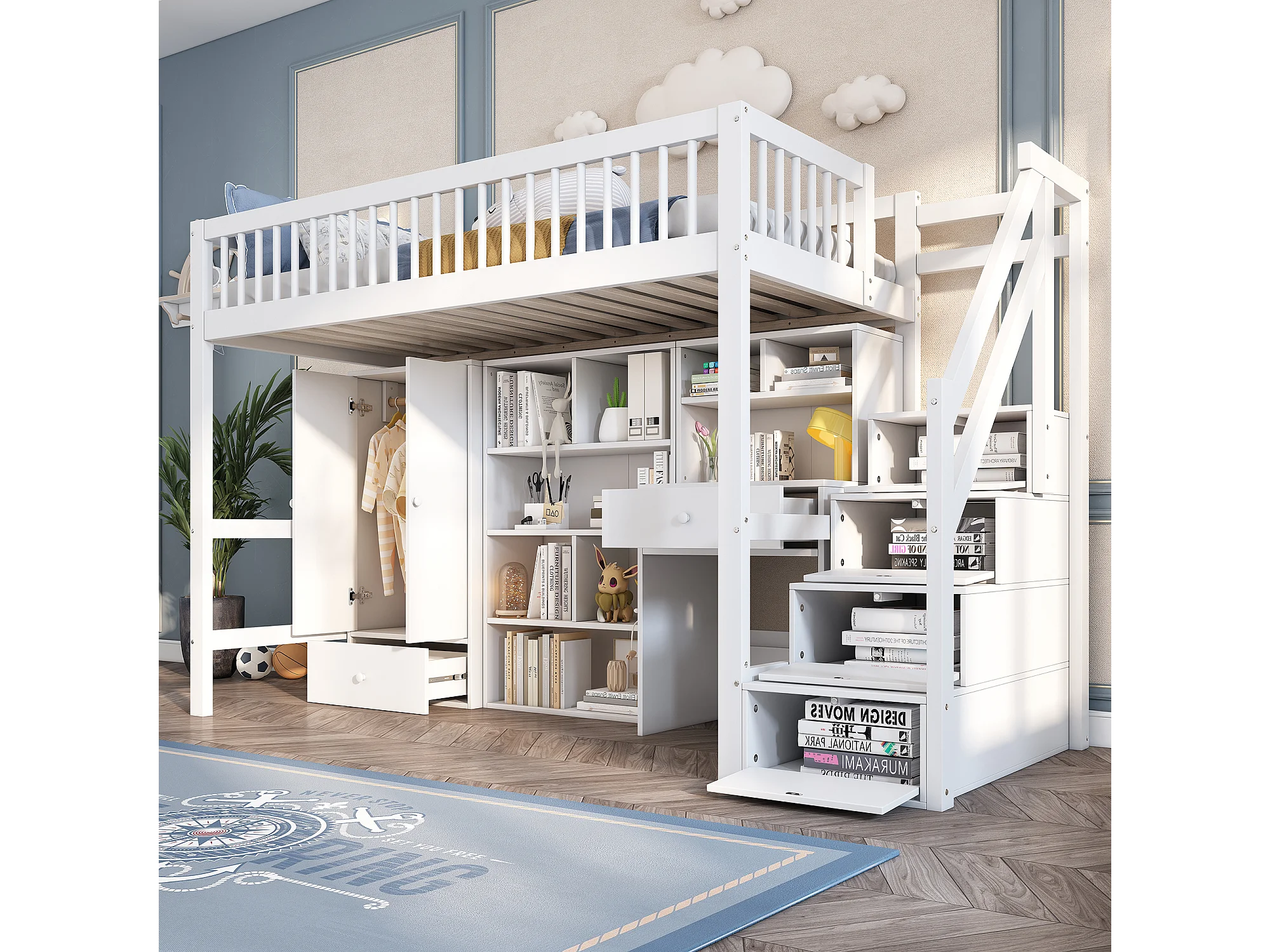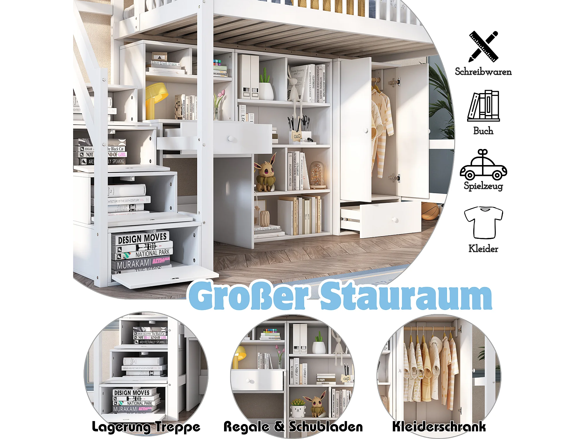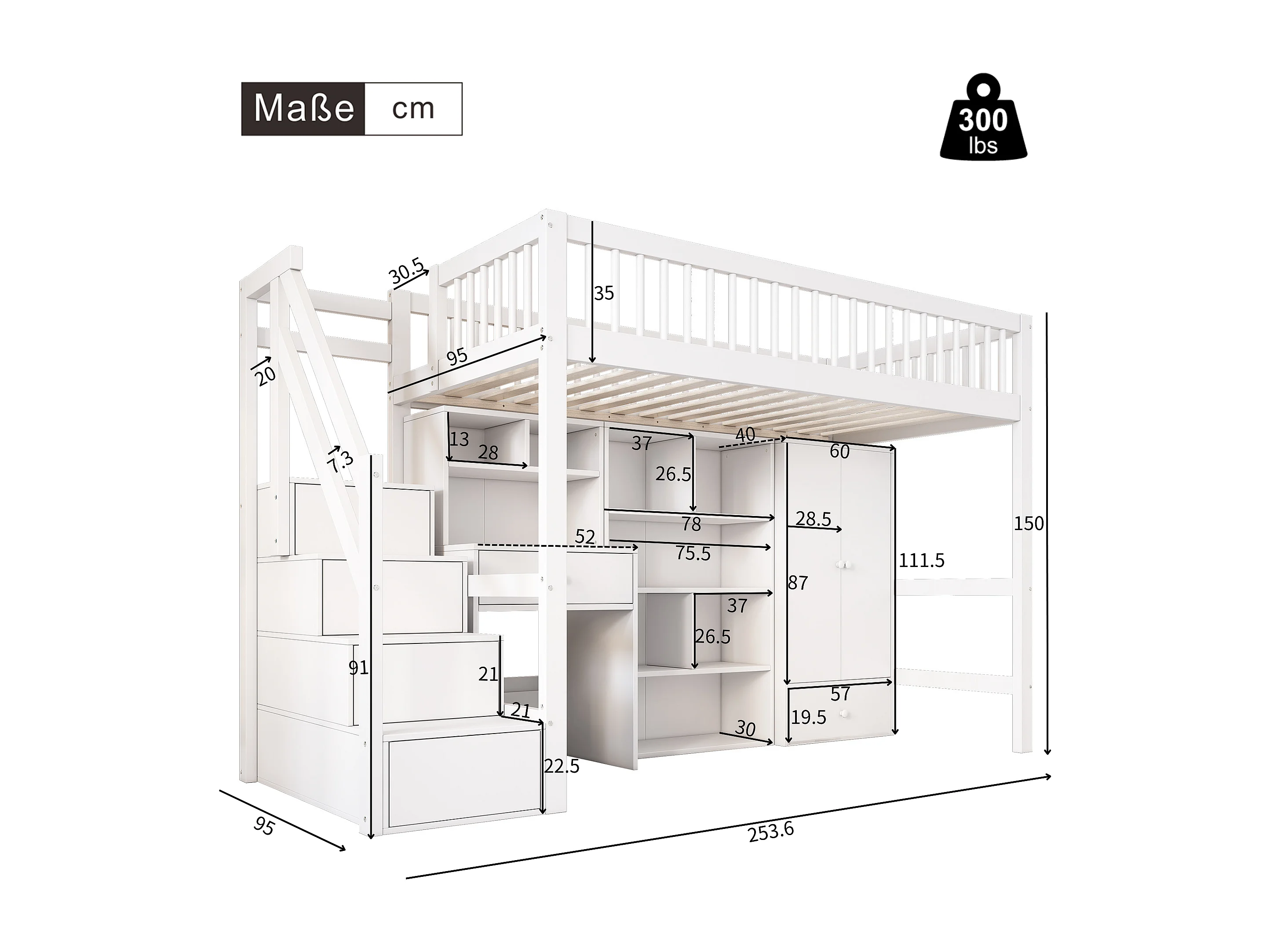 Lit mezzanine 90 x 200 cm avec bureau, étagères et armoir - bois massif - blanc