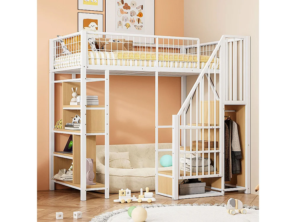 Lit mezzanine, 90 x 200 cm, lit métallique avec espace de rangement, étagère et échelle, blanc