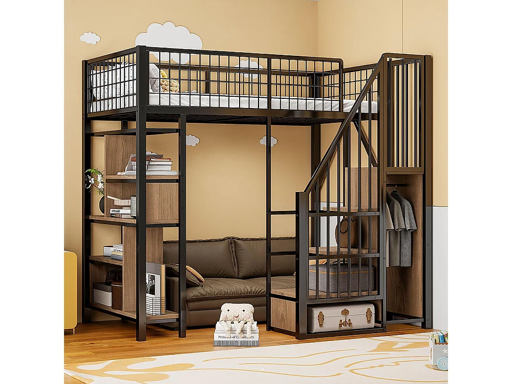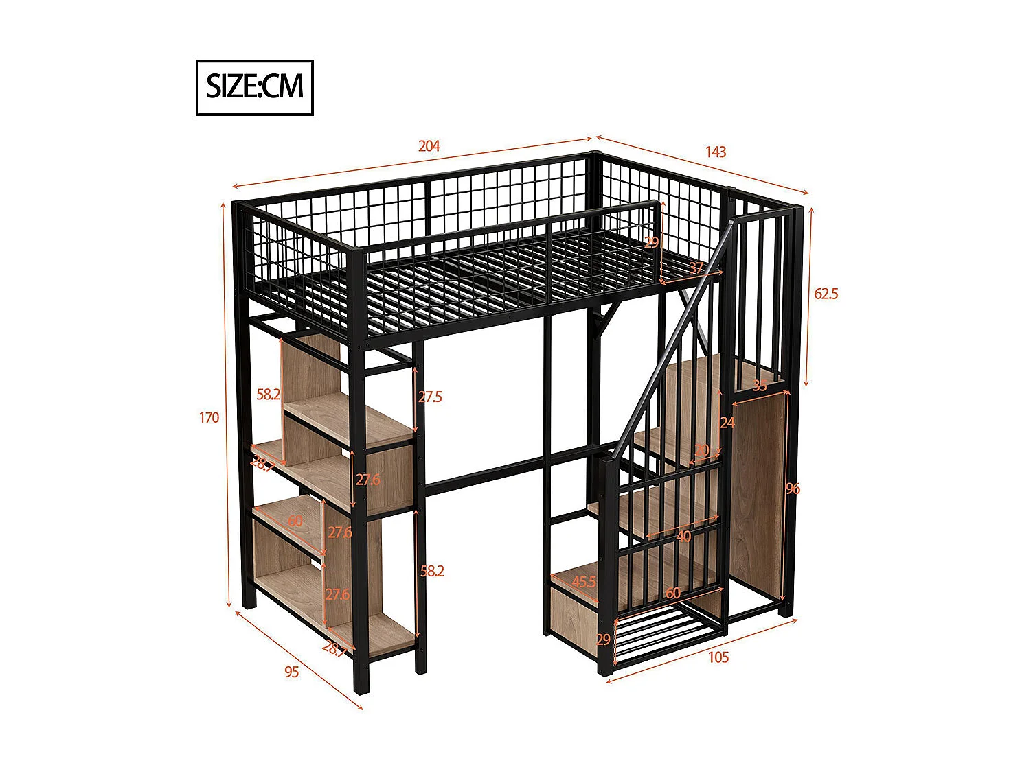 Lit mezzanine, 90 x 200 cm, lit métallique avec espace de rangement, étagère et échelle, noir