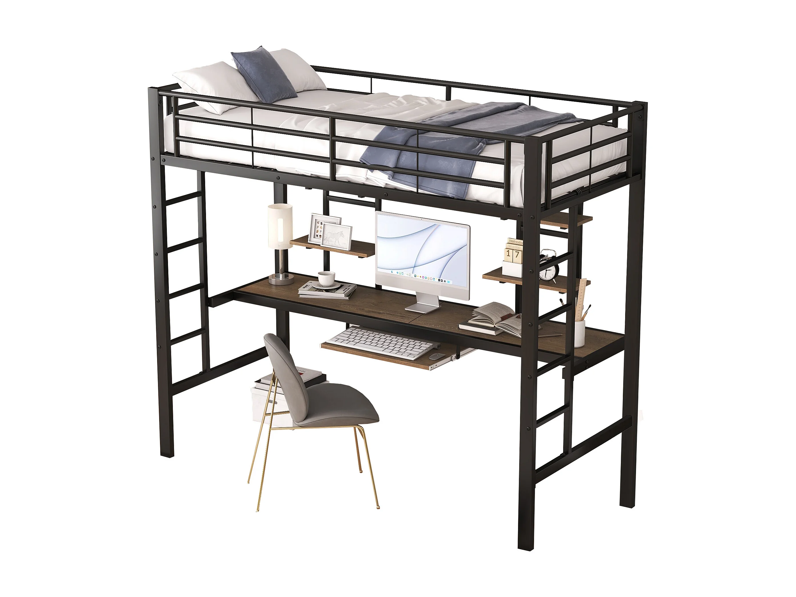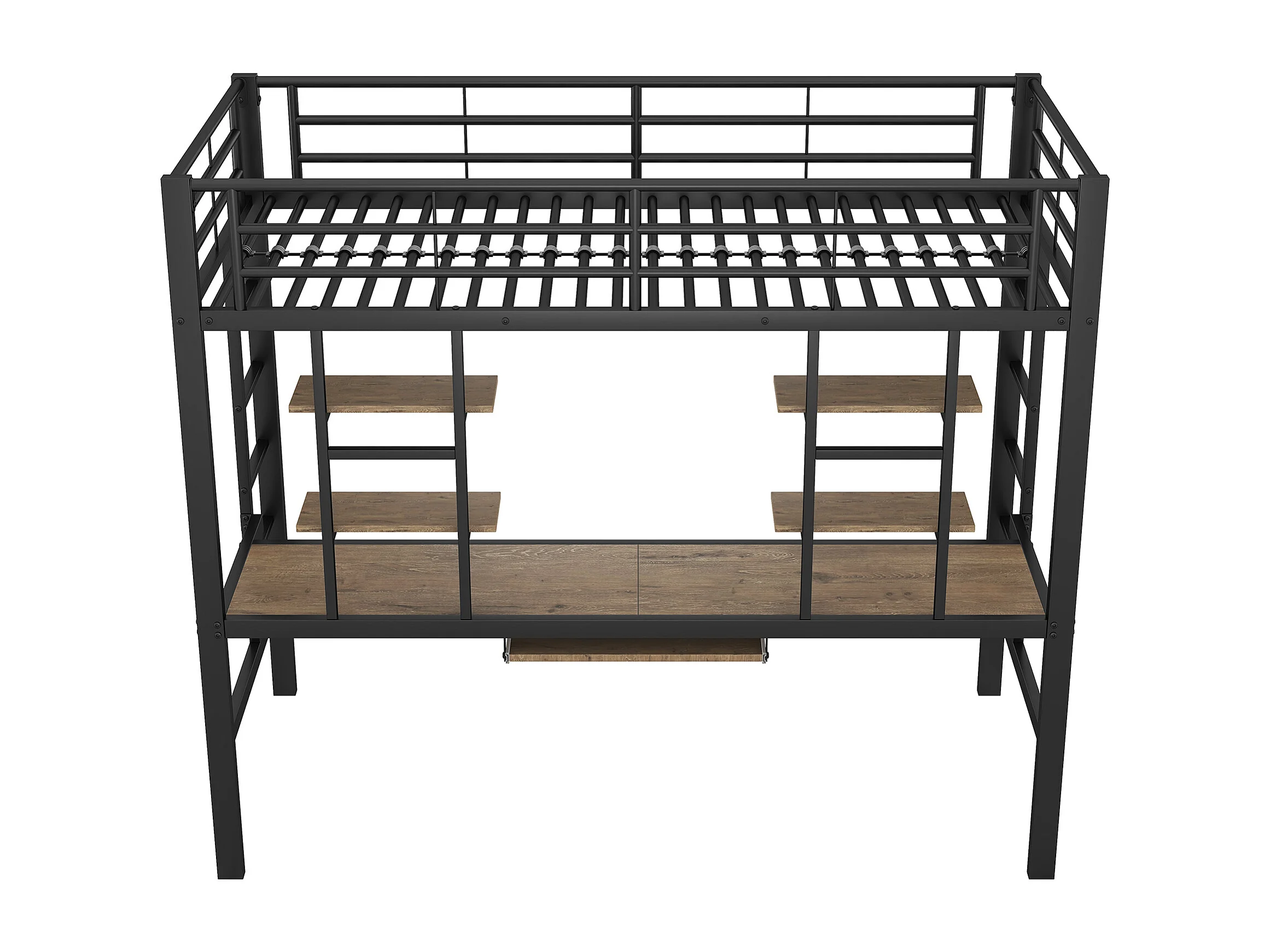 Lit mezzanine 90 x 200 cm - Lit surélevé avec bureau et 2 étagères - En métal avec panneaux MDF - Garde-corps sécurisé - Noir - Sans matelas