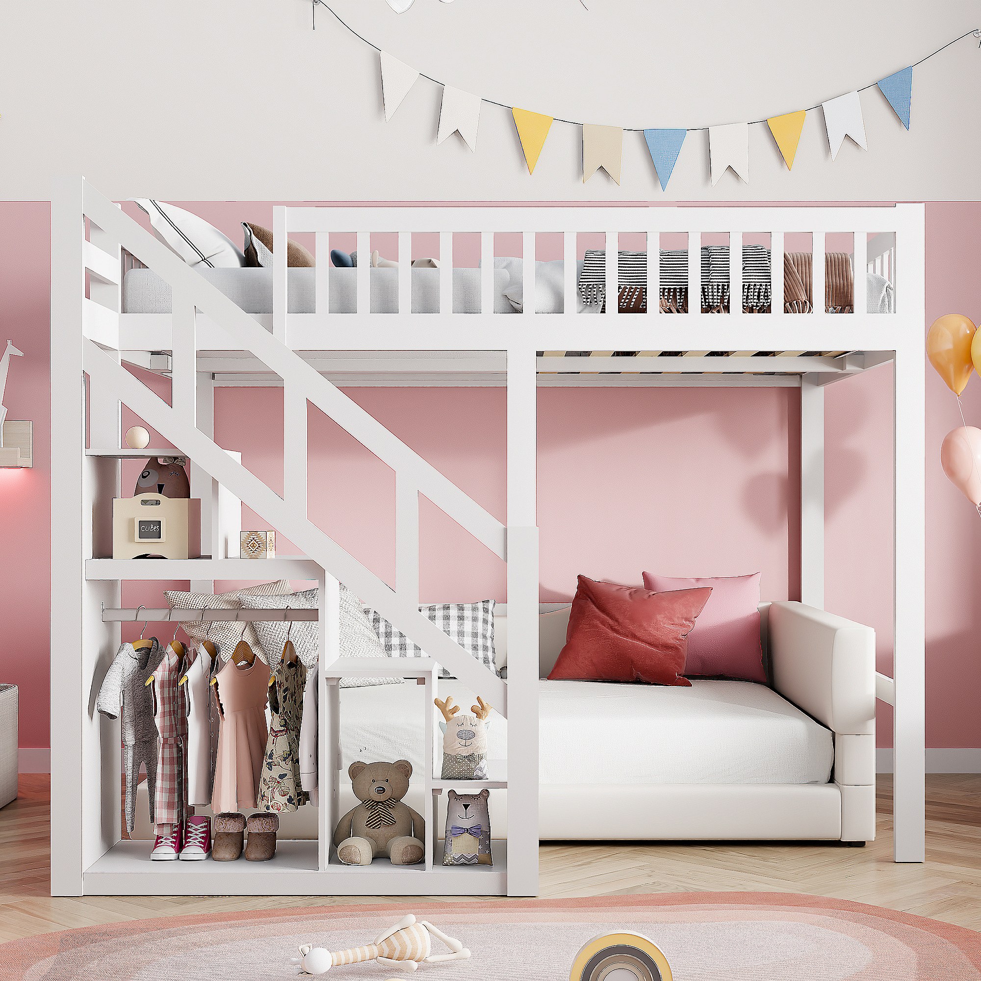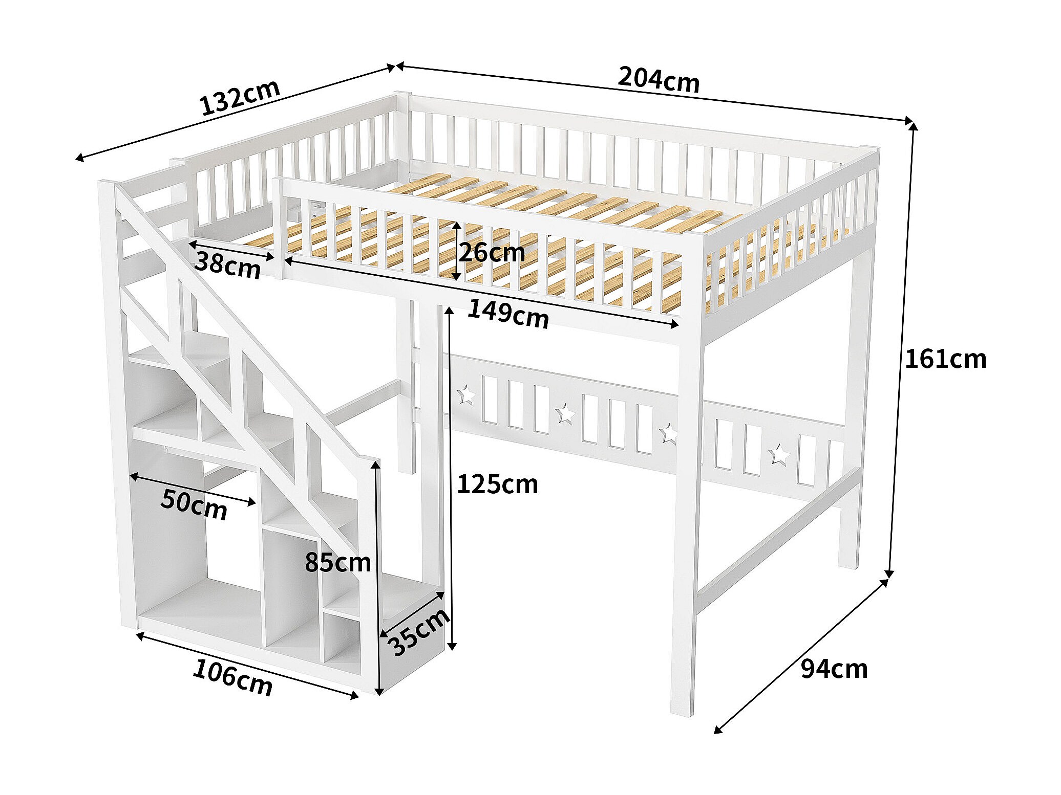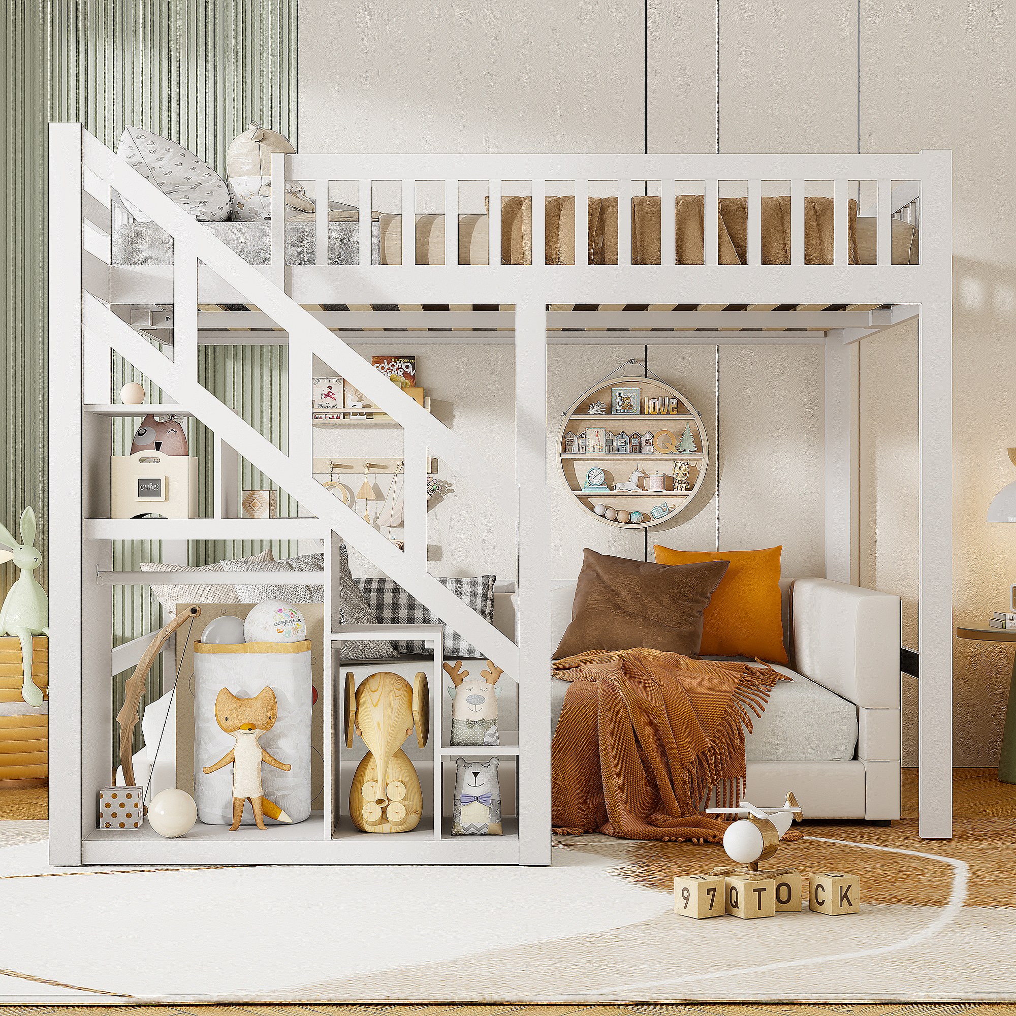 Lit Mezzanine 90 x 200 cm, Multifonction Lit Enfant avec Espace de Rangement Escalier, Blanc