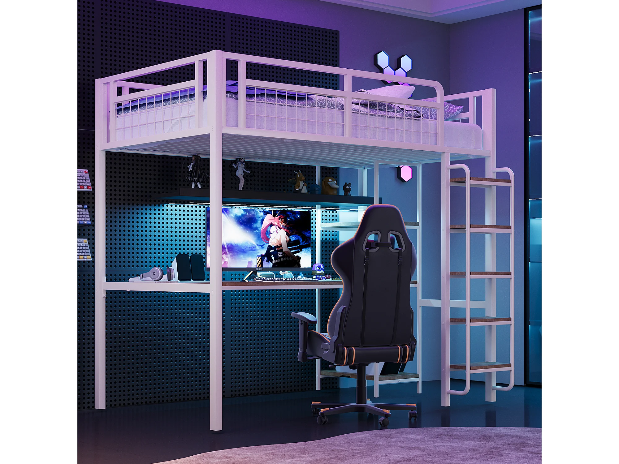 Lit mezzanine 90x200 avec échelle lit enfant avec table et étagère barrière de sécurité grillagée en métal Blanc