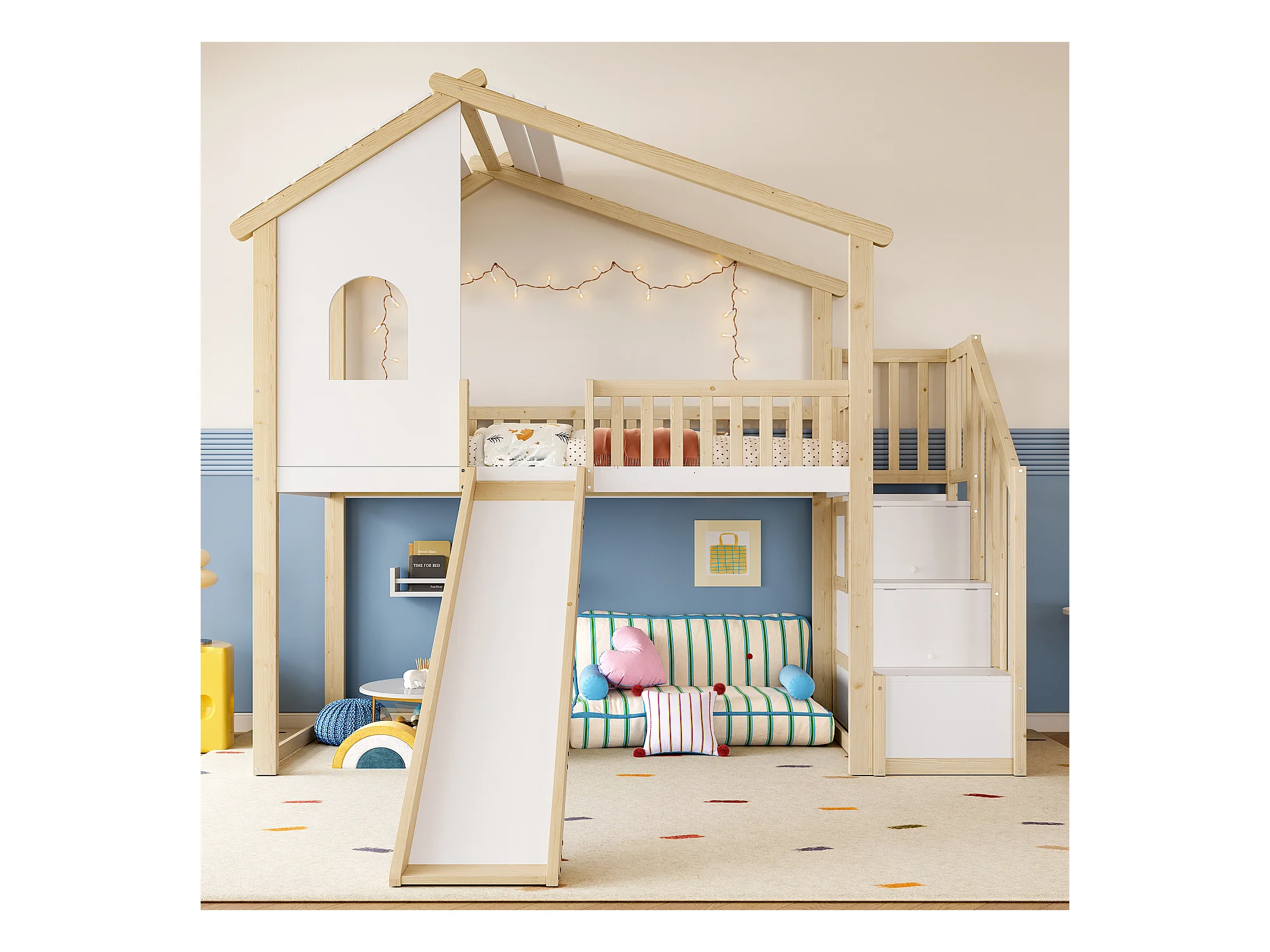 Lit mezzanine 90x200 cm avec barrières, échelle de rangement, fenêtres, toboggan, barreau maison, Nature + Blanc