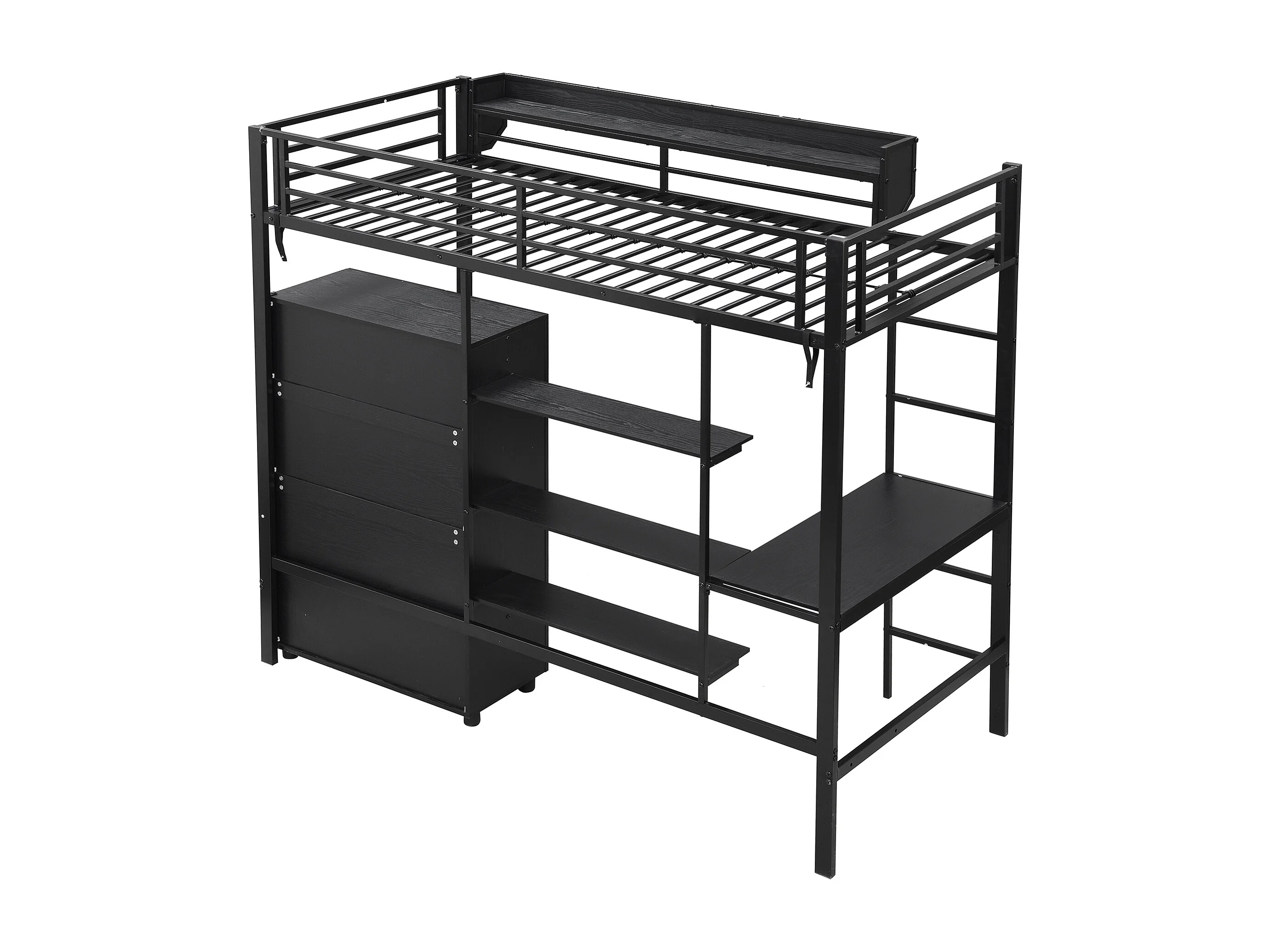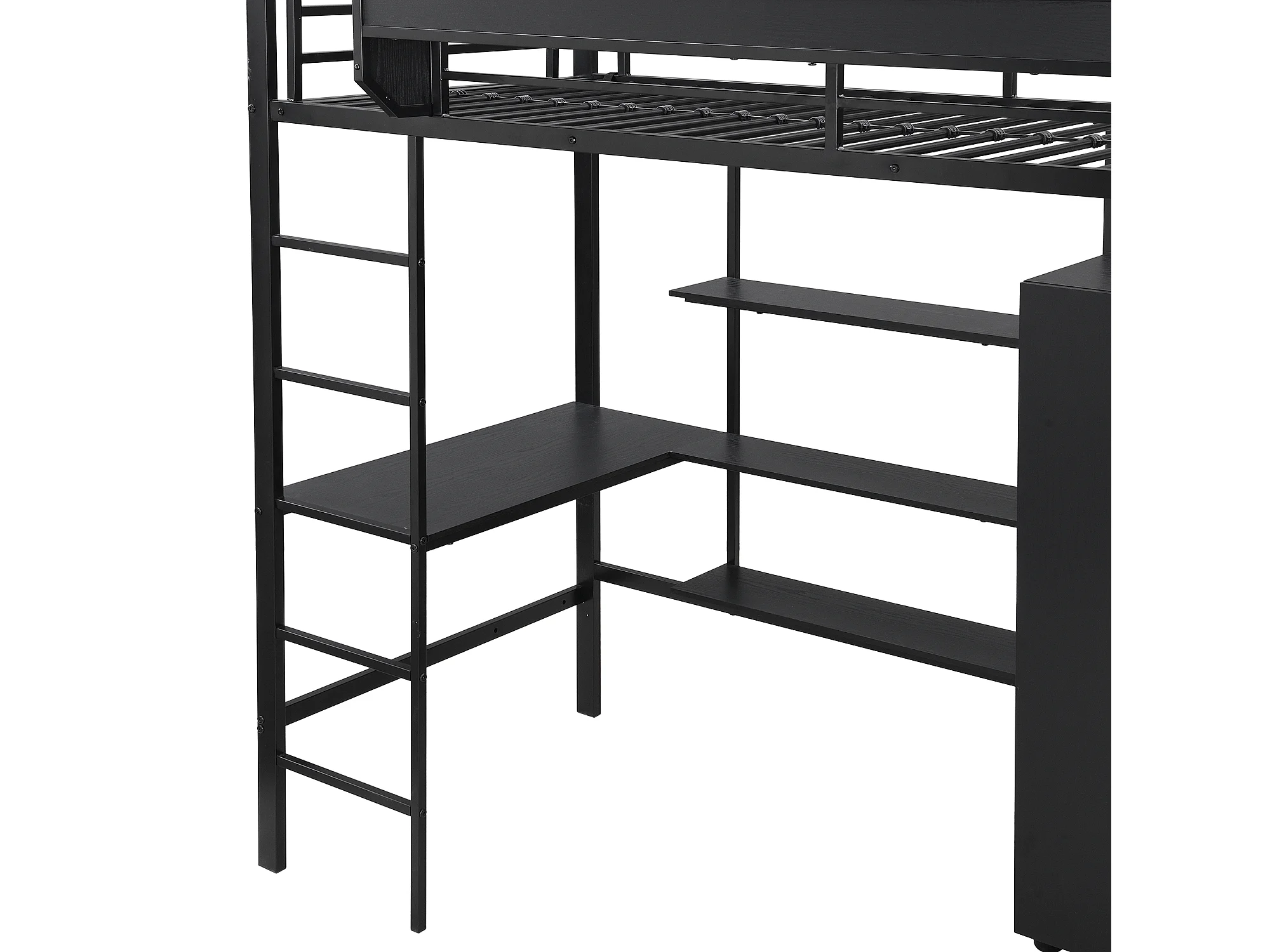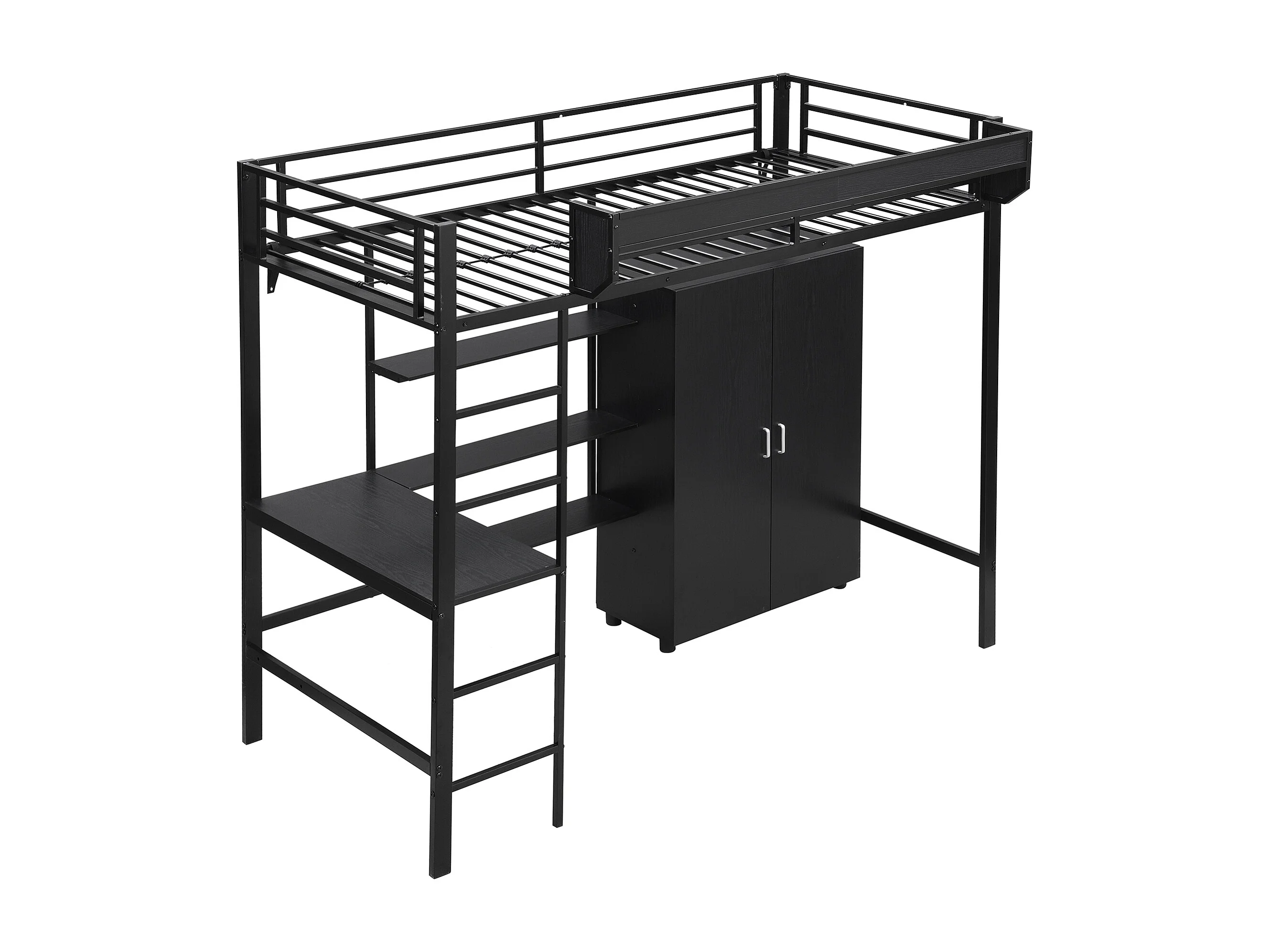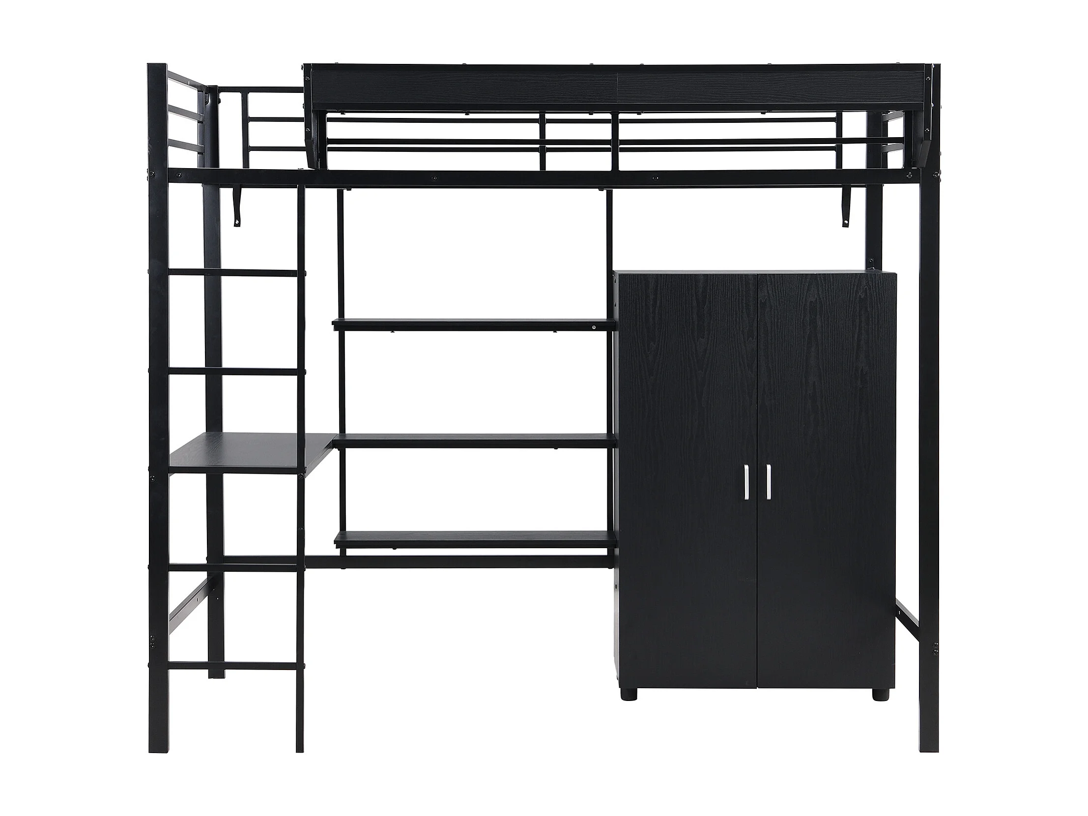 Lit mezzanine 90x200 cm avec bureau et armoire - MDF + métal noir