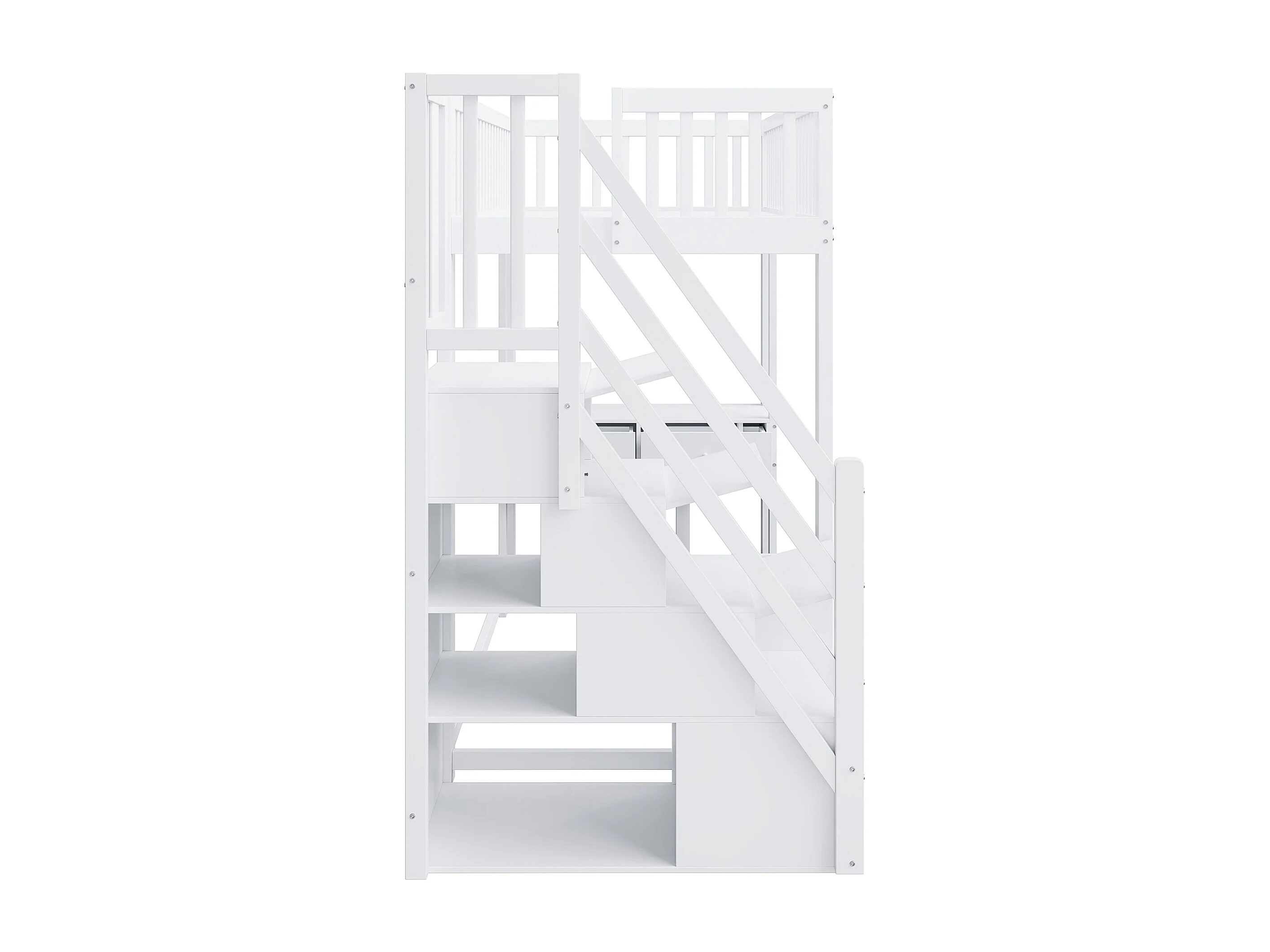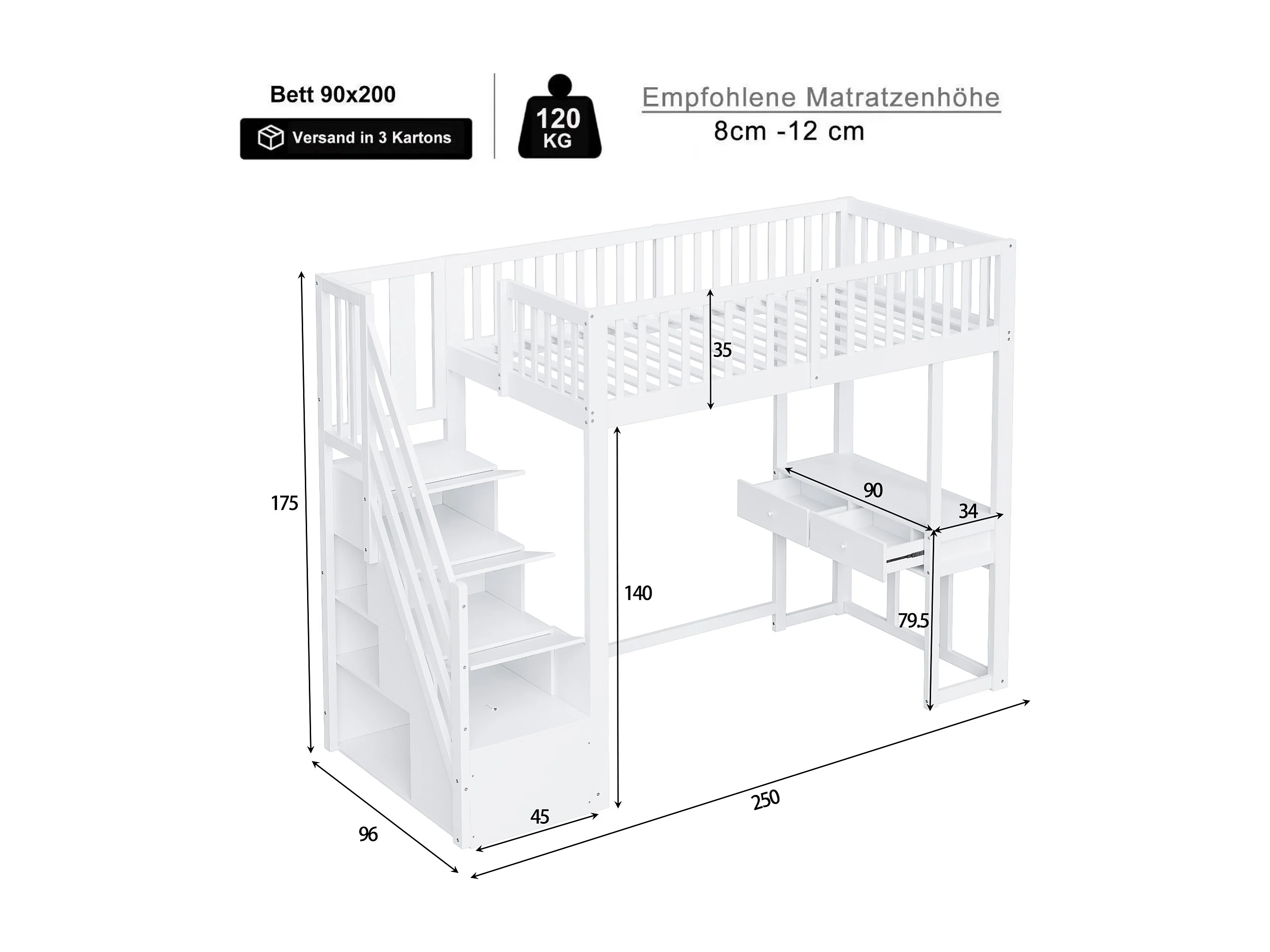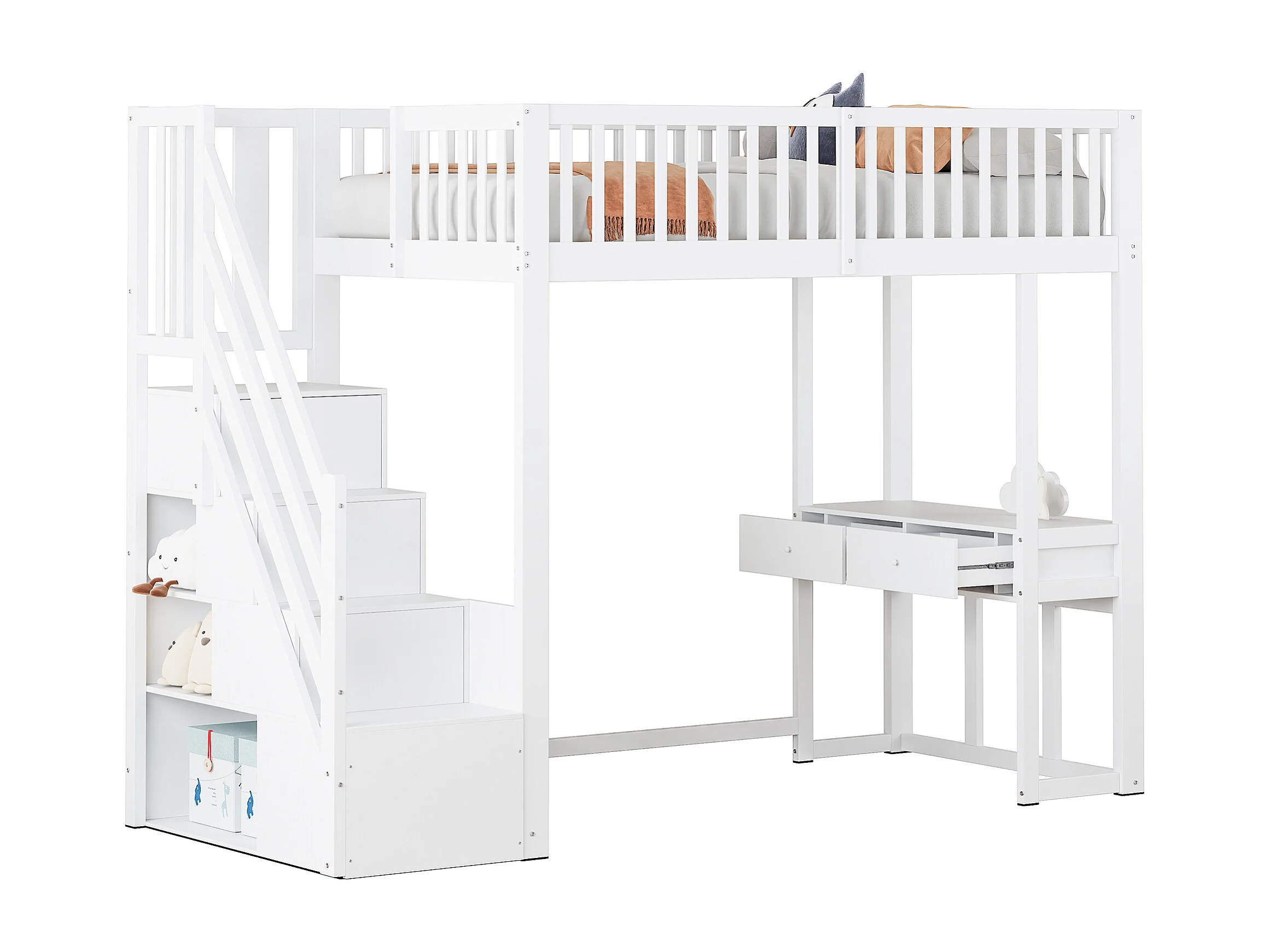 Lit mezzanine 90x200 cm avec bureau multifonction et escalier de rangement sécurisé, bois de pin massif blanc