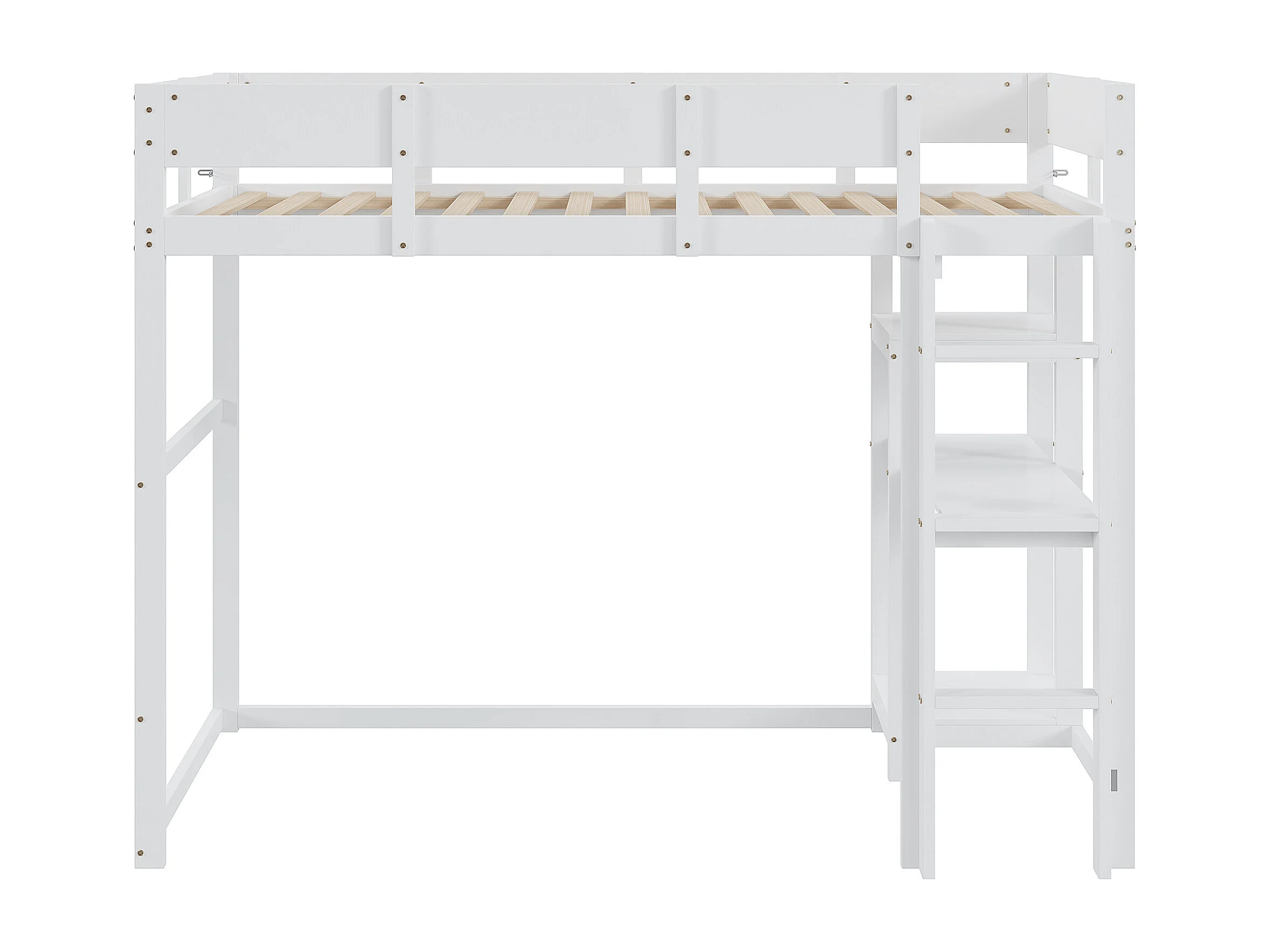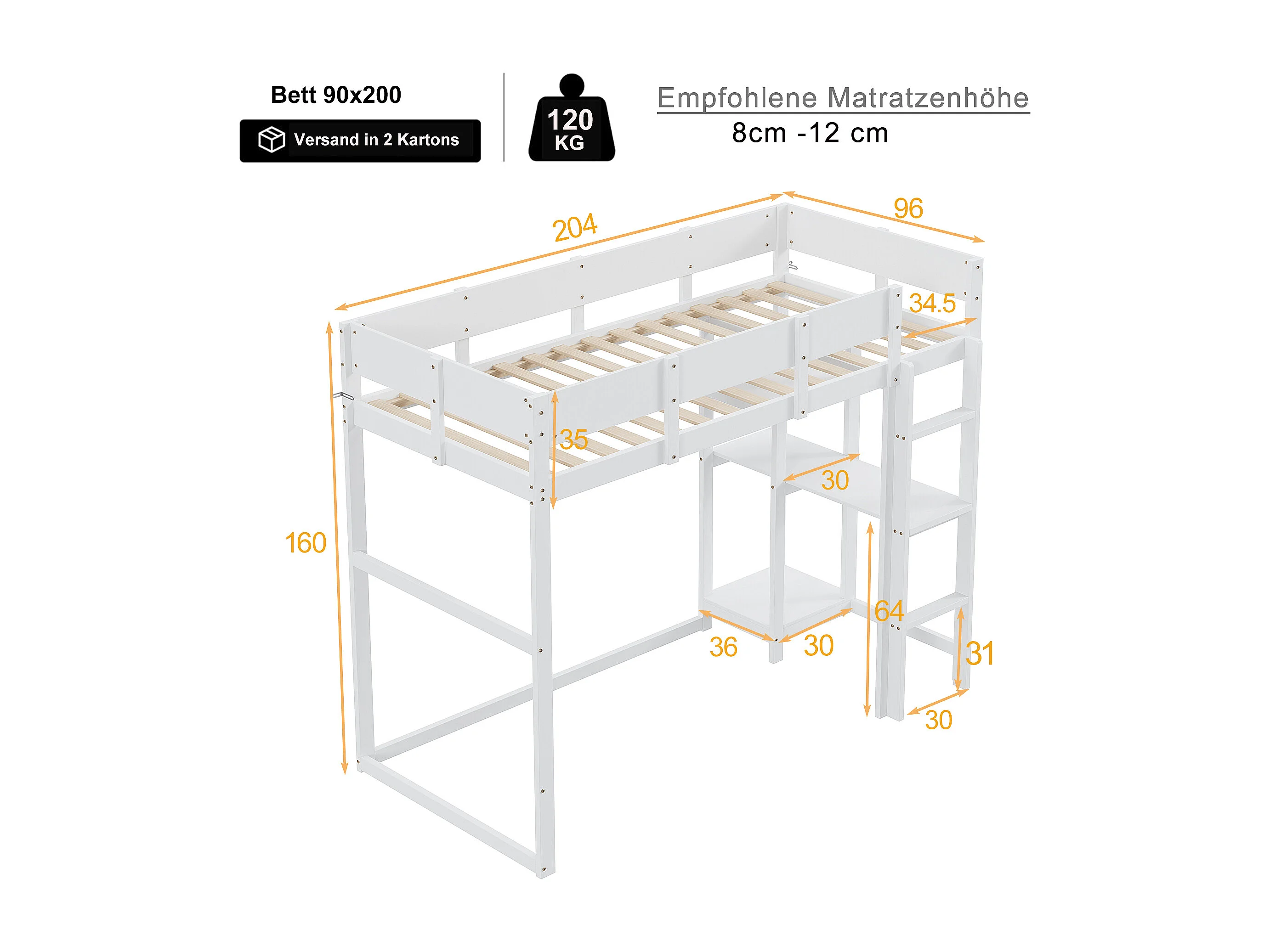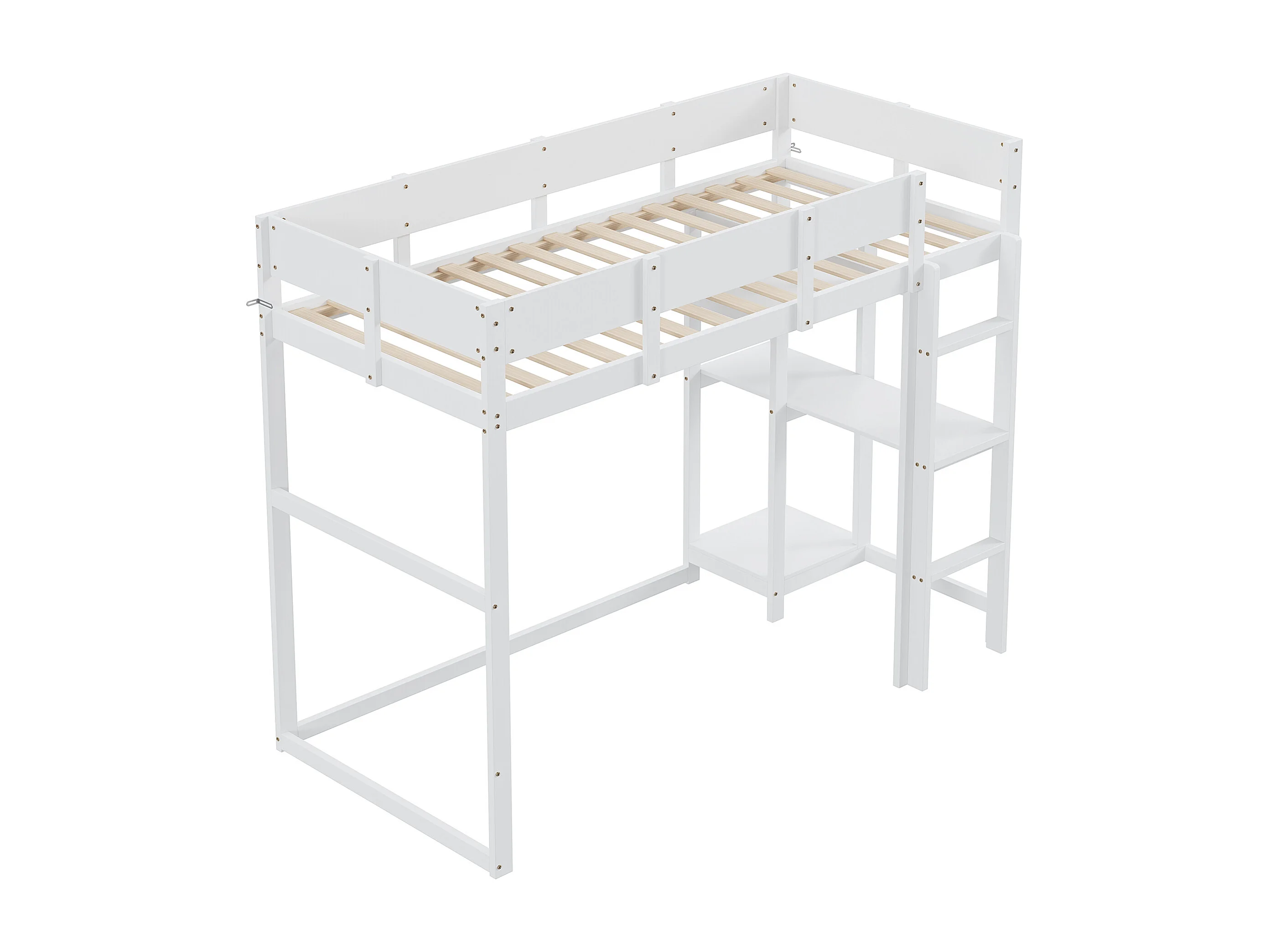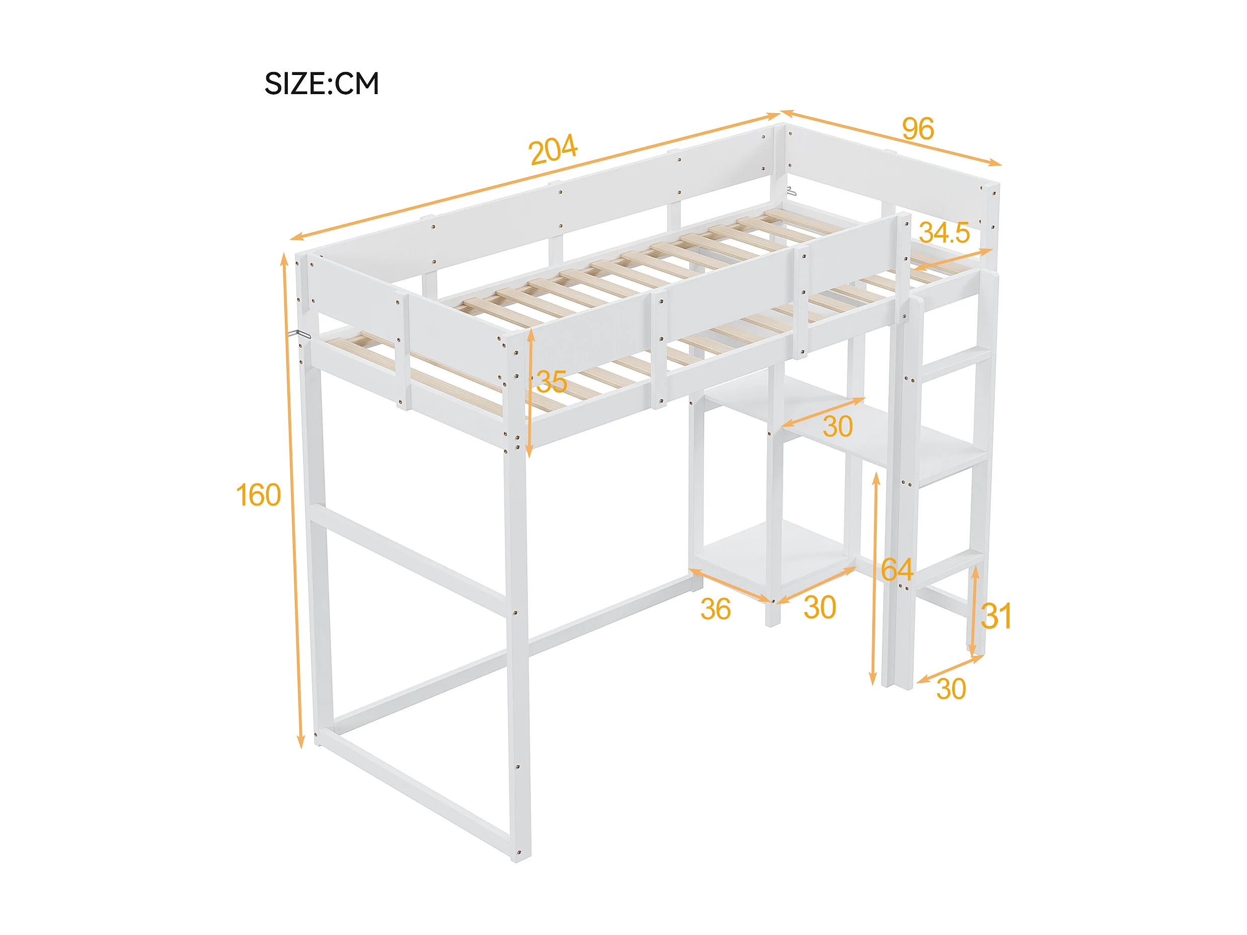 Lit mezzanine 90x200 cm avec échelle, barrière de sécurité, étagère, bois blanc, sans matelas