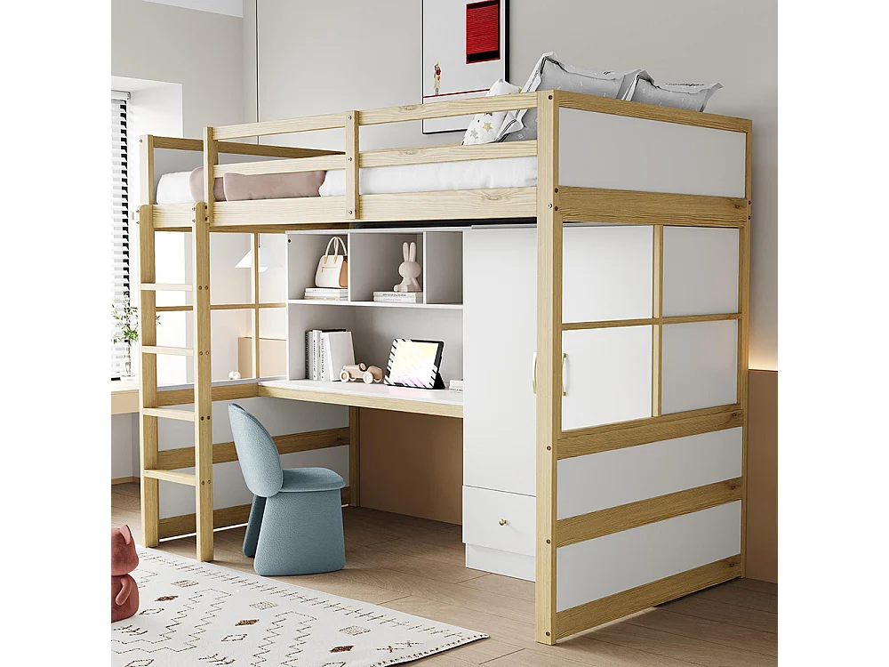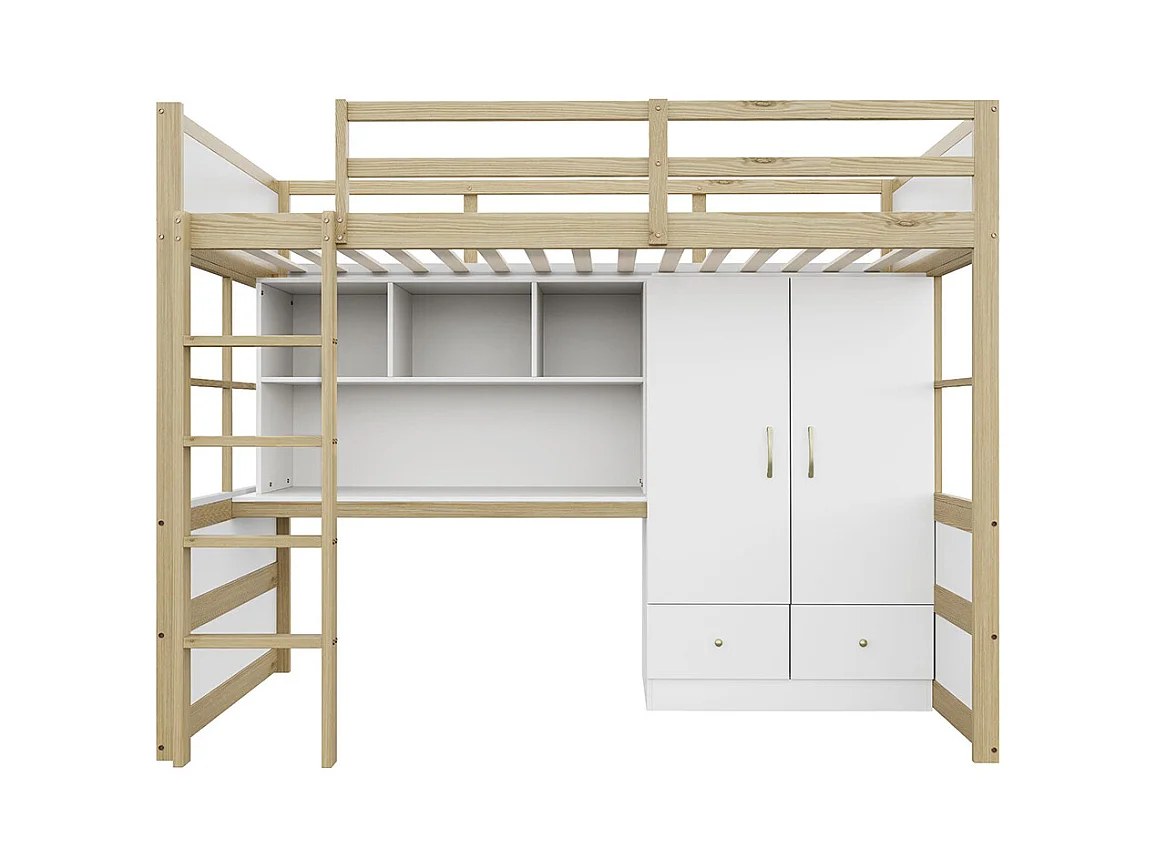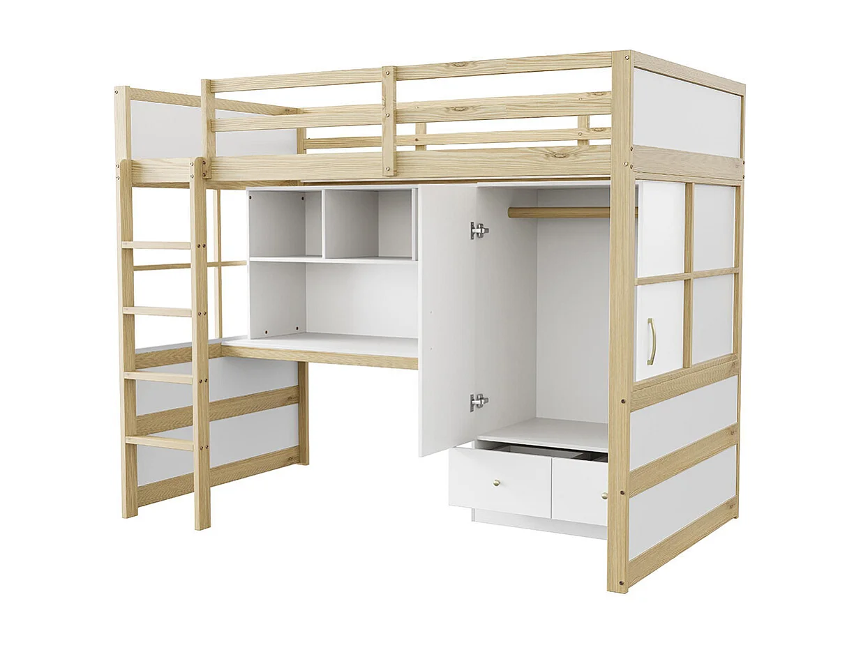 Lit mezzanine 90x200 cm avec échelle bureau rangement armoire tiroirs pour enfant adolescent couleur bois