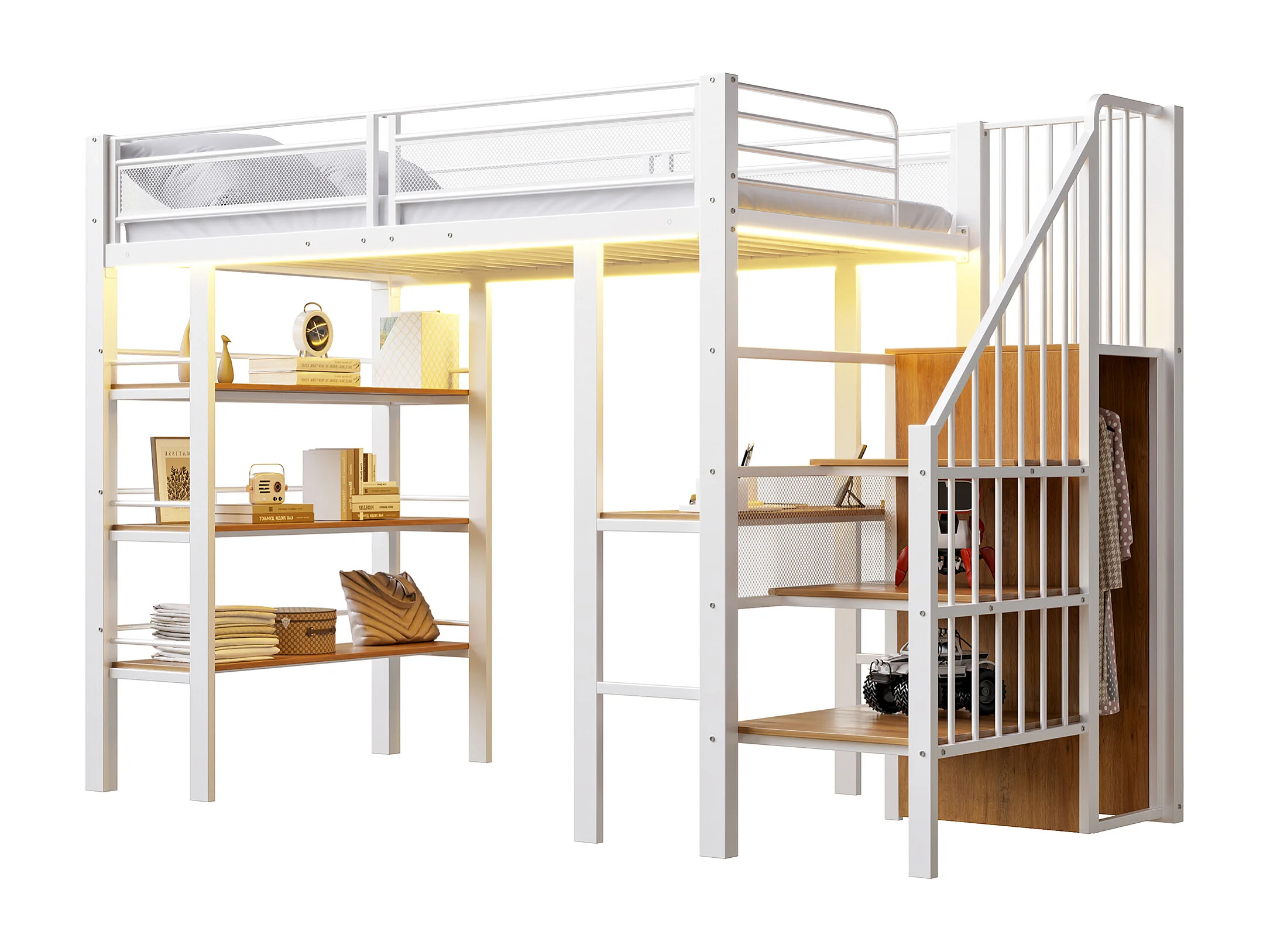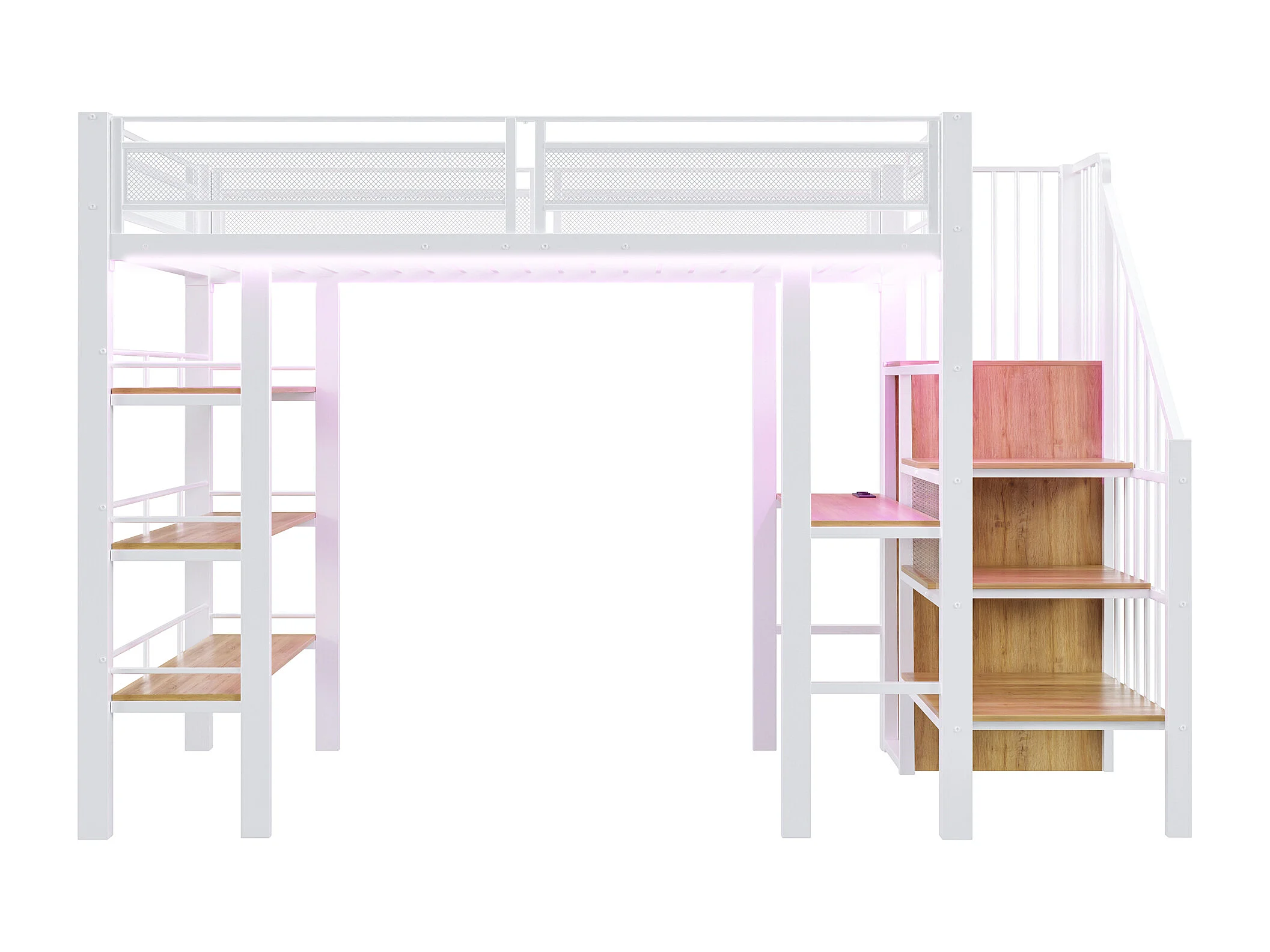 Lit mezzanine 90x200 cm - avec éclairage LED et prise électrique - avec compartiments de rangement - avec étagère - blanc (matelas non inclus)