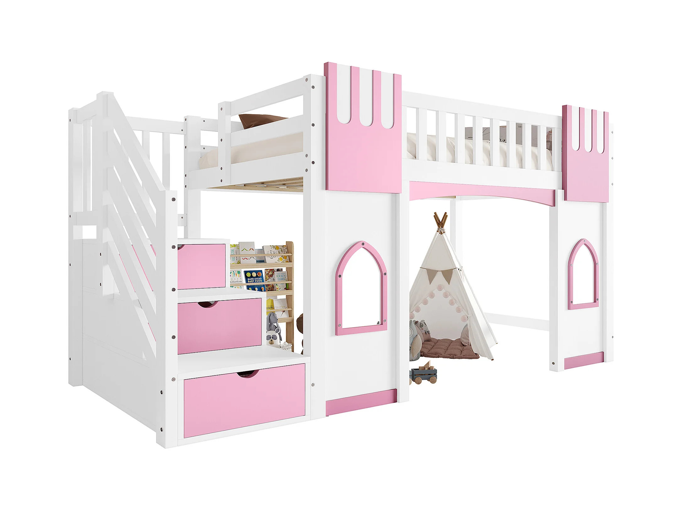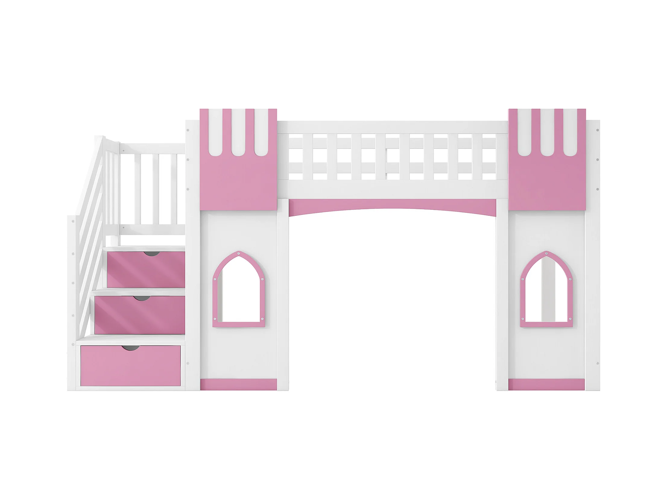 Lit mezzanine 90x200 cm - avec escalier de rangement - avec fenêtres décoratives - avec barrière de sécurité - MDF - Blanc + Rose