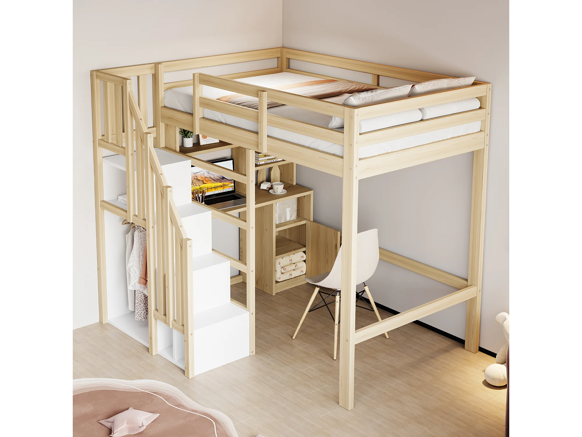 Lit mezzanine 90x200 cm - avec étagères - avec plan de travail - avec échelle - naturel (matelas non inclus)