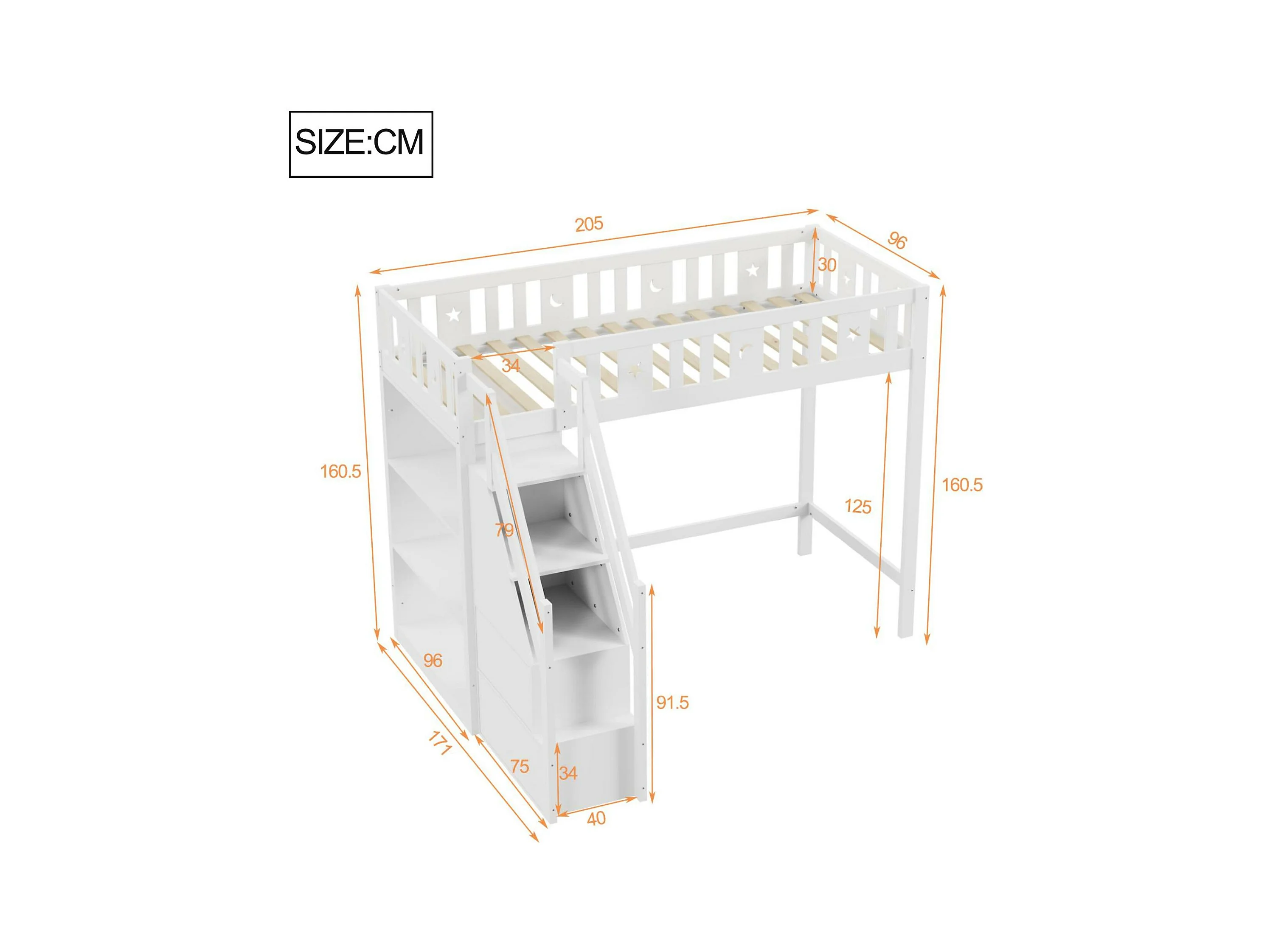Lit mezzanine 90x200 cm - avec étagères et échelle de rangement - en bois massif - Blanc