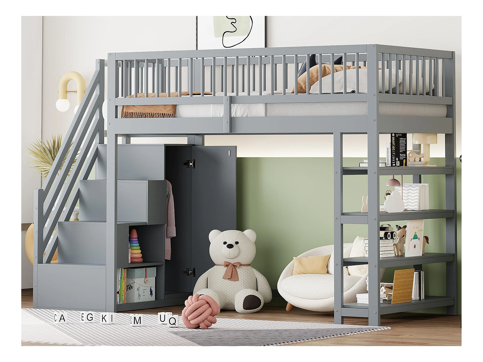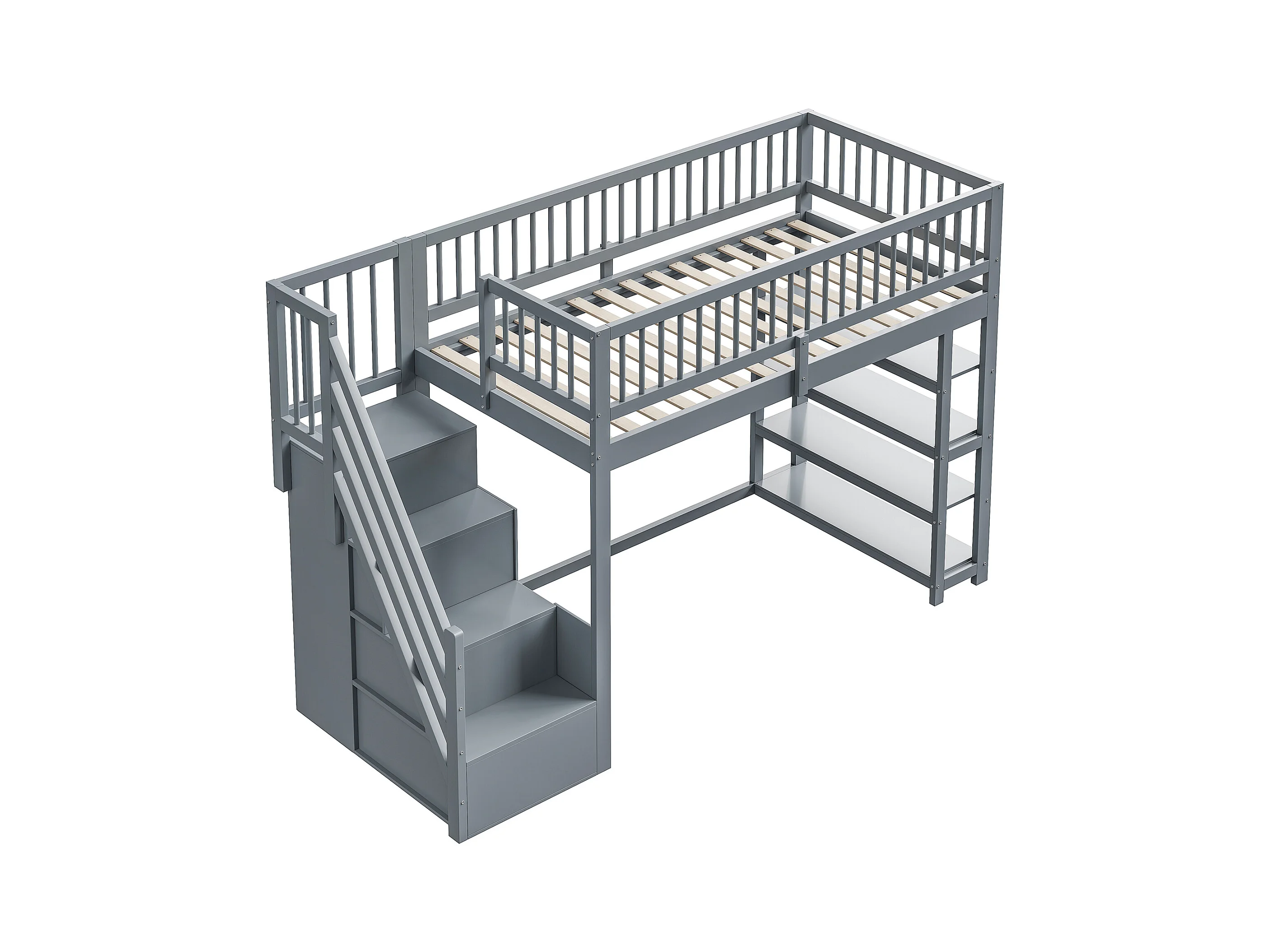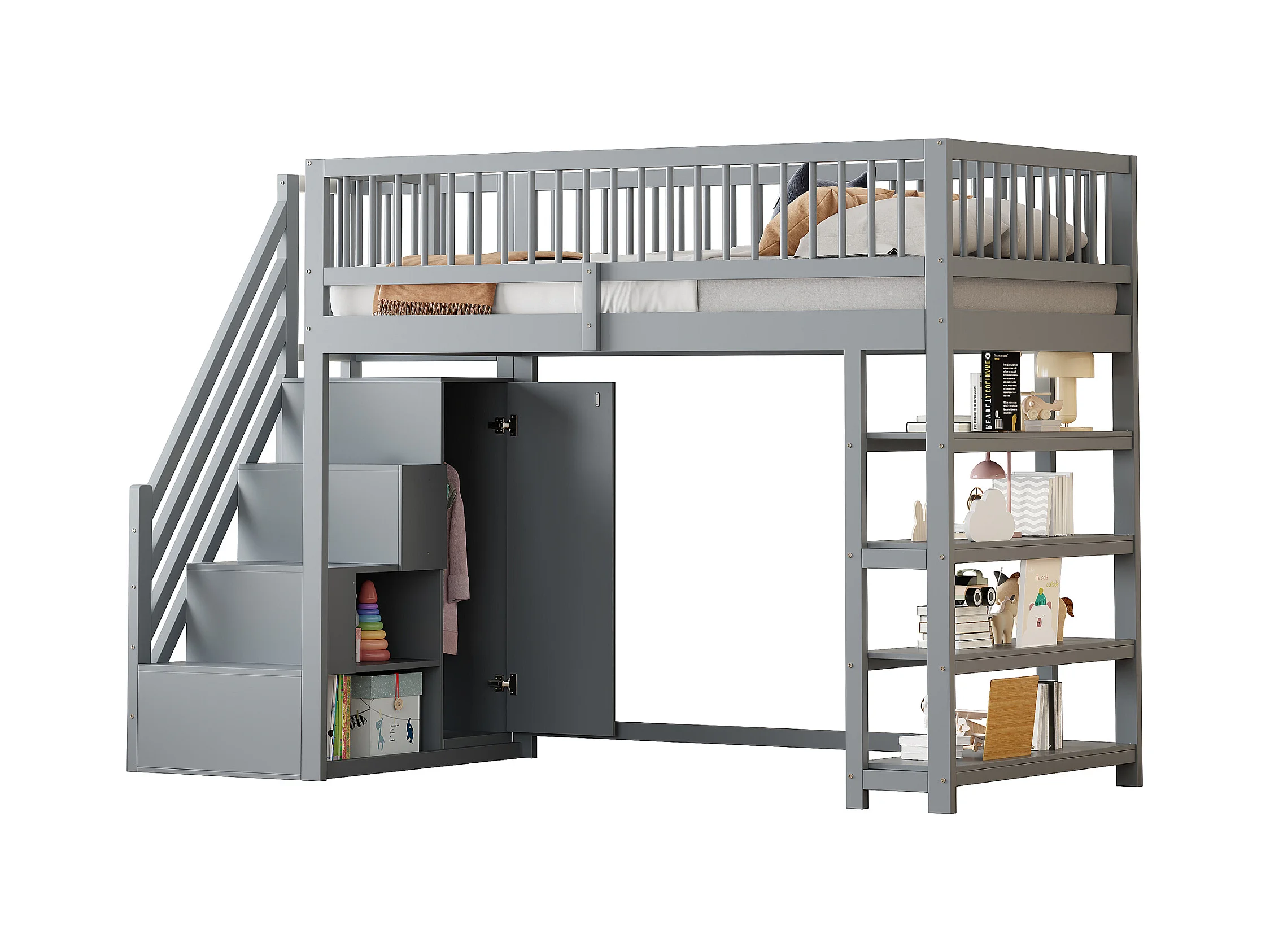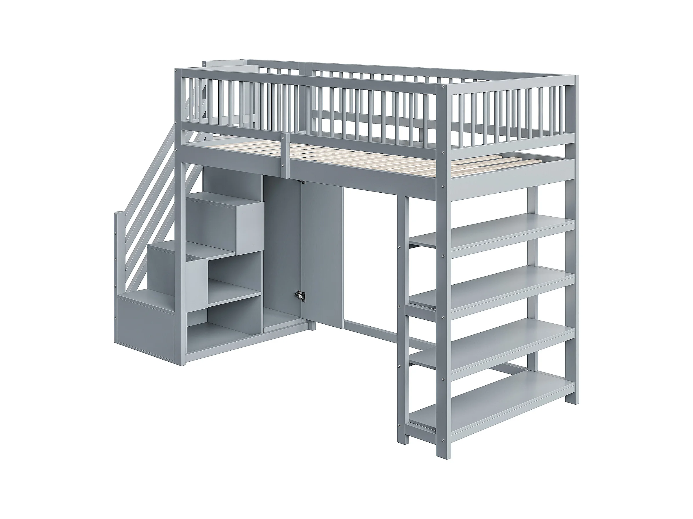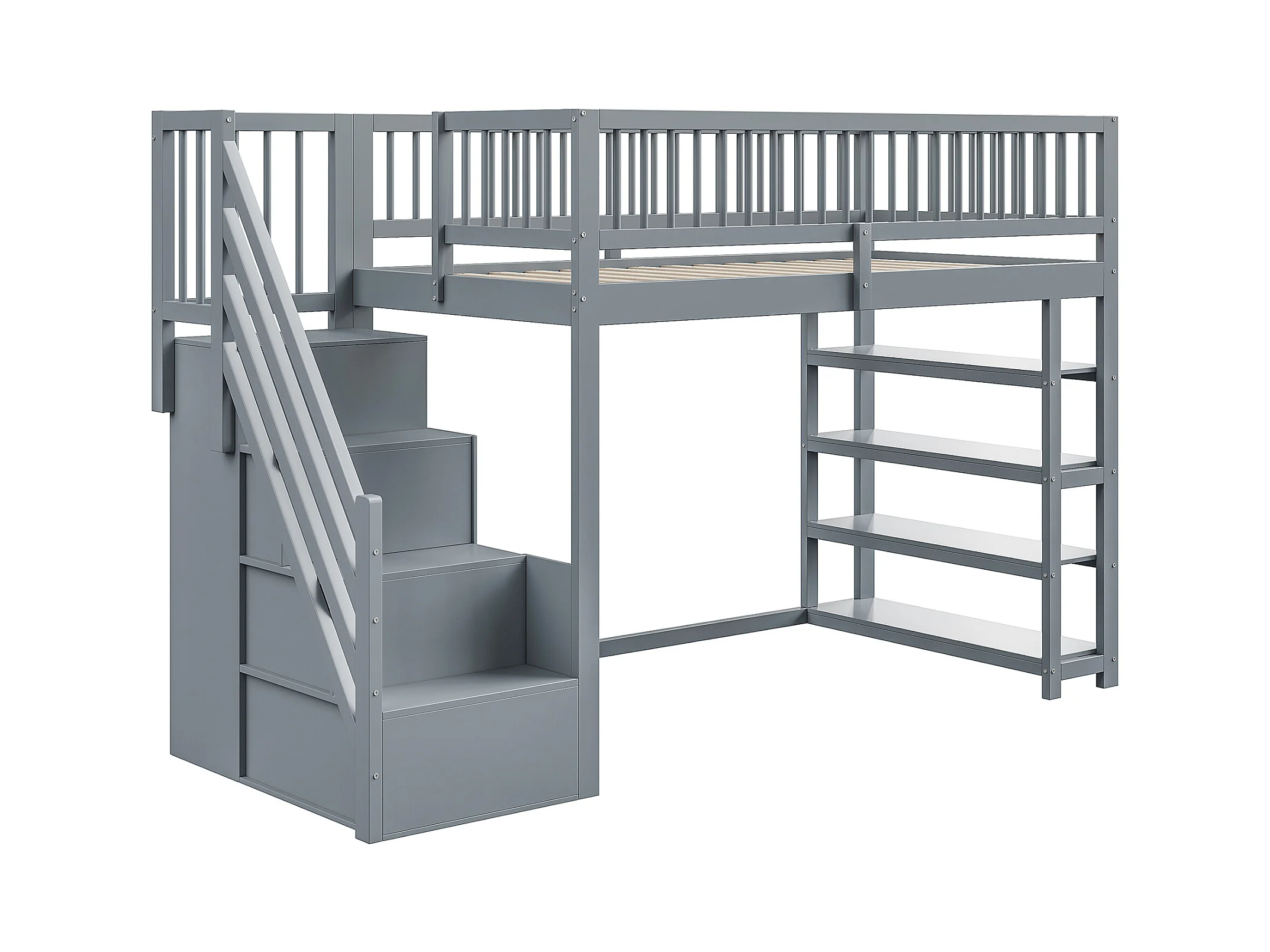 Lit mezzanine 90x200 cm - avec étagères et échelle de rangement - en bois massif - Gris
