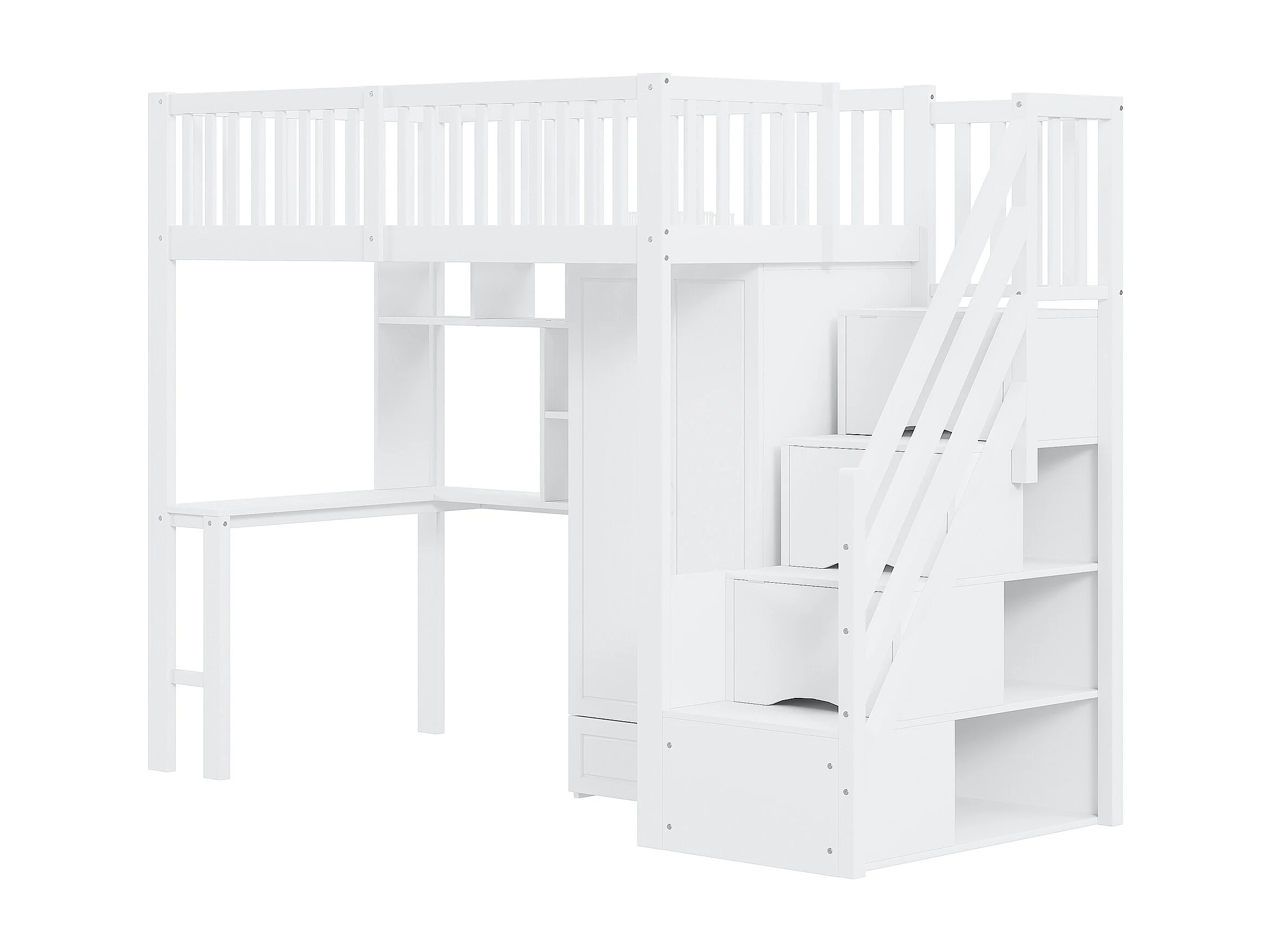 Lit mezzanine 90x200 cm avec grand dressing, étagères et bureau, escalier de rangement, bois blanc