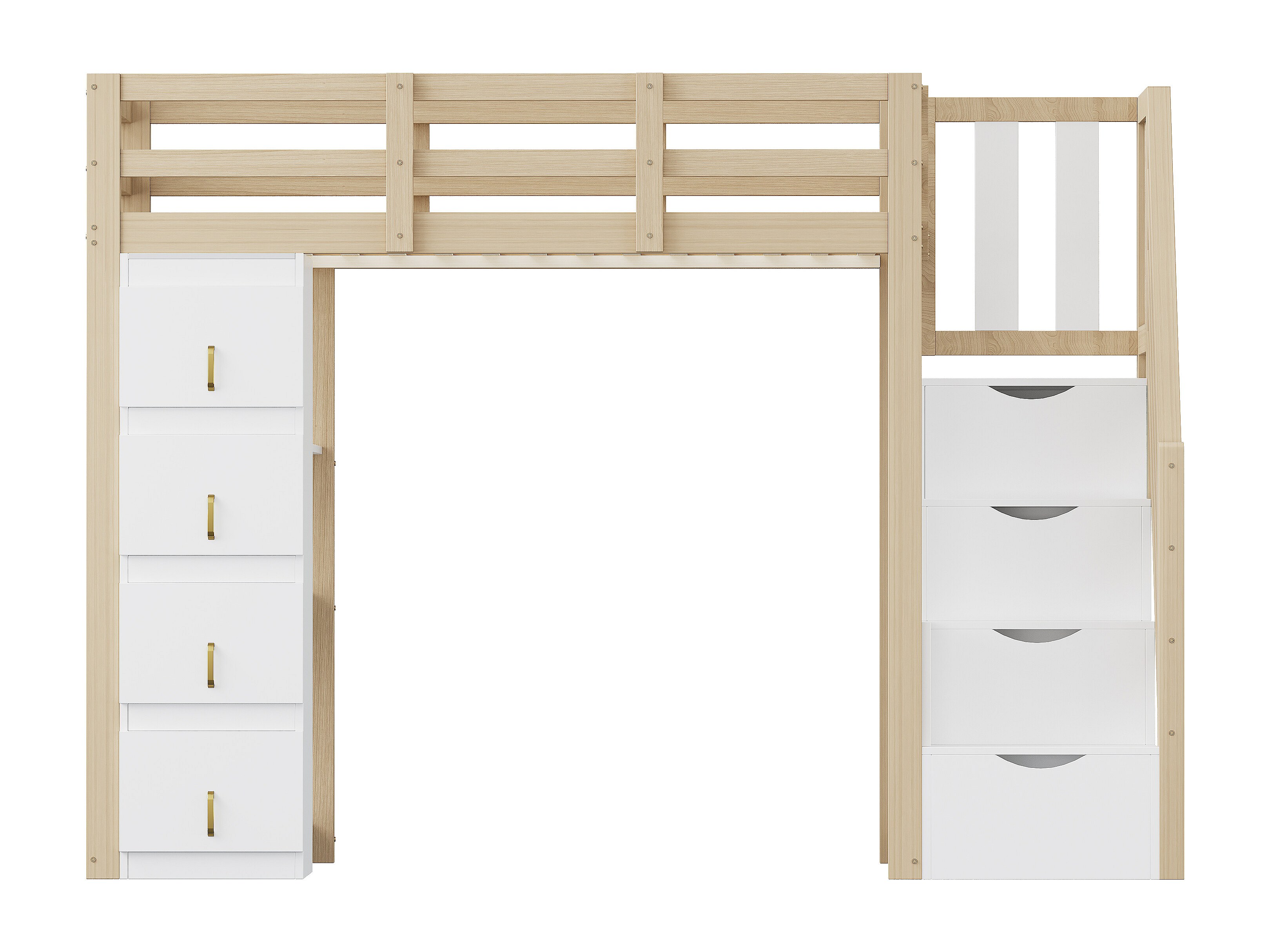 Lit mezzanine 90x200 cm avec tiroirs de rangement, étagères multiples, échelle sécurisée avec tiroirs, lit multifonction en bois massif