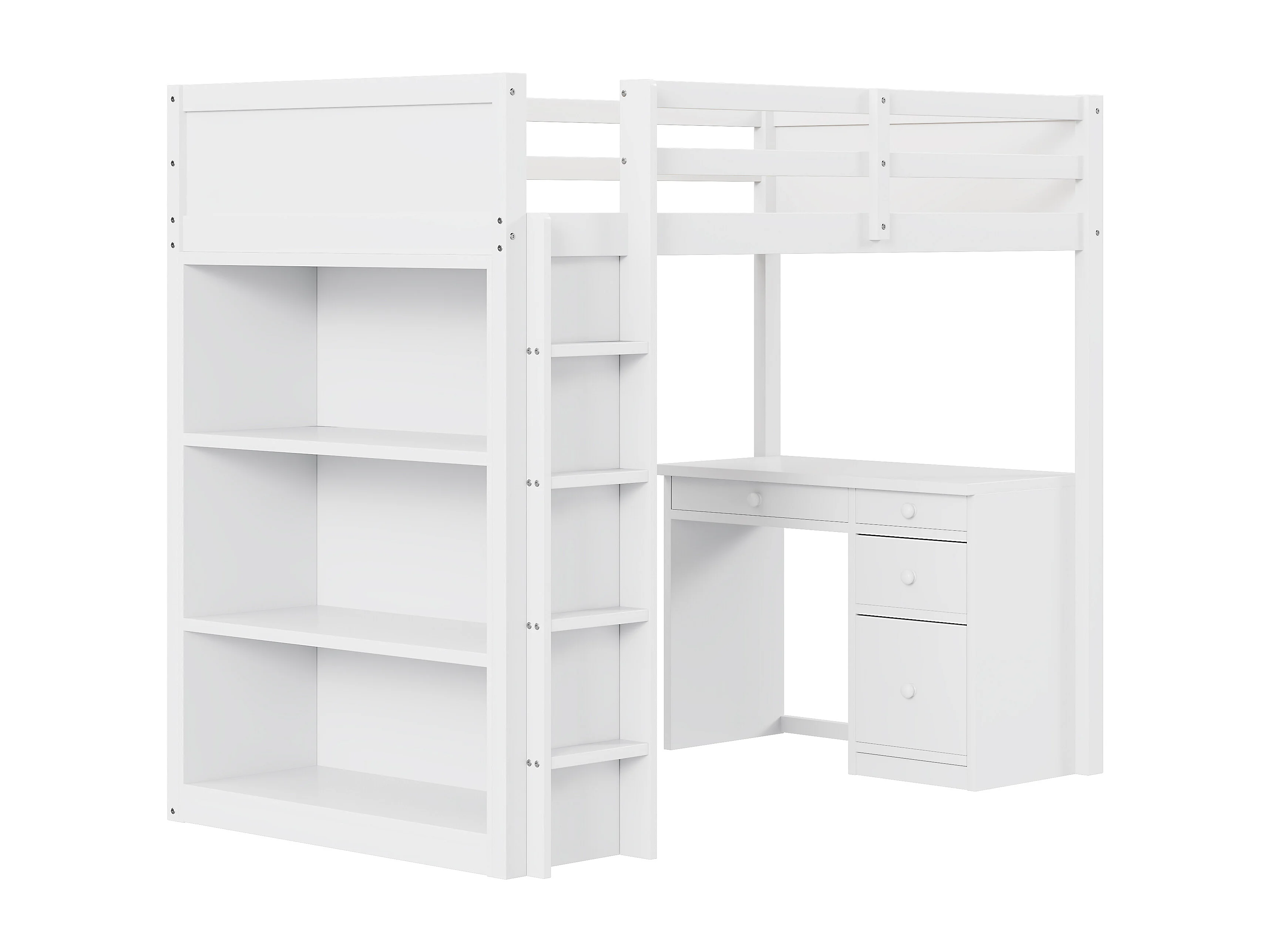 Lit mezzanine 90x200 cm blanc, avec armoires de rangement et bureau intégré, structure en bois multifonction