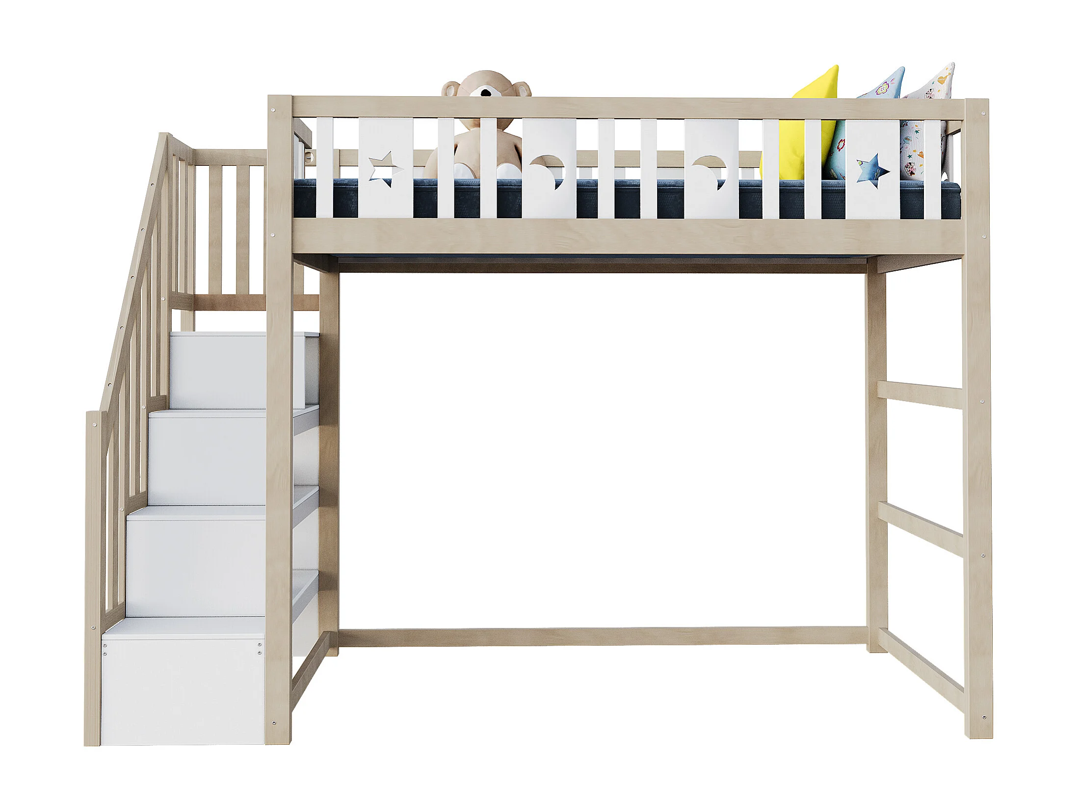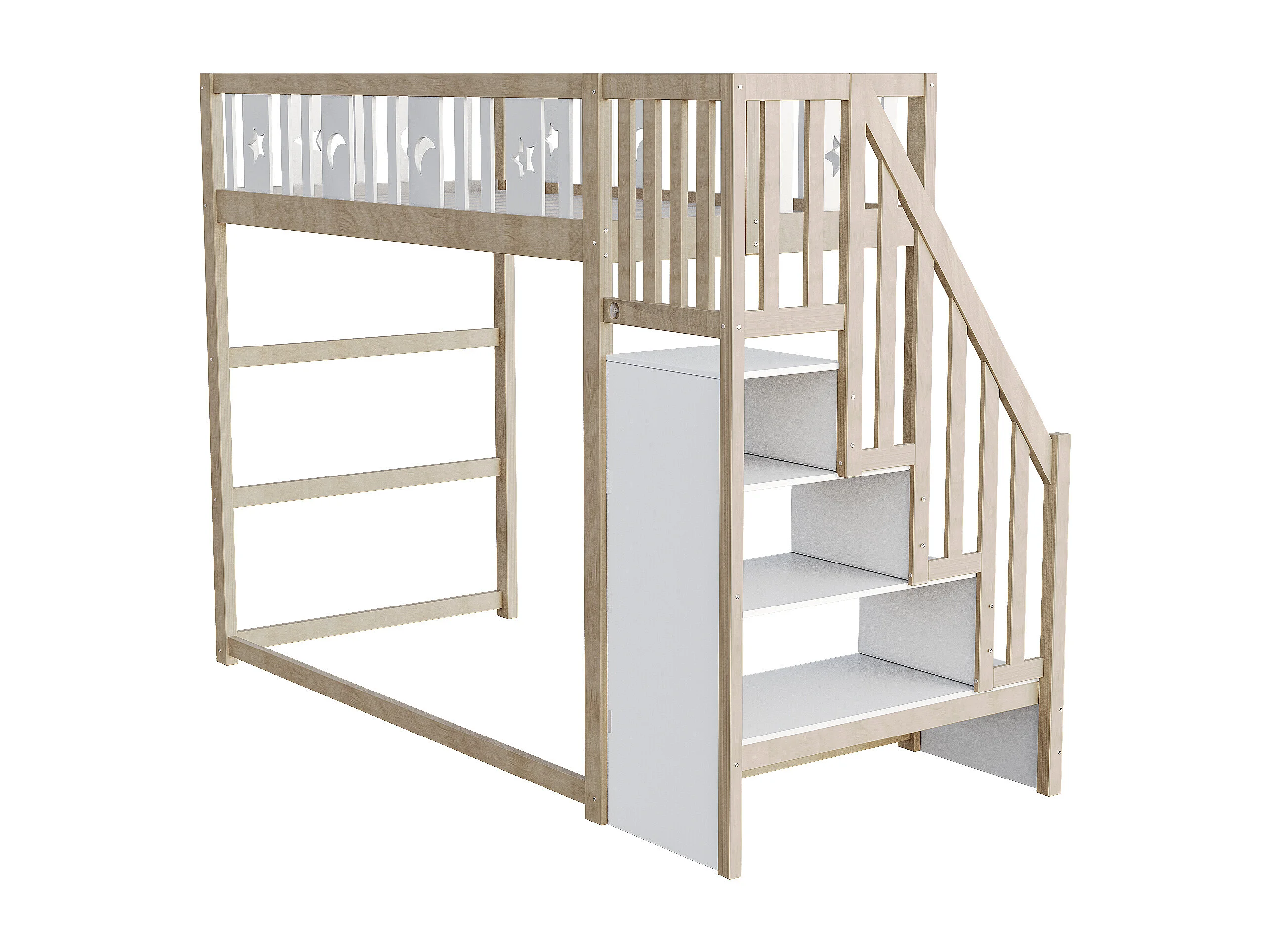 Lit mezzanine 90x200 cm, bois massif, échelle avec rangement, barrières de sécurité, décoration étoiles et lune, lit enfant, bois naturel