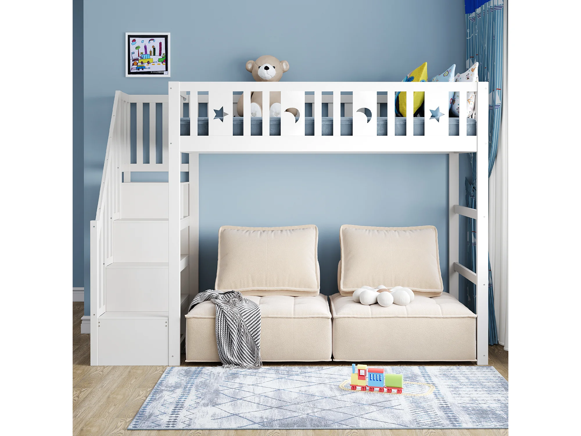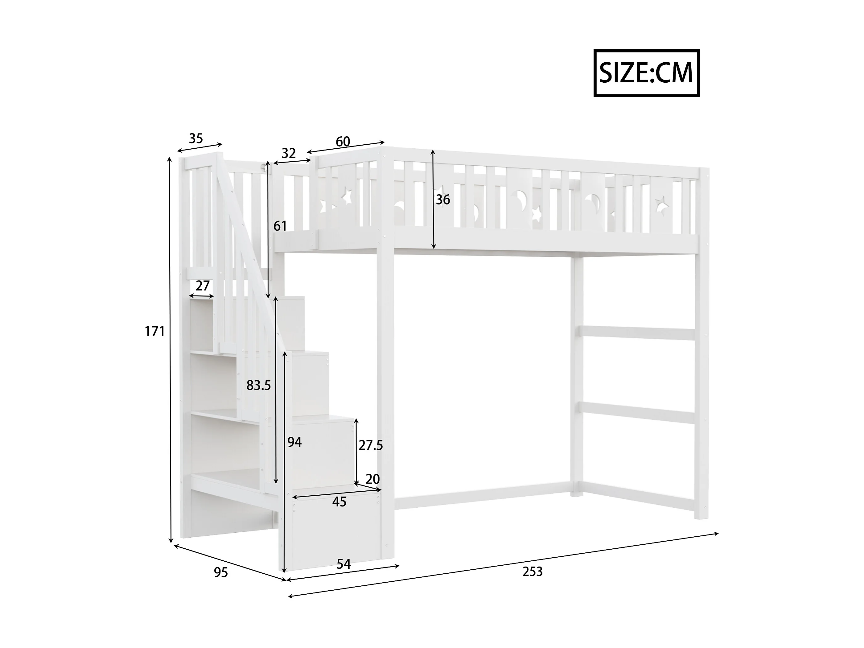 Lit mezzanine 90x200 cm, bois massif, échelle et barrières de sécurité, décoration étoiles et lune, tiroirs, lit enfant, blanc