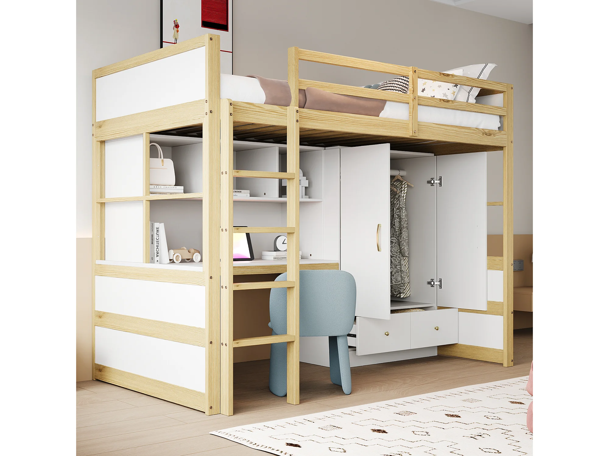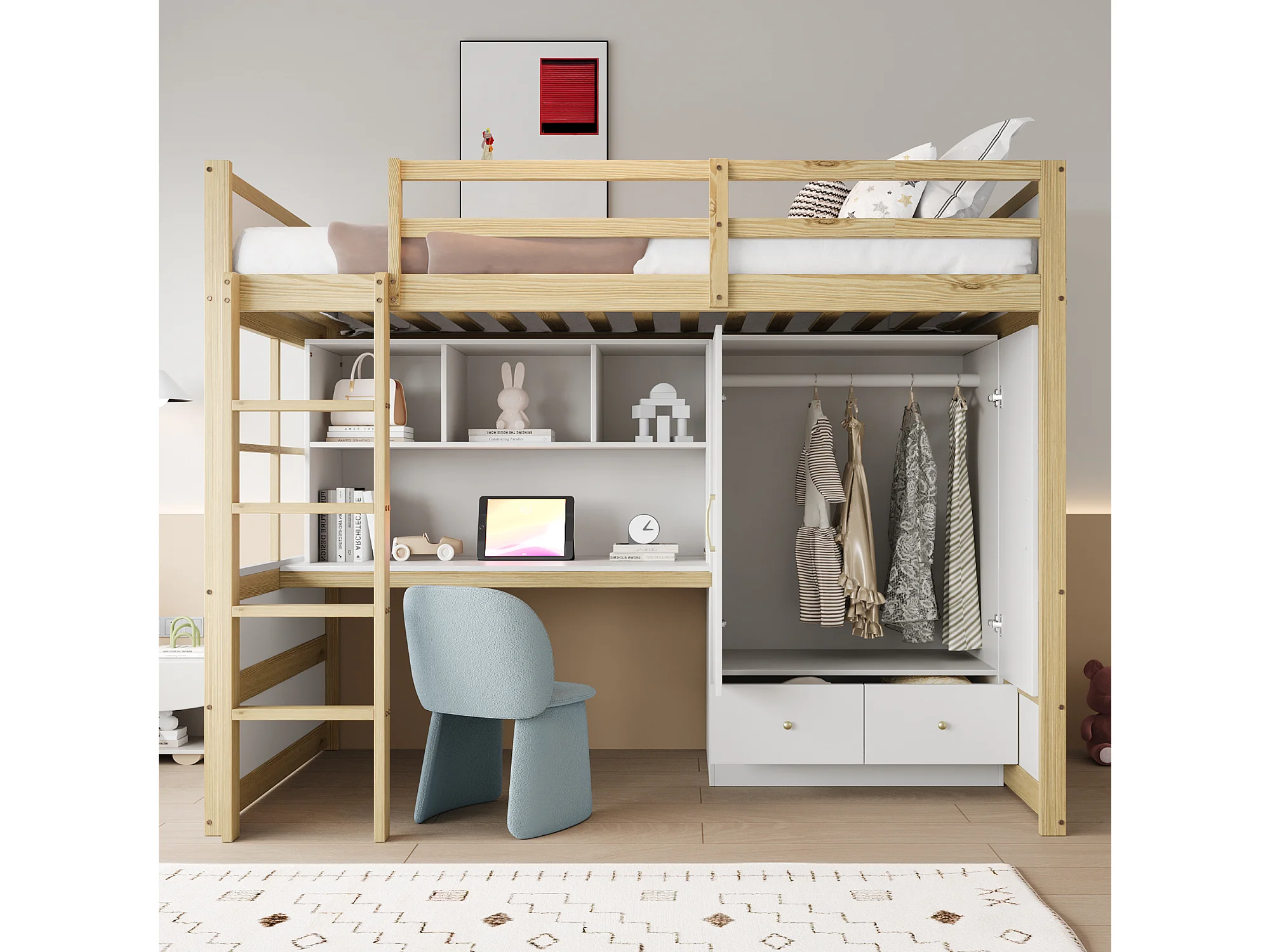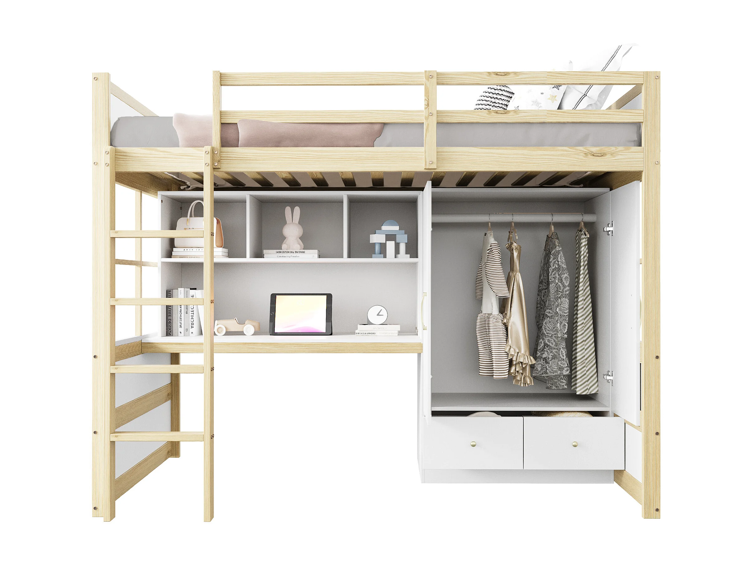 Lit mezzanine 90x200 cm bois naturel, avec bureau, armoire et tiroirs, lit enfant et adolescent pratique