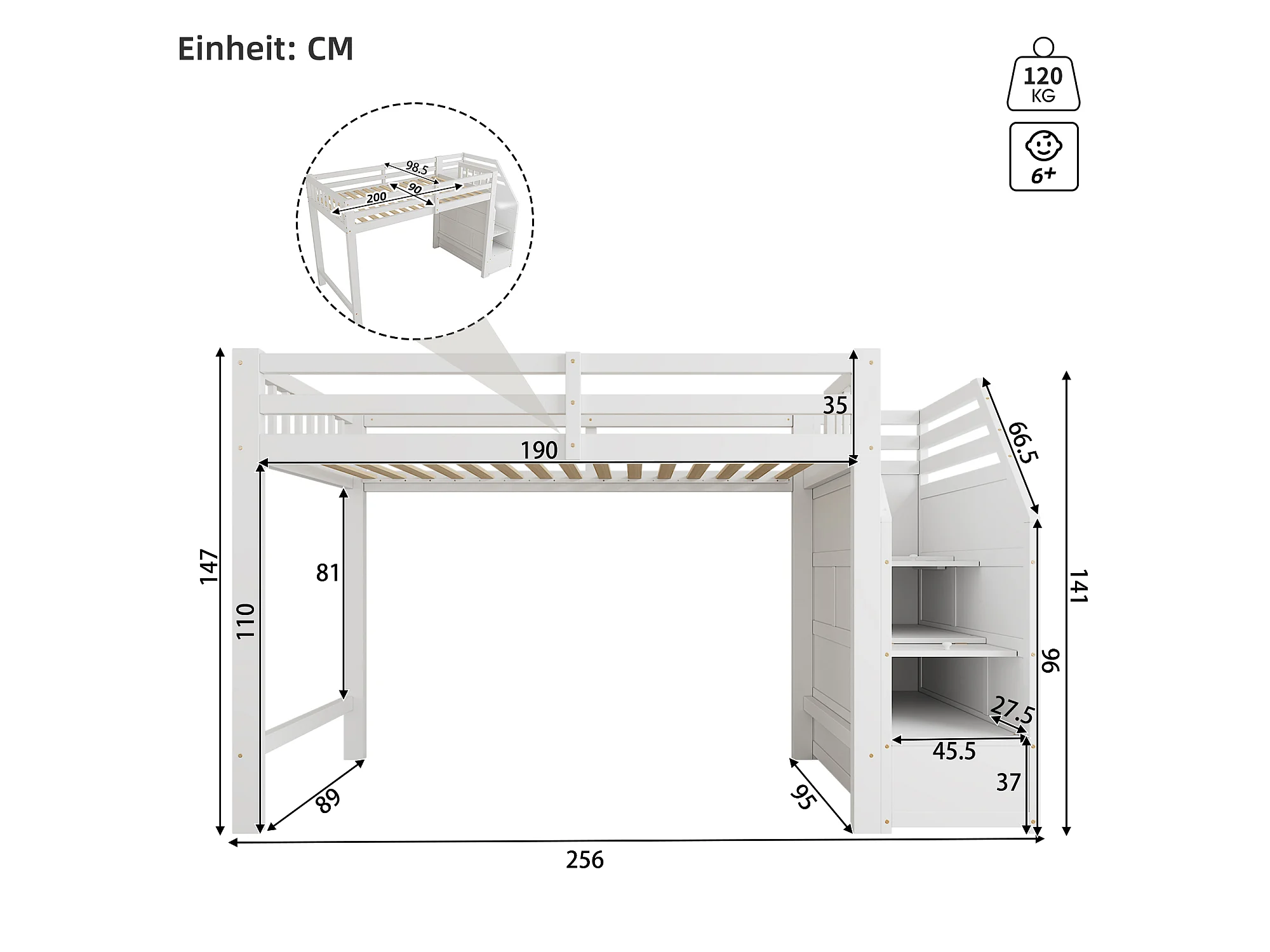 Lit mezzanine 90x200 cm en bois - avec barrières et escalier de rangement - Blanc