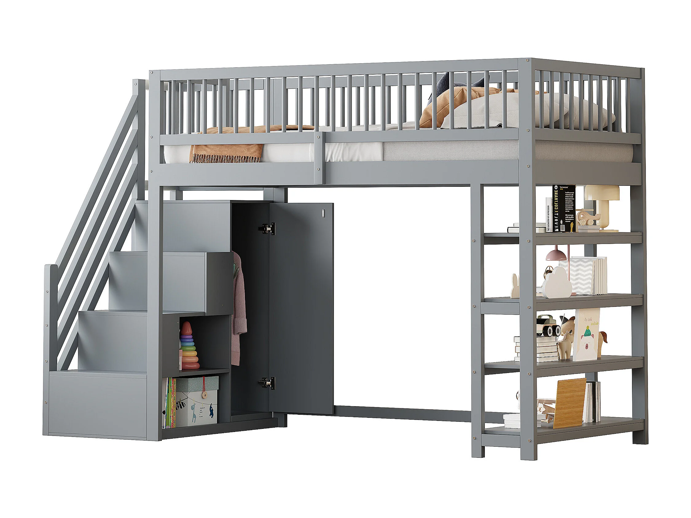 Lit mezzanine 90x200 cm en bois massif gris avec garde-corps sécurisé, rangements et armoire intégrée