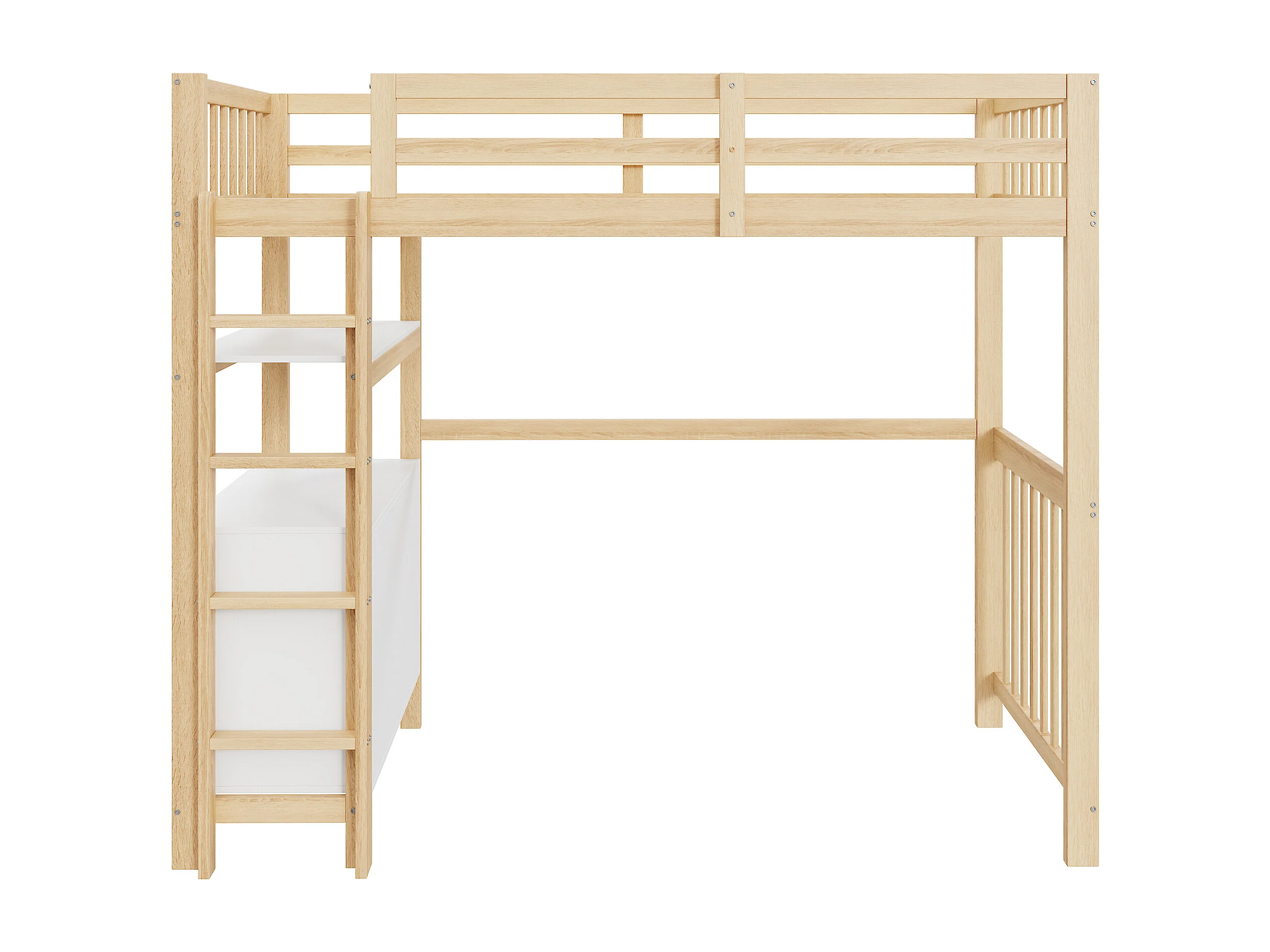 Lit mezzanine 90x200 cm en pin, échelle verticale sécurisée, tiroirs et étagères, garde-corps haut, bois naturel et blanc