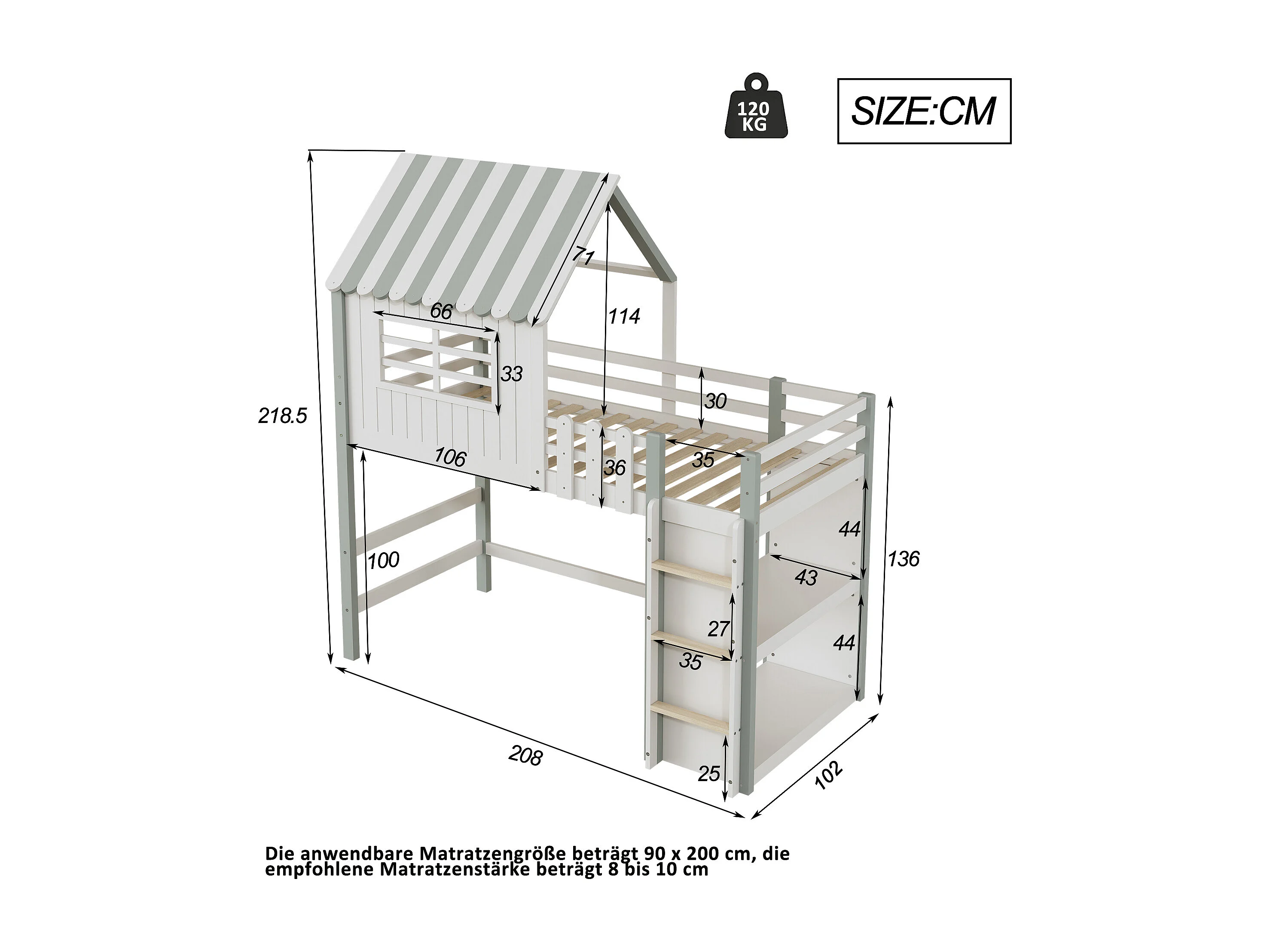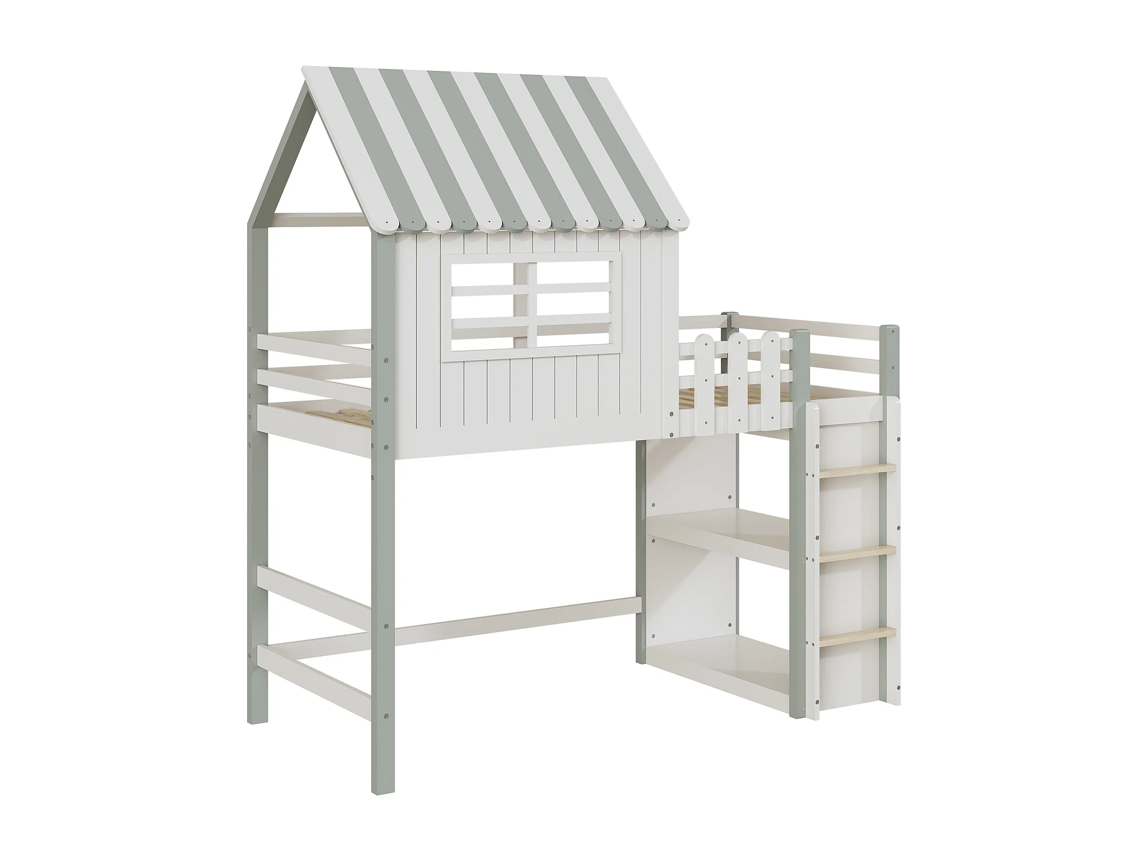 Lit mezzanine 90x200 cm, haut et bas, pour garçon et fille, toit, échelle de sécurité, rangement intégré, multifonction, vert