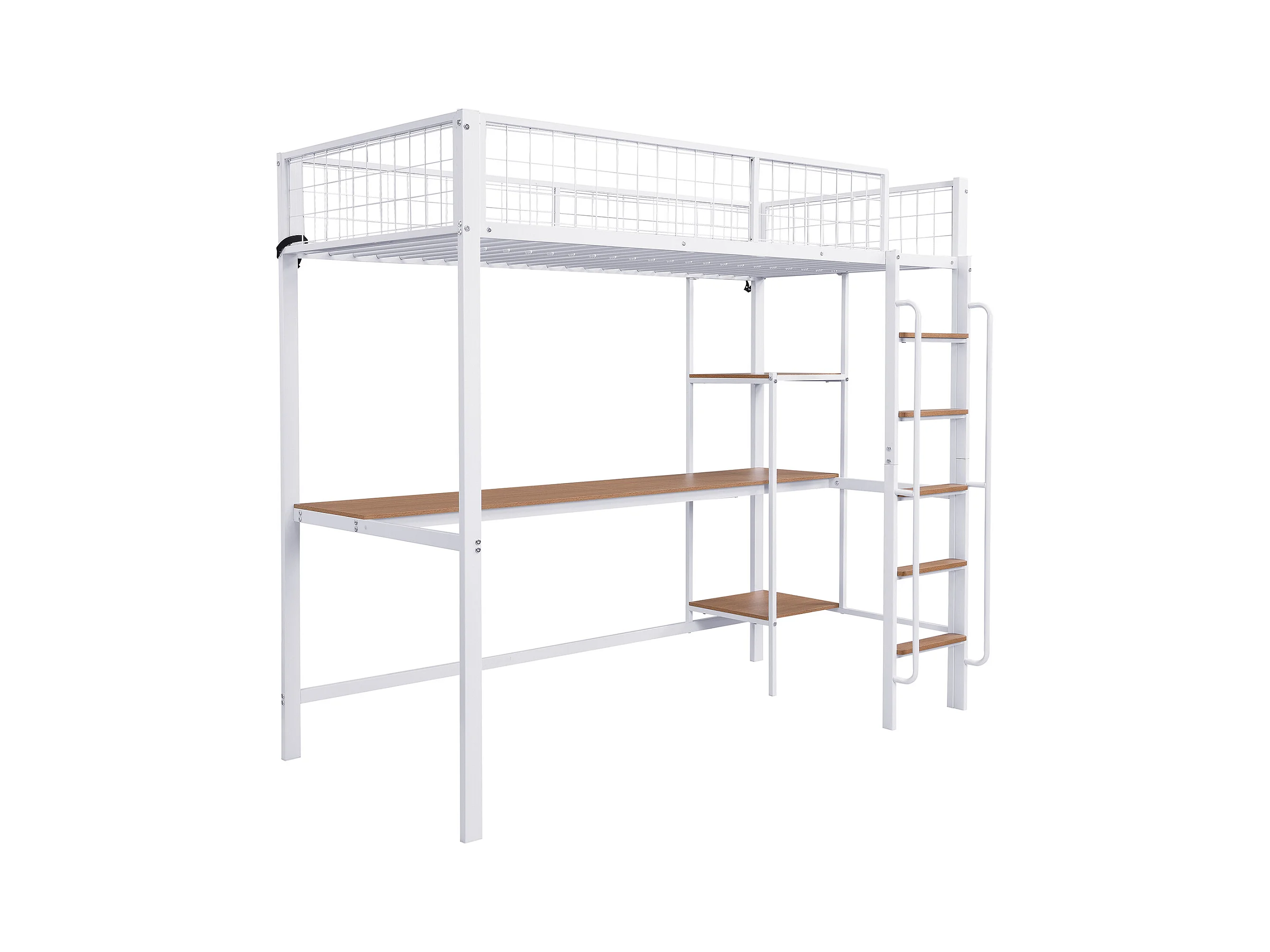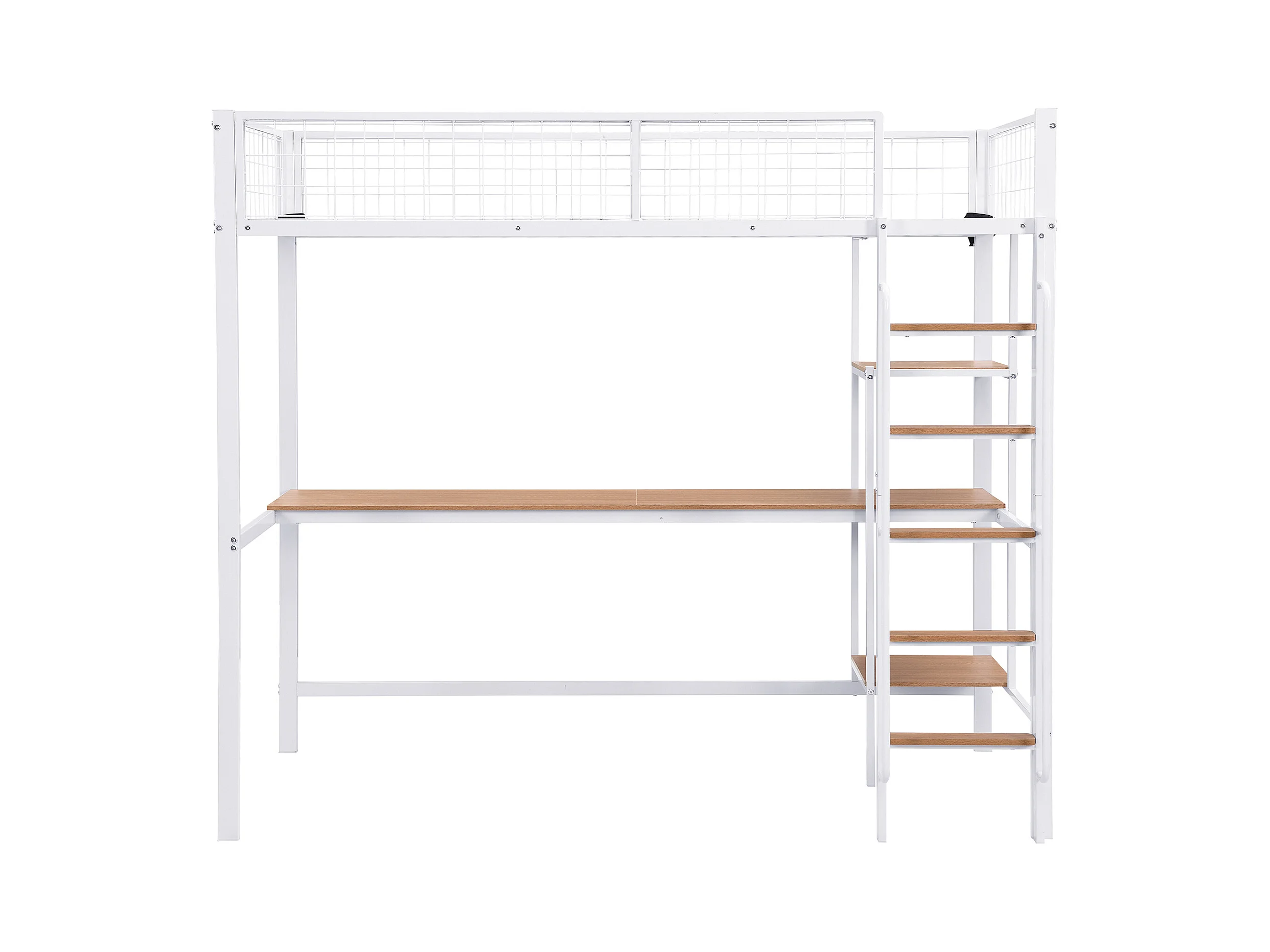 Lit mezzanine 90x200 cm - Lit adulte avec bureau et étagère - barrières de sécurité - blanc et naturel