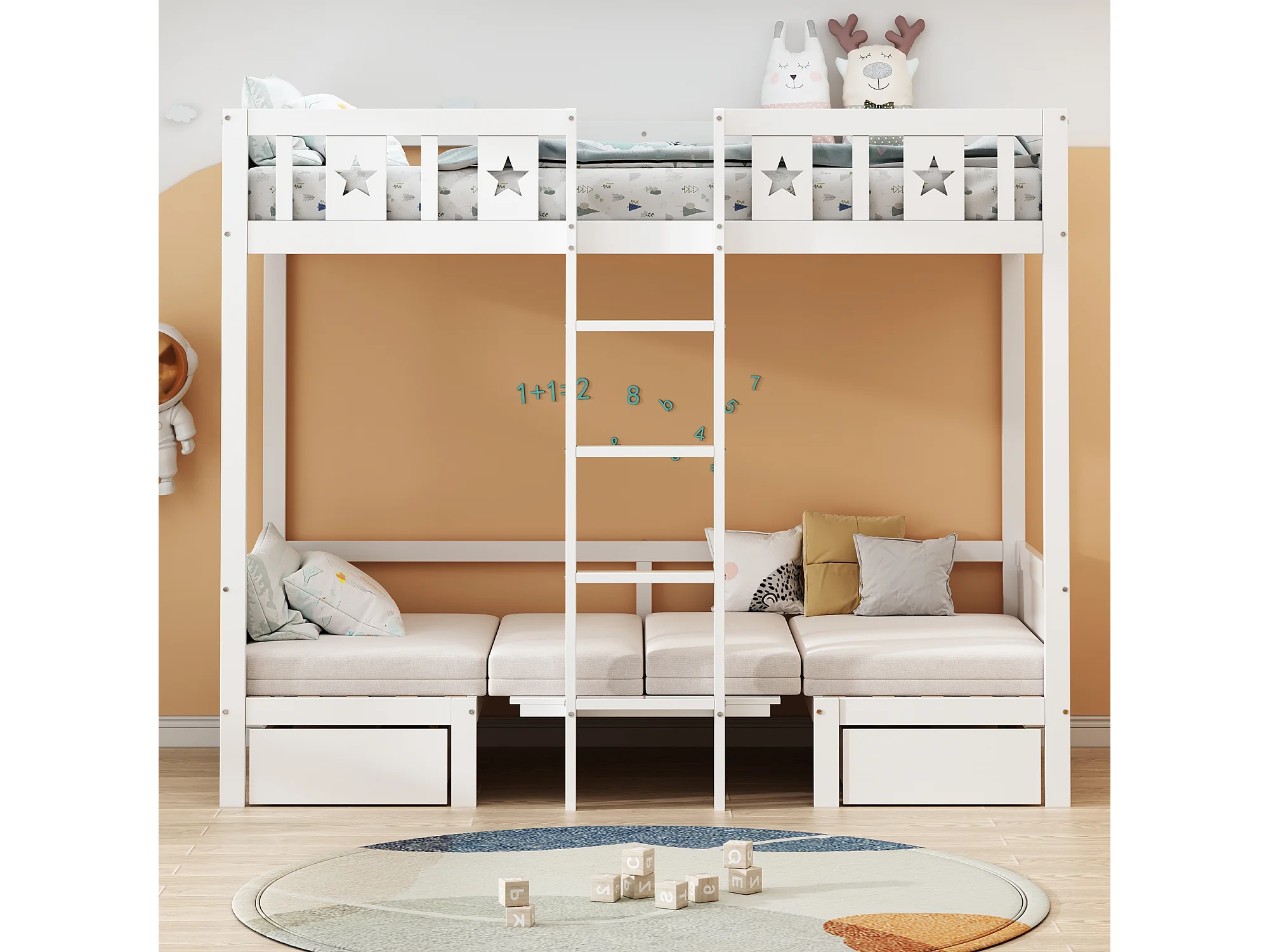 Lit mezzanine 90x200 cm, lit/bureau 2 en 1, matelassé, 2 grands tiroirs, cadre avec échelle, bois, blanc