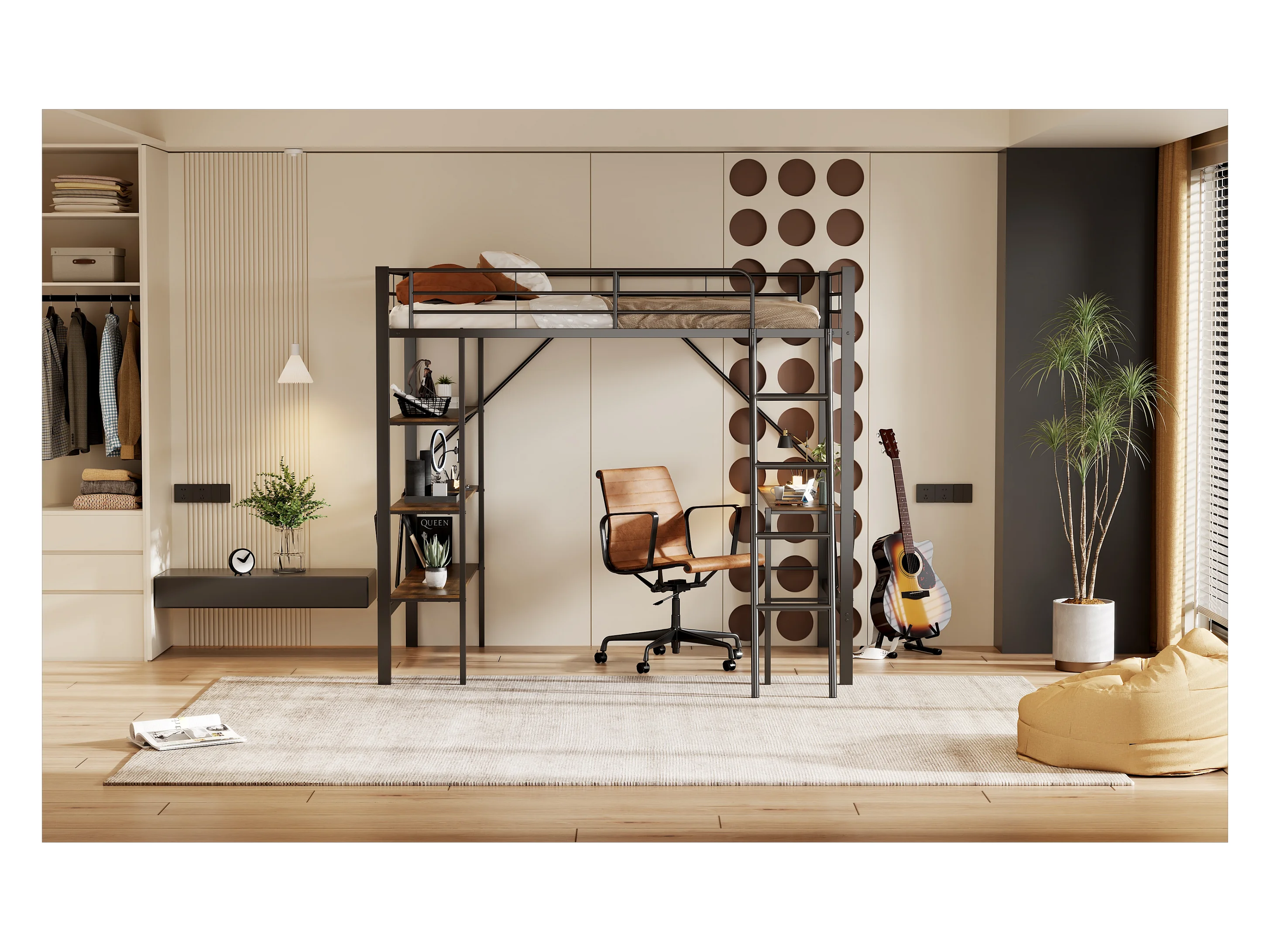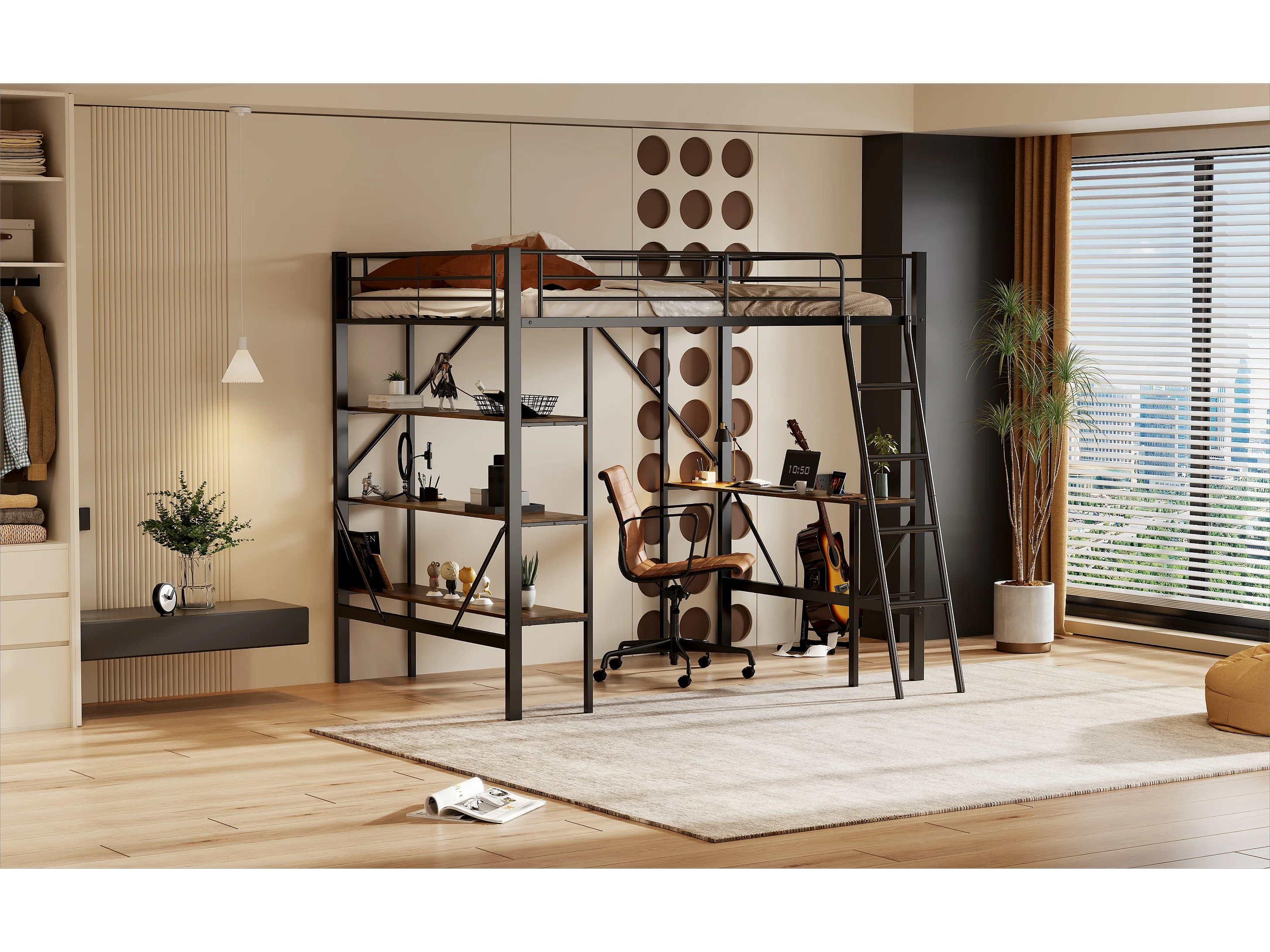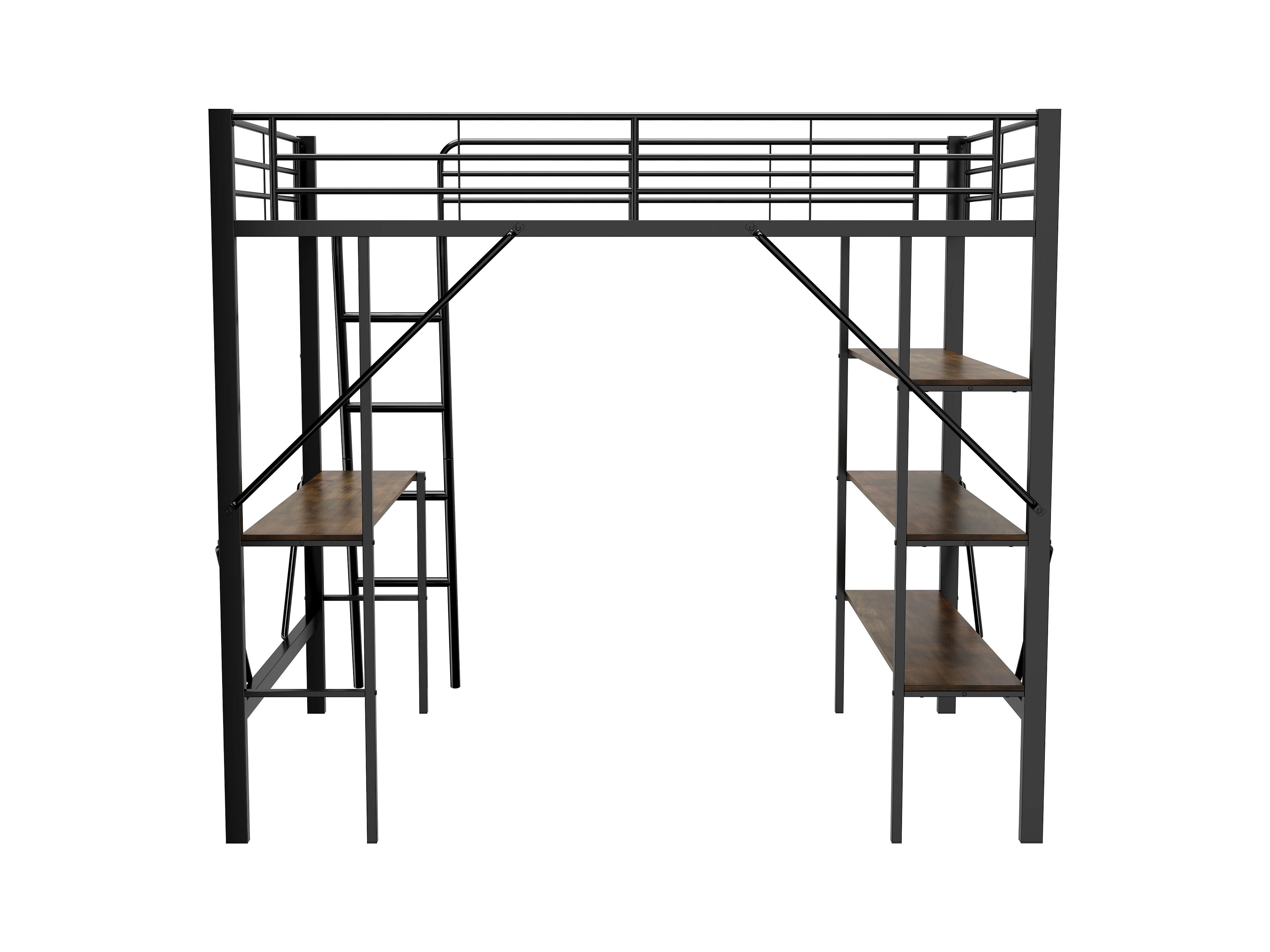 Lit mezzanine 90x200 cm noir en métal avec bureau et étagères, espace de travail pratique pour jeunes adultes