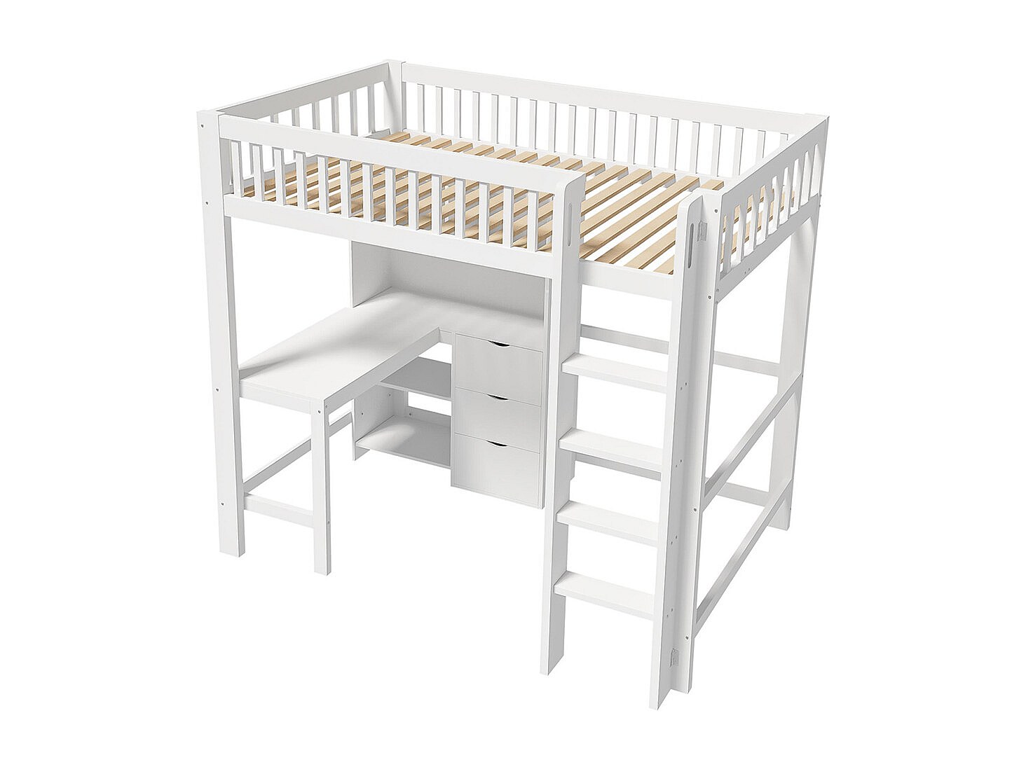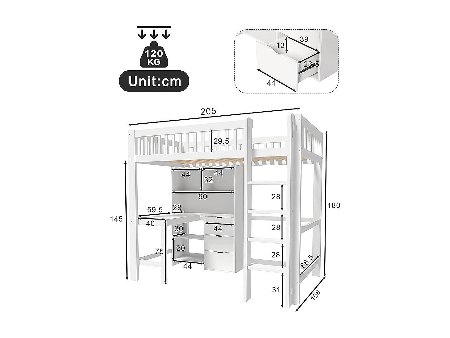 Lit mezzanine 90x200 cm rangement échelle bureau 3 tiroirs sans matelas blanc