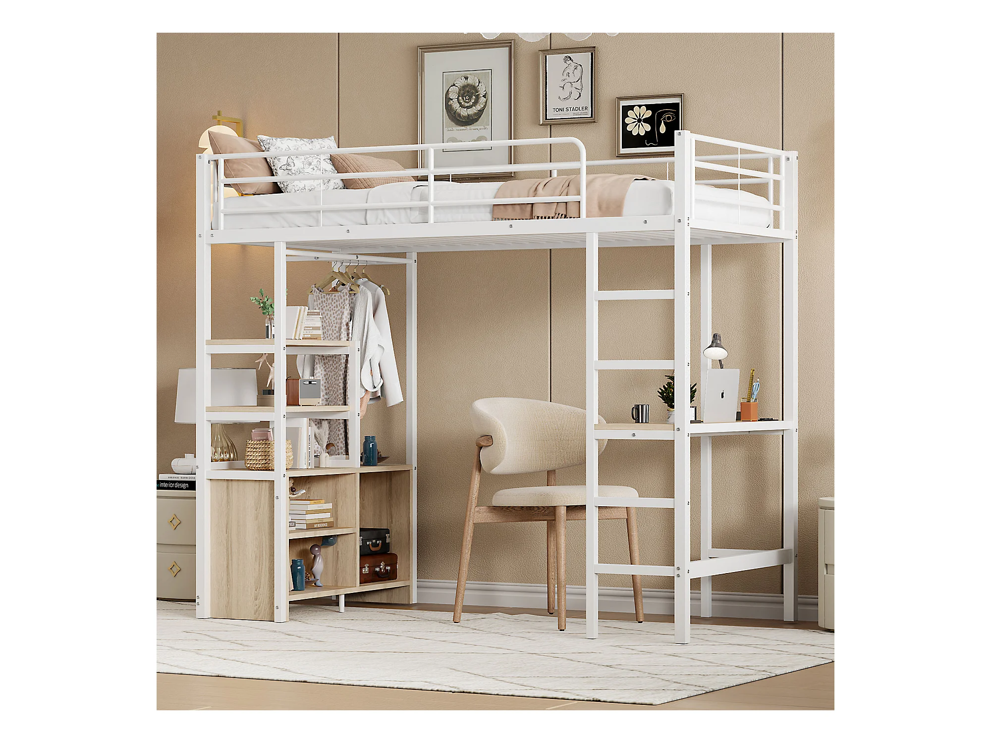Lit mezzanine 90x200 cm, sans matelas, bureau intégré, prises USB et électrique, plusieurs étagères, rangement ouvert, garde-corps et échelle, cadre métal, Blanc