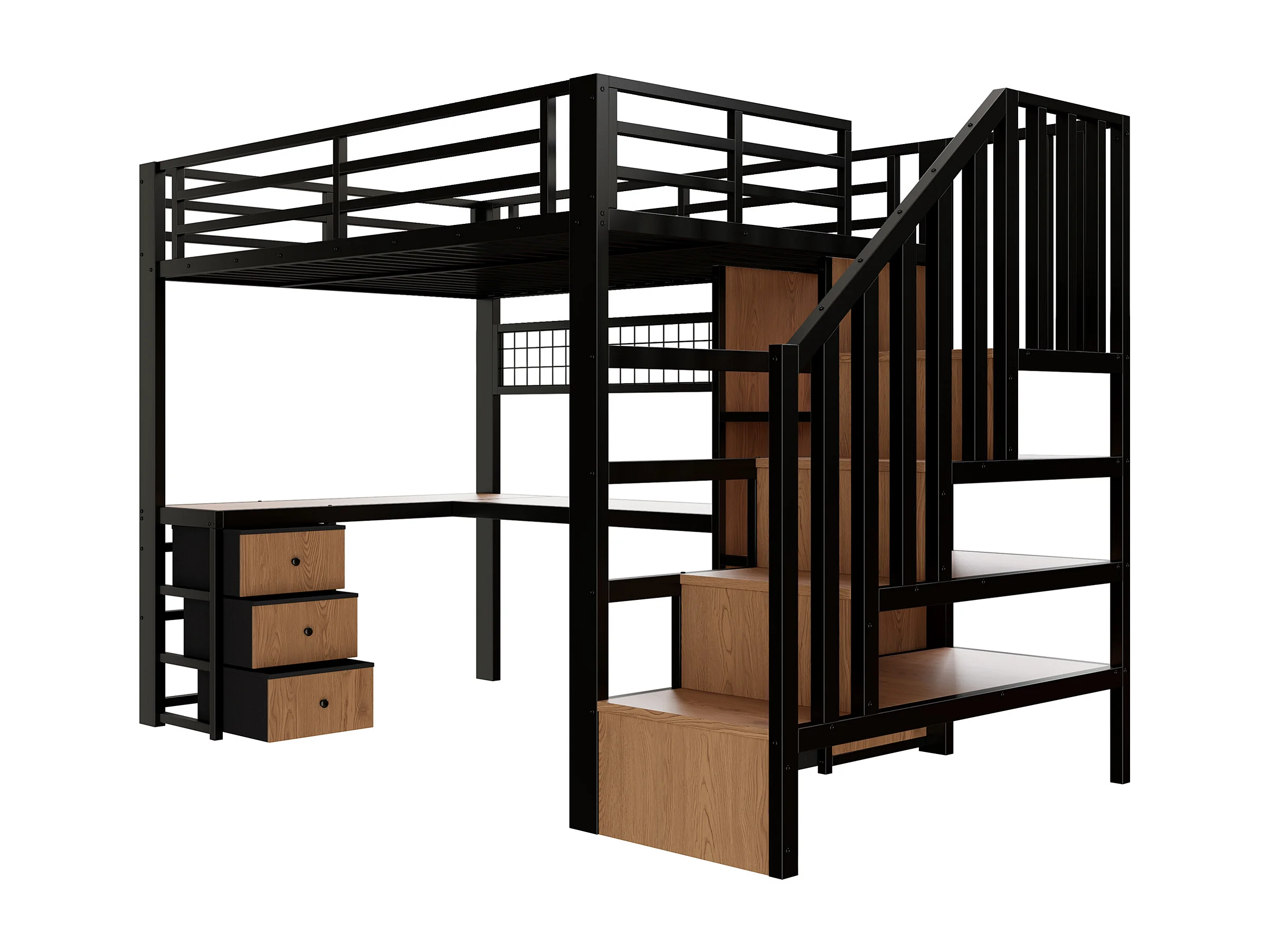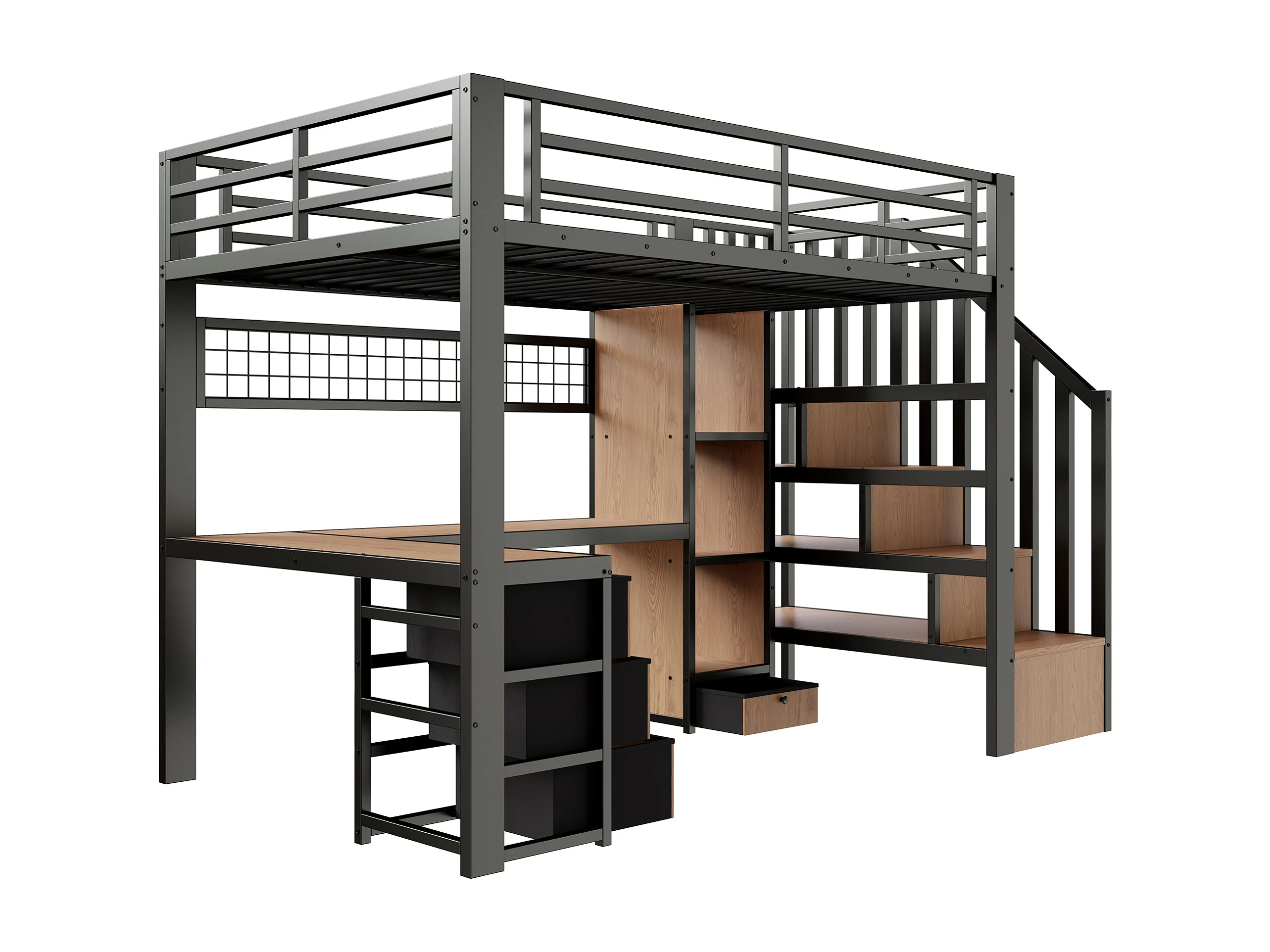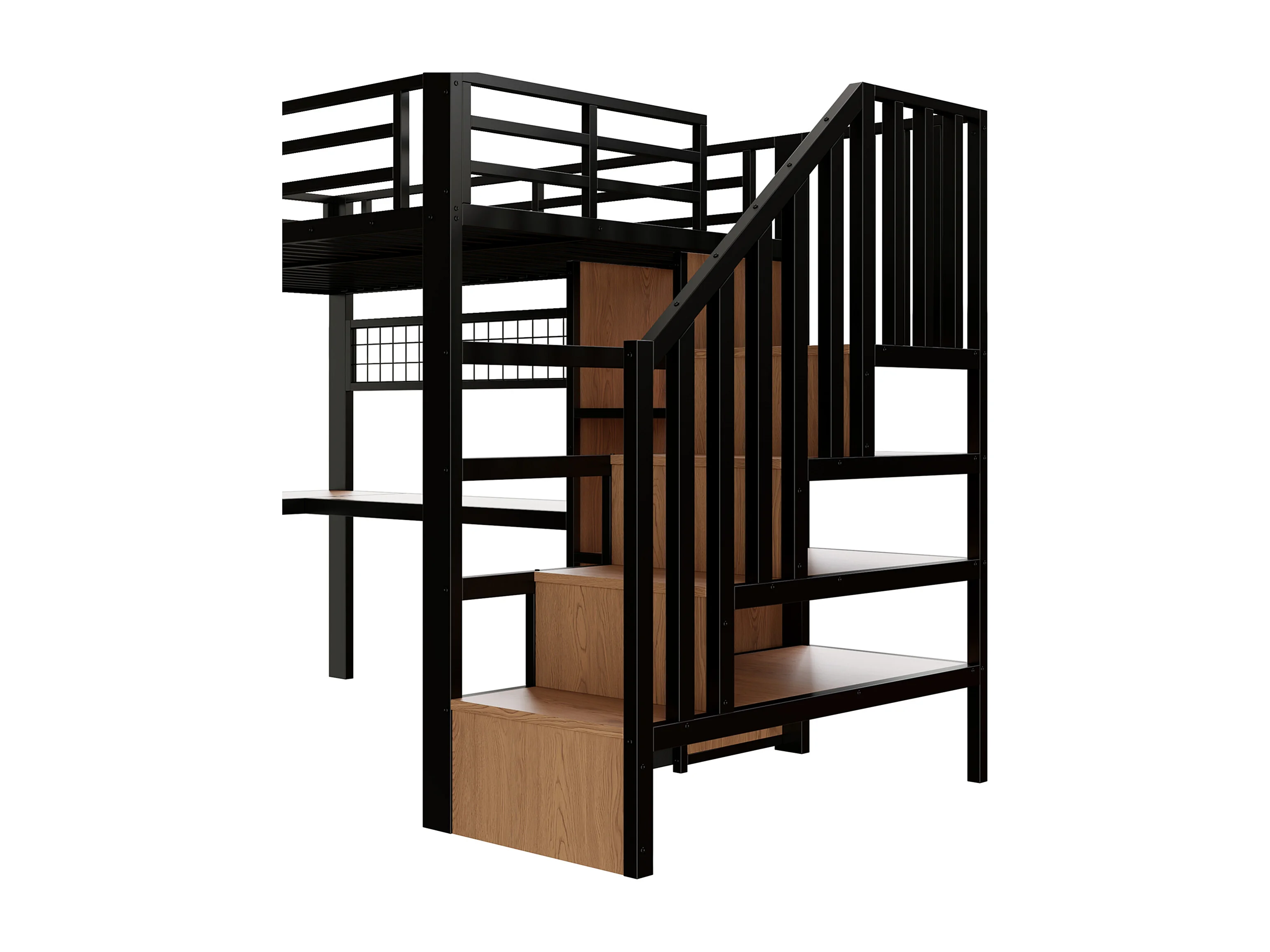 Lit mezzanine 90x200 cm - Structure en fer - Compartiments de rangement - 4 tiroirs - Éclairage LED - Bureau - Escalier - noir (matelas non inclus)
