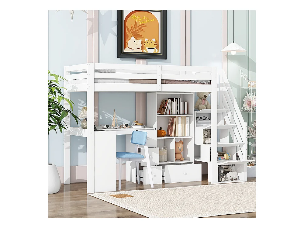 Lit mezzanine 90x200 garde-corps bureau tiroirs armoire de rangement ouverte escabeau escamotable plusieurs étagères Blanc