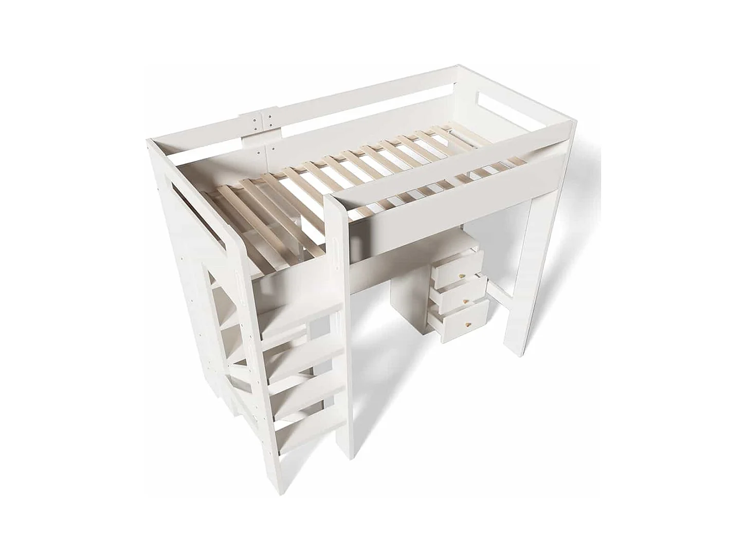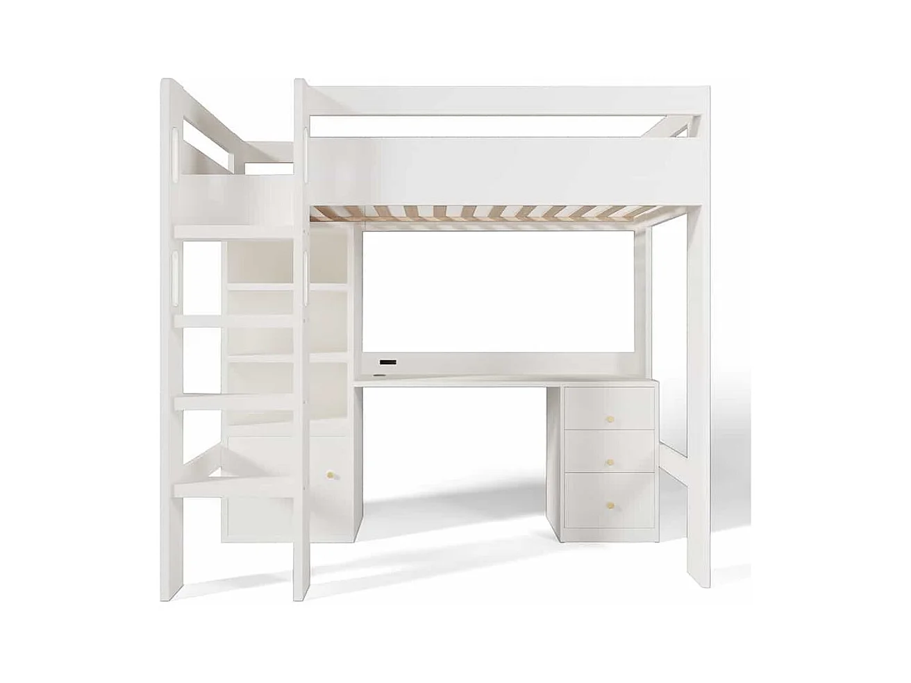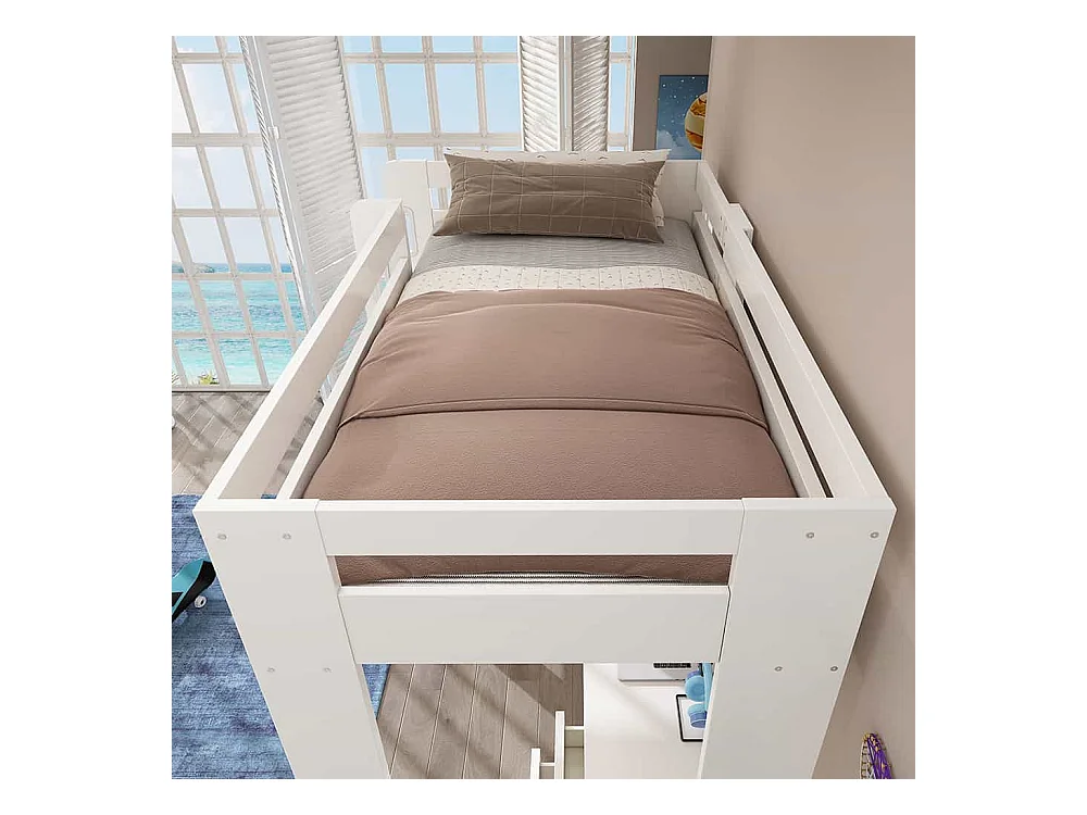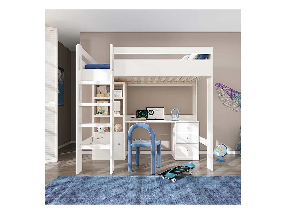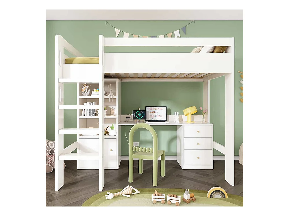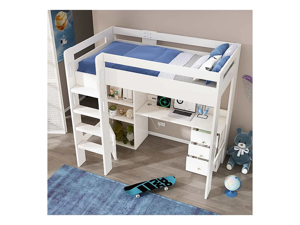 Lit mezzanine 90x200 pour enfants avec bureau port USB-C armoire et classeur lit une place pour adolescents avec escalier blanc