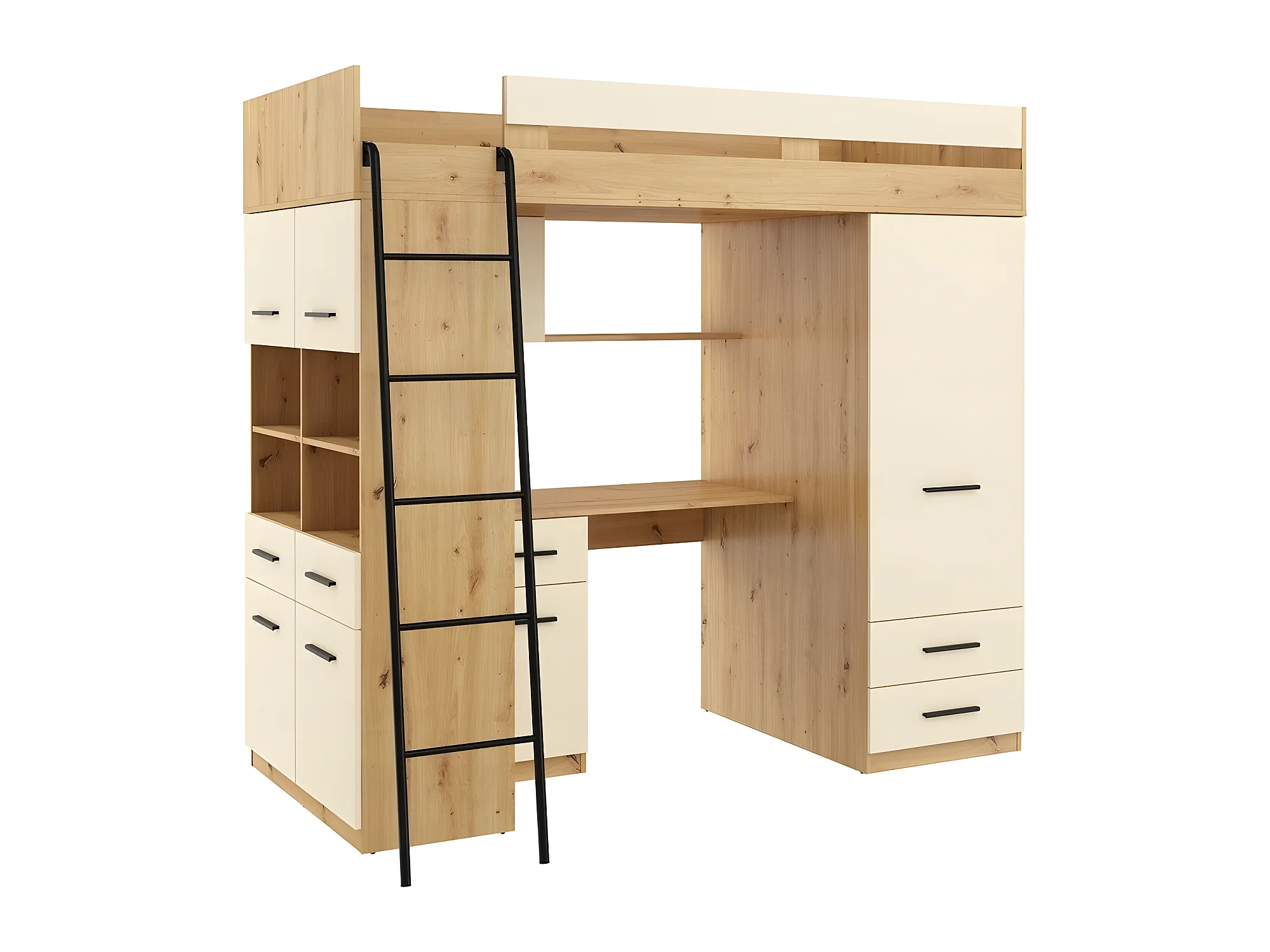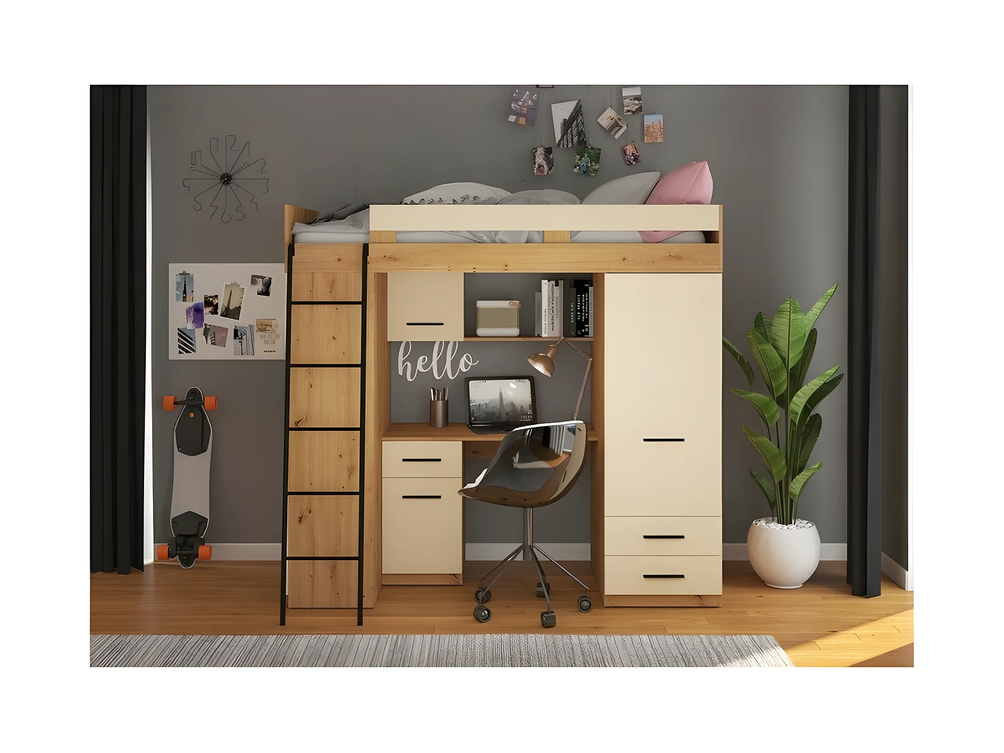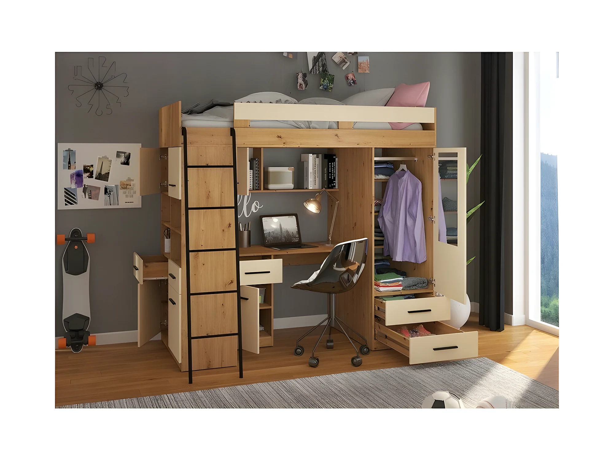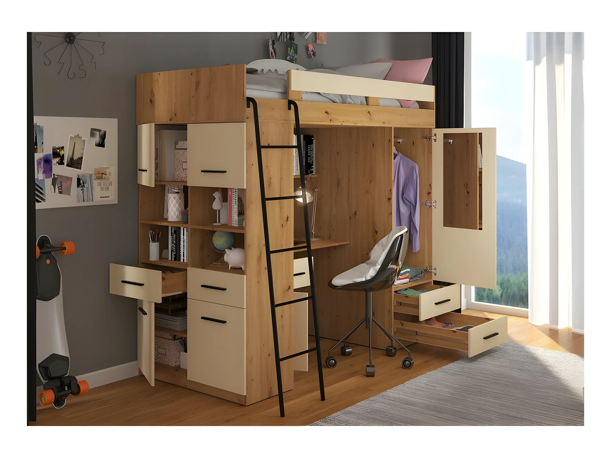 Lit Mezzanine 90x200cm avec échelle Placard, Bureau, bibliothèque et beaucoup d'étagéres LEVI L Chêne artisan/Crème