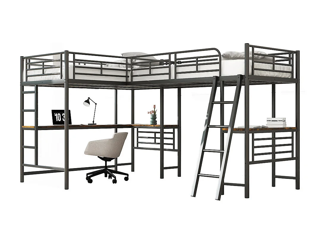 Lit mezzanine 90x200cm, deux lits superposés, table sous le lit, double escalier, rambarde haute, métal, noir, sans matelas