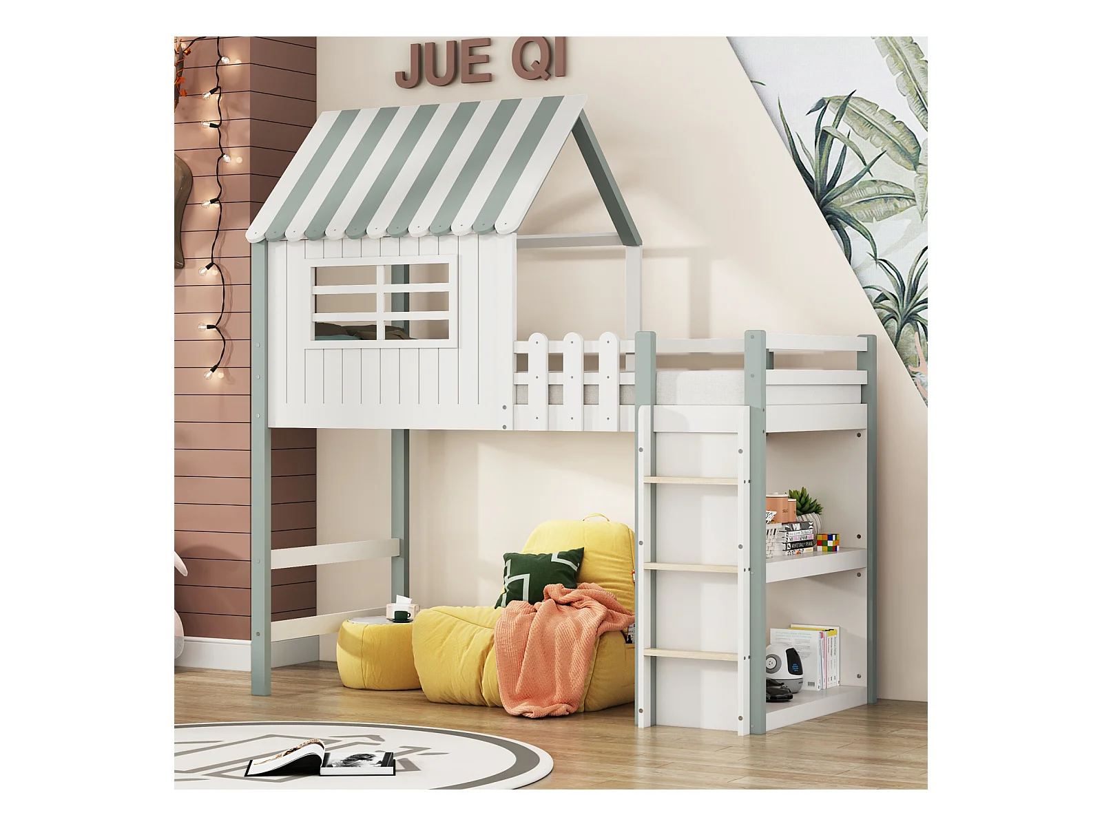Lit mezzanine 90x200cm, lit cabane d'enfant en forme de toit avec échelle, étagère de rangement, en bois massif avec sommier à lattes, vert
